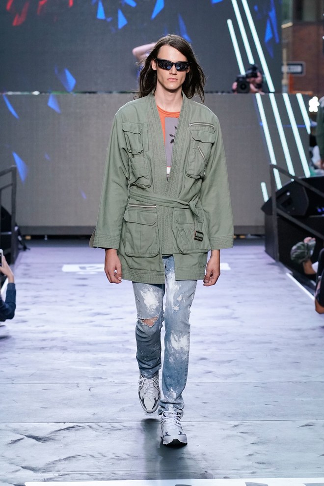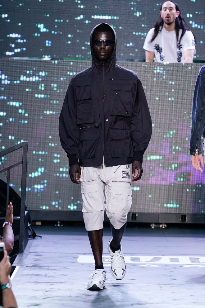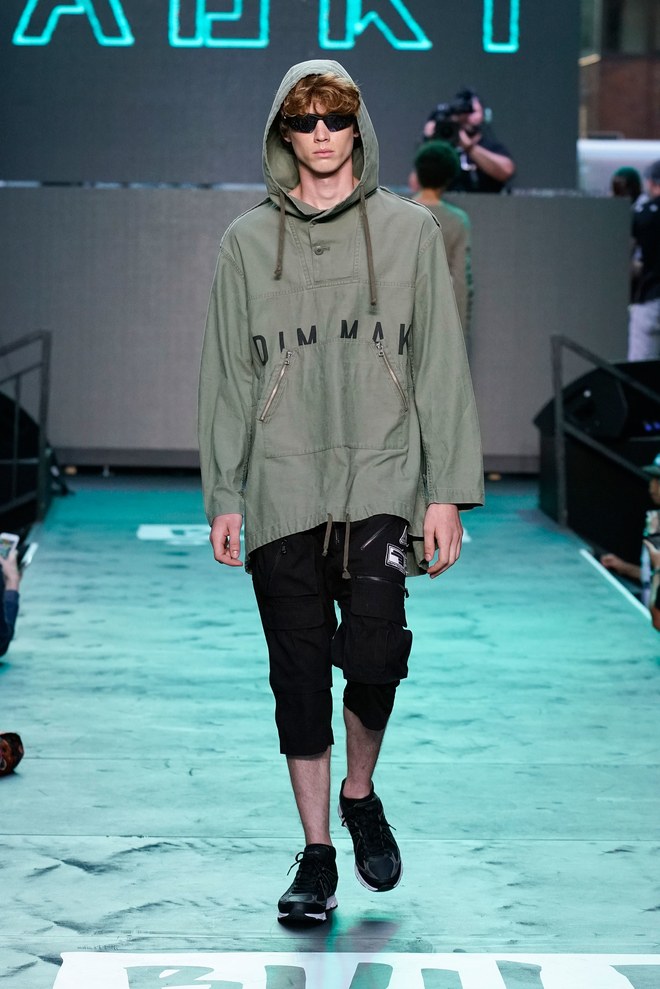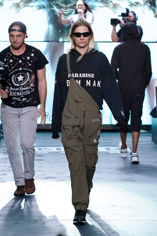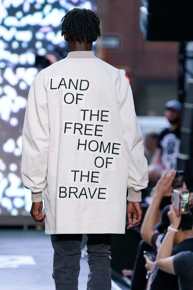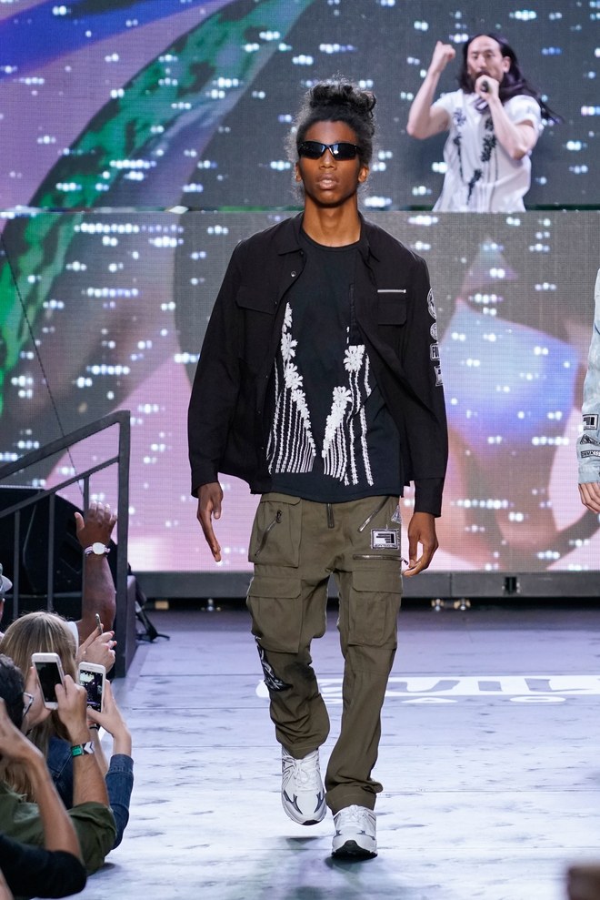 To get things going, a marching band hyped the crowd—as the line disbanded, Aoki hit the turntables and the first model exited. “This season started off with the idea of the world we’re living in right now. It’s chaotic, there’s mayhem. The collection is about trying to find hope inside it—paradise found, living in this dichotomous reality,” said the designer. Flak jackets, hoodies, and t-shirts—with cyborg palm trees, featuring standard fronds but with barbed-wire trunks—captured that intent. Some pieces had the phrase, “Land of the free, home of the brave,” patch-worked across the back. “That idea is missing now in the U.S.,” said Aoki. (Worth noting: He has brought his production and design studio over to the States—Las Vegas, in particular, where he lives—from Japan.)