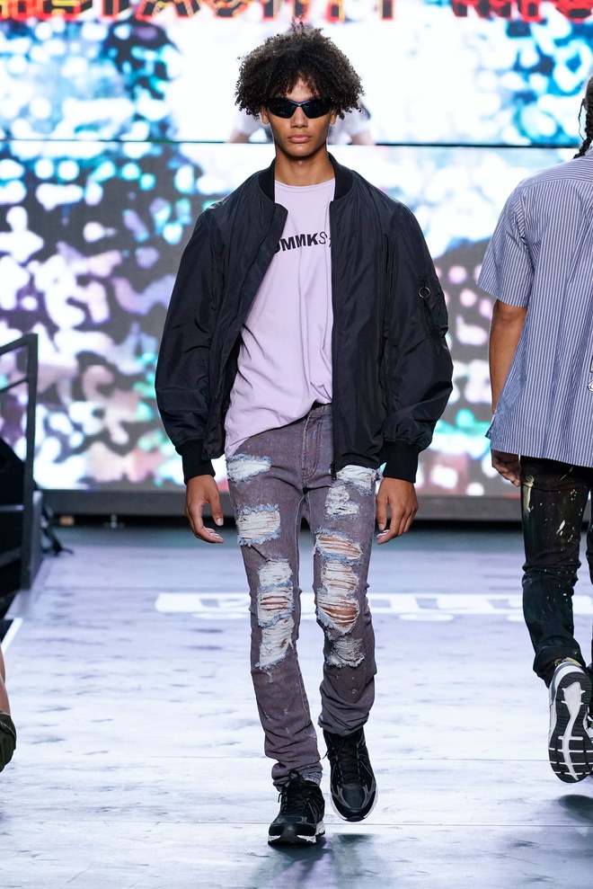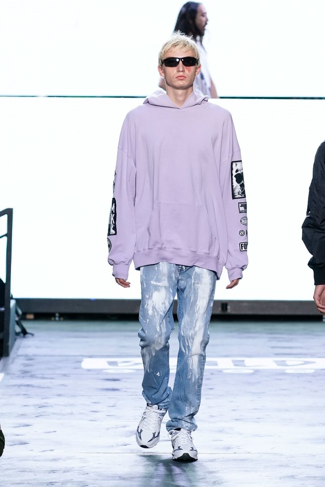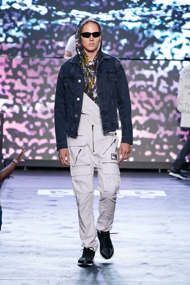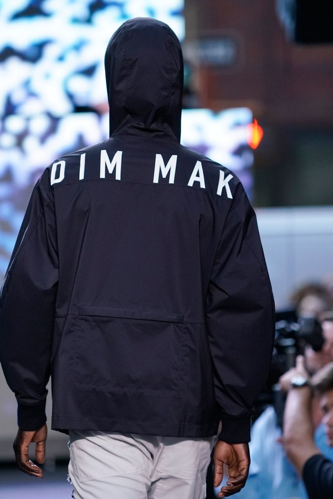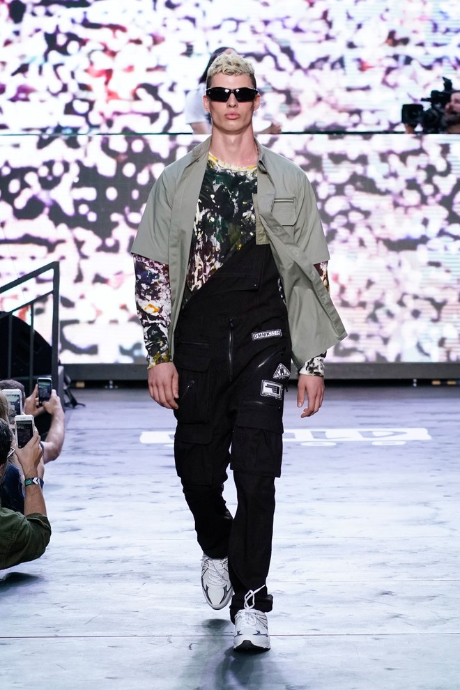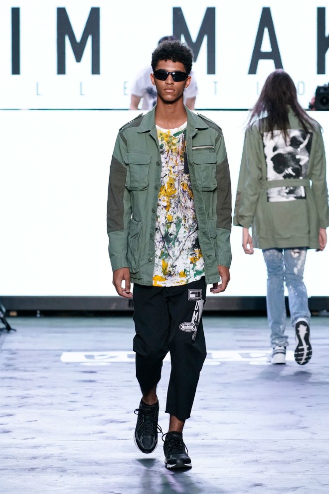 To get things going, a marching band hyped the crowd—as the line disbanded, Aoki hit the turntables and the first model exited. “This season started off with the idea of the world we’re living in right now. It’s chaotic, there’s mayhem. The collection is about trying to find hope inside it—paradise found, living in this dichotomous reality,” said the designer. Flak jackets, hoodies, and t-shirts—with cyborg palm trees, featuring standard fronds but with barbed-wire trunks—captured that intent. Some pieces had the phrase, “Land of the free, home of the brave,” patch-worked across the back. “That idea is missing now in the U.S.,” said Aoki. (Worth noting: He has brought his production and design studio over to the States—Las Vegas, in particular, where he lives—from Japan.)