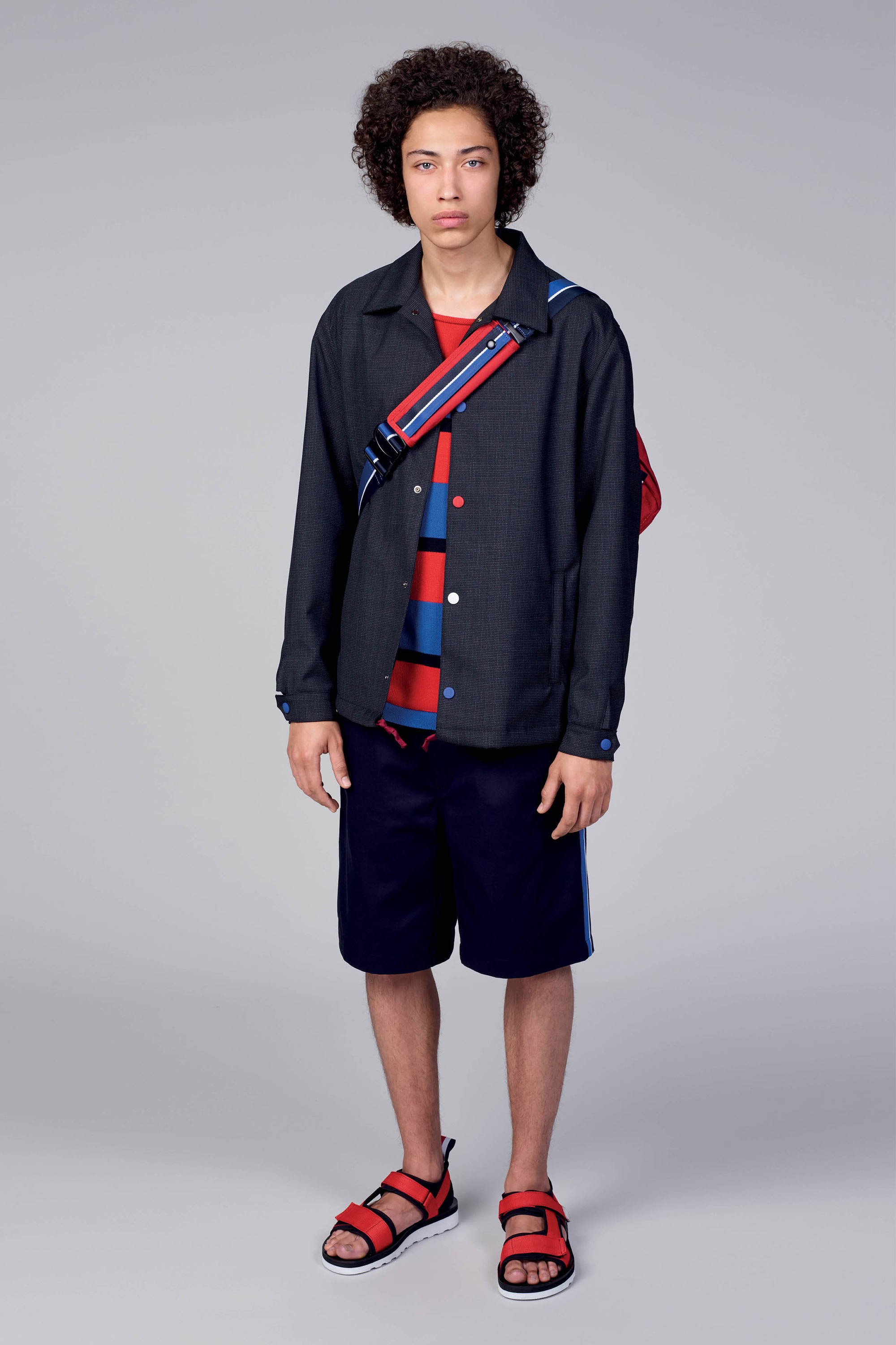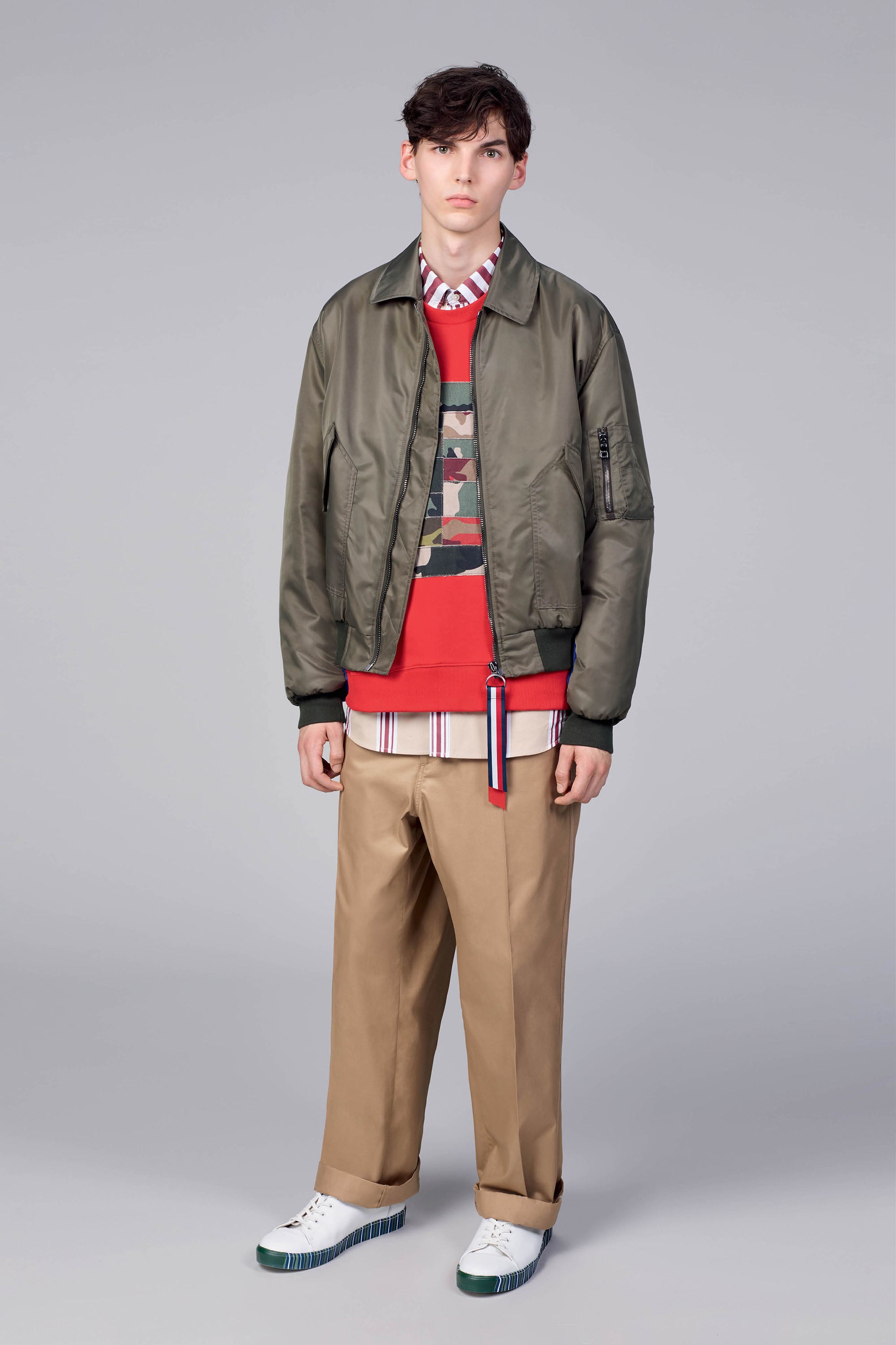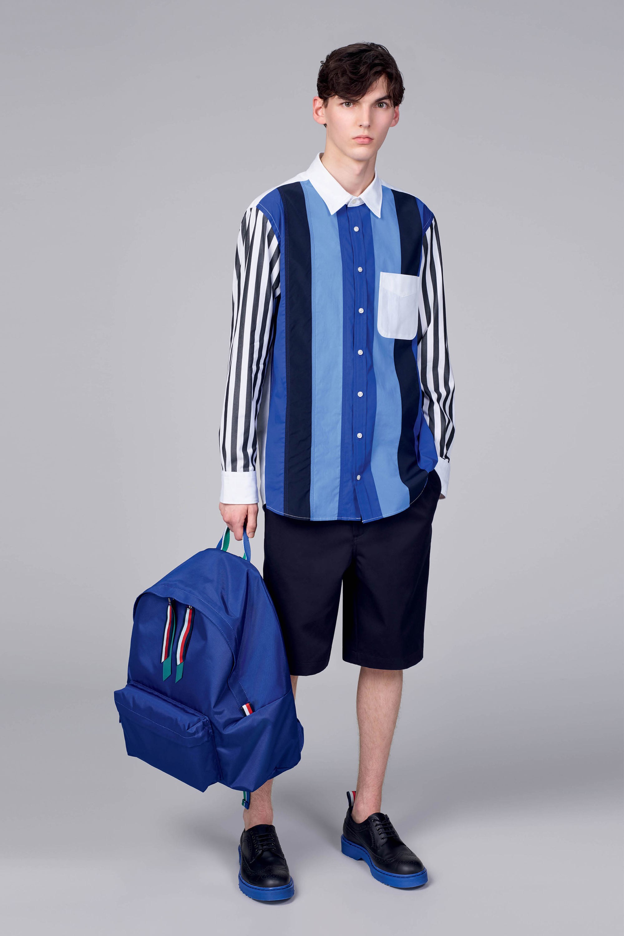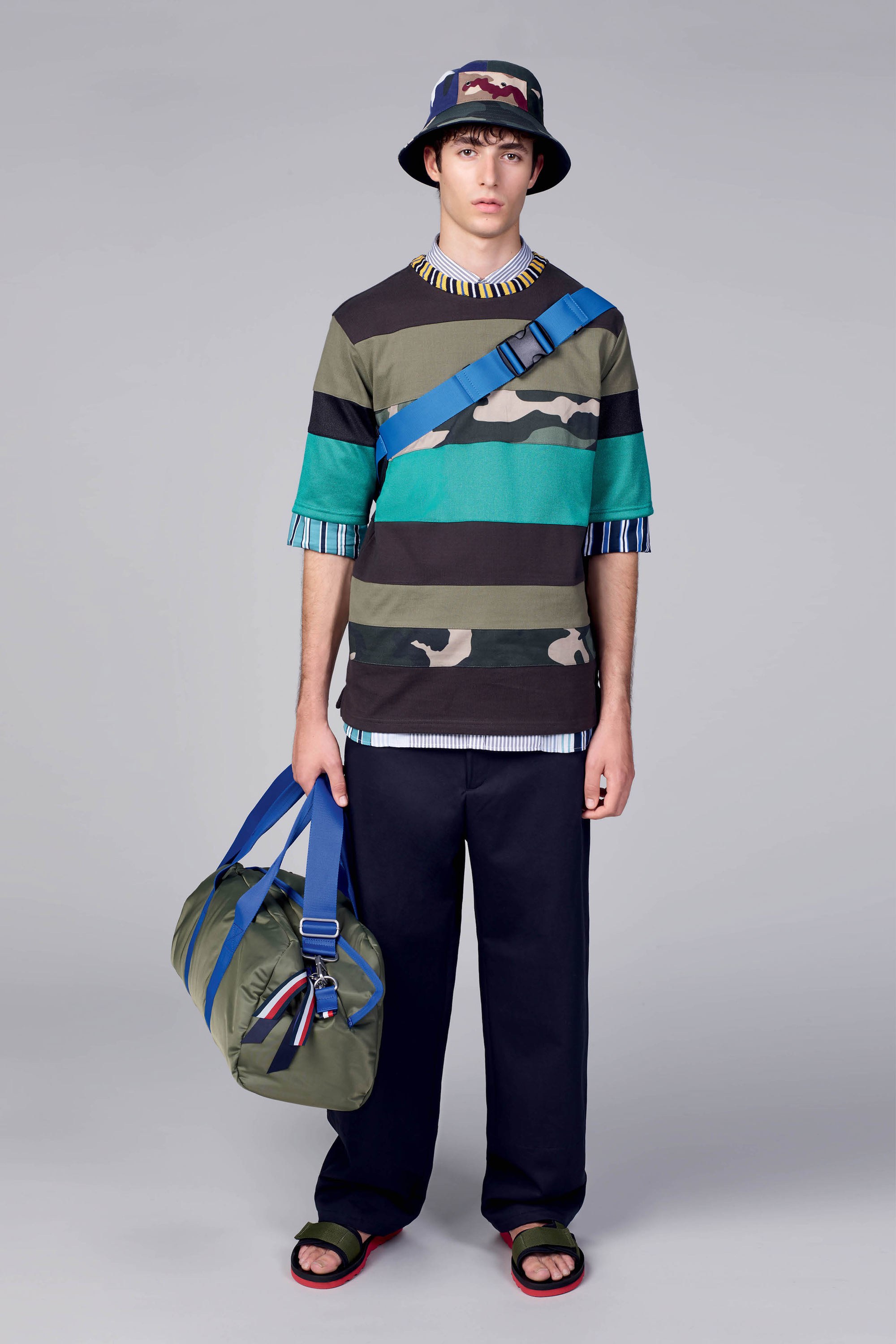 by NICOLE PHELPS Come September, Tommy Hilfiger will combine his men’s and women’s collections in one giant see-now-buy-now roadshow. The location will be London, with potential stops further east in Europe and even farther flung in future seasons. But Hilfiger’s been one of the great exporters of the American dream since his earliest days in the business. The men’s collection he showed at Pitti Uomo fits the profile. There was a loose reinterpretation of Old Glory on a fuzzy sweater. Bigger picture, team Hilfiger used camouflage, patch-working it on rugged nylon shirts and tees that look like they could do double-duty as rainproof outerwear. To be sure, there were also riffs on the red, white, and blue rugbies that count as his first signature—sans logos, though, which looks like a missed opportunity given that they are absolutely everywhere at the moment, and the company’s long history of using them.