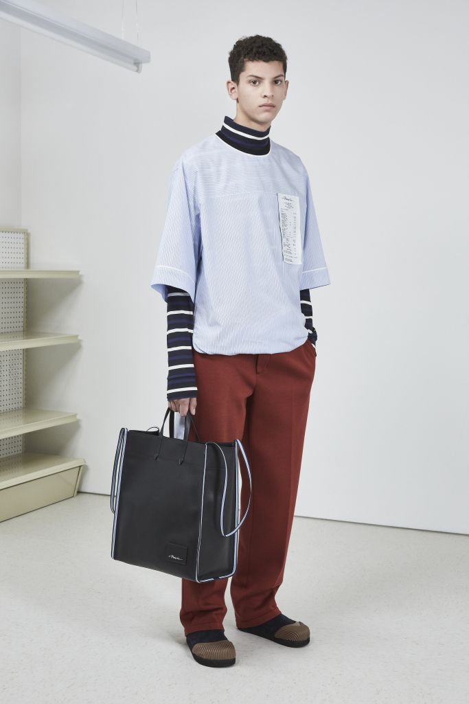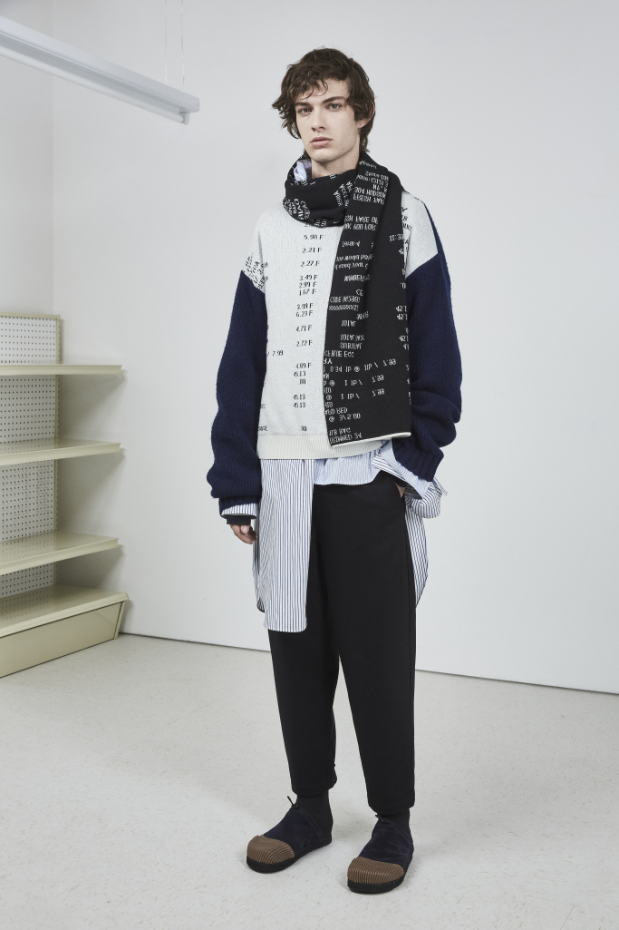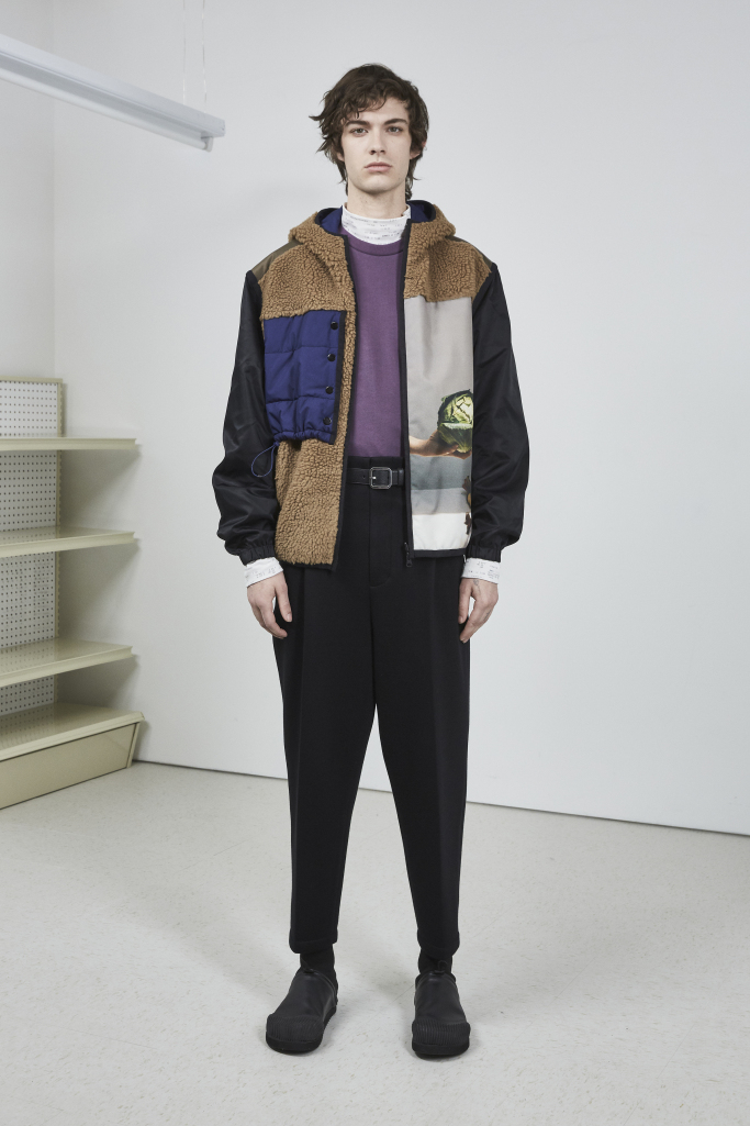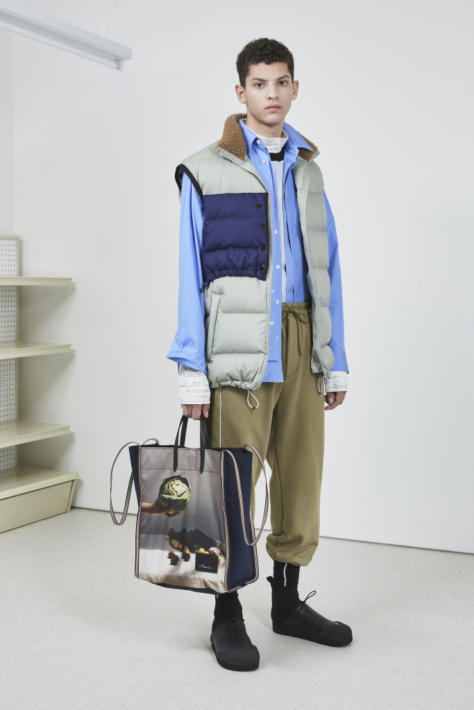 Lim also tinkered with fabrications. He used bonded Neoprene to produce a more tailored sweatpants and cotton instead of nylon for puffer jackets. More literal references came through in the graphics, which ranged from a receipt of Lim’s purchases at an actual grocery store, or a market tote and a Patagonia-esque jacket covered in photographs of produce.