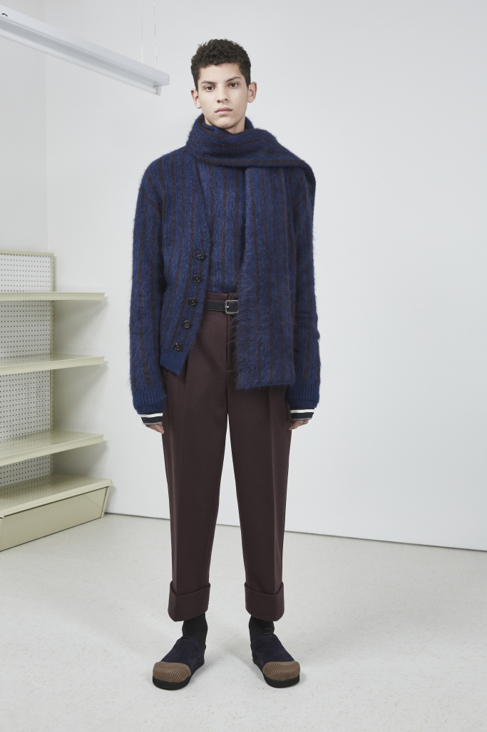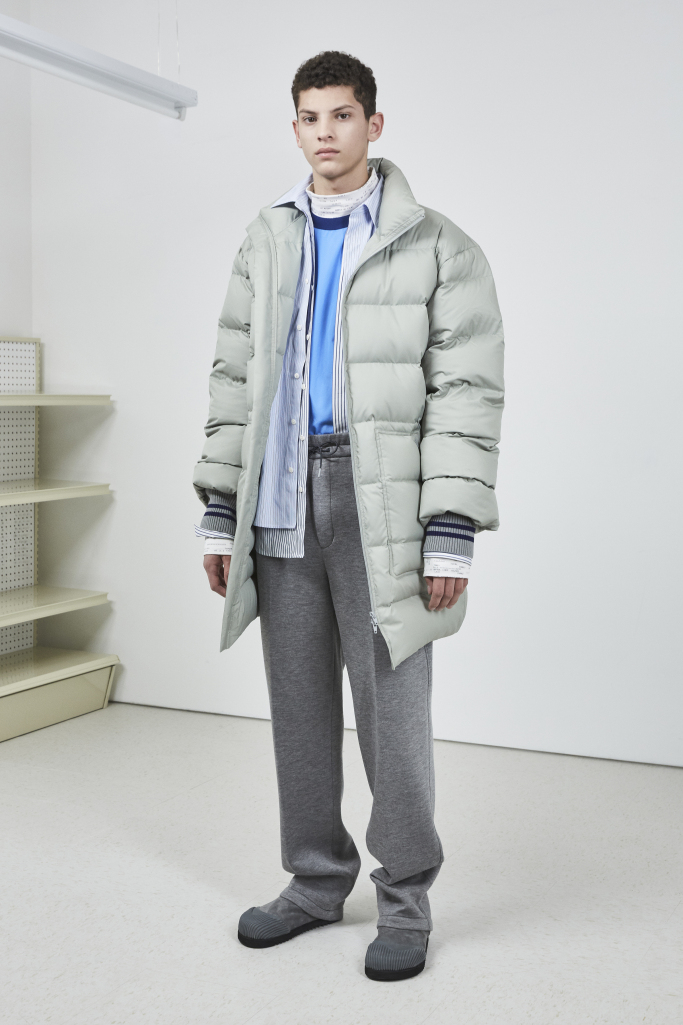 The collection was a lesson in layering for (stylish) dummies. Looks that appeared to be comprised of three or four garments were actually one piece Lim had cleverly constructed. Bubble coats featured knit sleeves, men’s sleep shirts included double collars, and mock turtlenecks peeked out of other tops. Many of the items were also reversible.