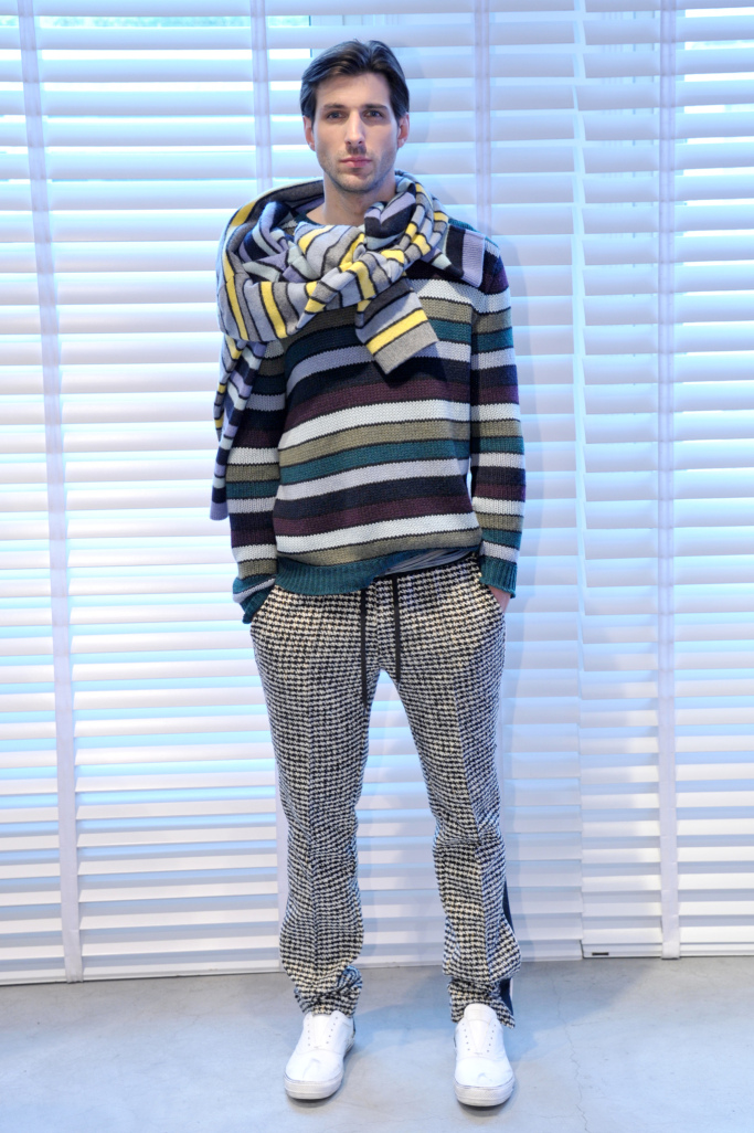 There was also a sporty element seen, for example, in the Prince of Wales drawstring jogging pants with sporty bands in technical fabrics running down the sides. Other classic fabrics — houndstooth and herringbone — were updated by expanding the patterns and adding touches of bright yellow or red. Horizontal stripes in bright colors were enhanced by alternating them with black bands. Shapes were loose and soft, as in a raw-edge camel coat. The well-edited collection looked contemporary and allowed the wearer to play with different combinations.