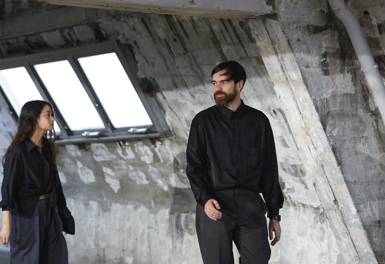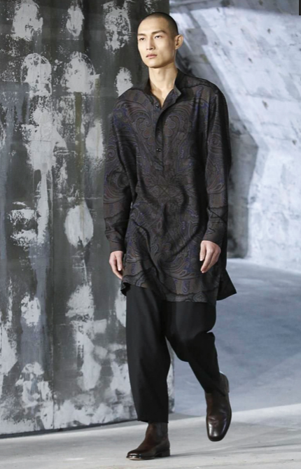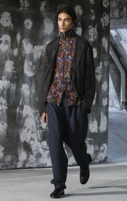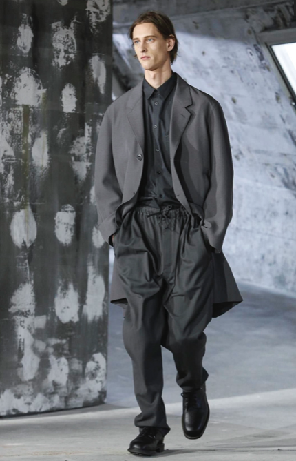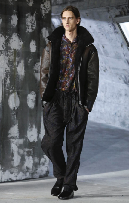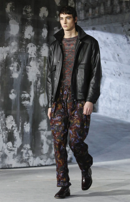 Lemaire and Sarah-Linh Tran have developed a glossary of classic Parisian understatedness in their work — think Yves Saint Laurent, the man and the ultrachic male Parisian. In their hands, an overcoat piled atop a jacket and several other elements do not add much bulk, making their layers more nuance than cold weather strategy. Yet the standouts were undoubtedly those silhouettes in which the volume play was marked: a sheepskin flight jacket, worn with elasticated paisley pants; oversize chimney collars and flowing pants, and a generously proportioned marbled hooded raincoat.