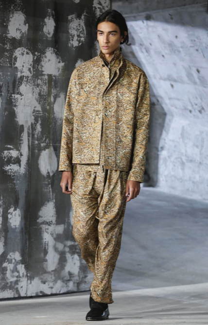 Lemaire and Sarah-Linh Tran have developed a glossary of classic Parisian understatedness in their work — think Yves Saint Laurent, the man and the ultrachic male Parisian. In their hands, an overcoat piled atop a jacket and several other elements do not add much bulk, making their layers more nuance than cold weather strategy. Yet the standouts were undoubtedly those silhouettes in which the volume play was marked: a sheepskin flight jacket, worn with elasticated paisley pants; oversize chimney collars and flowing pants, and a generously proportioned marbled hooded raincoat.