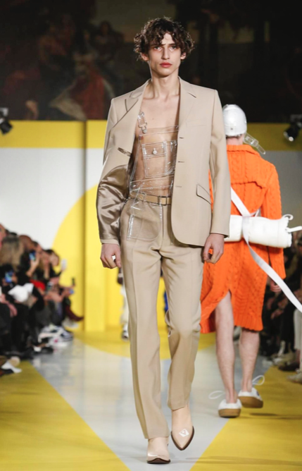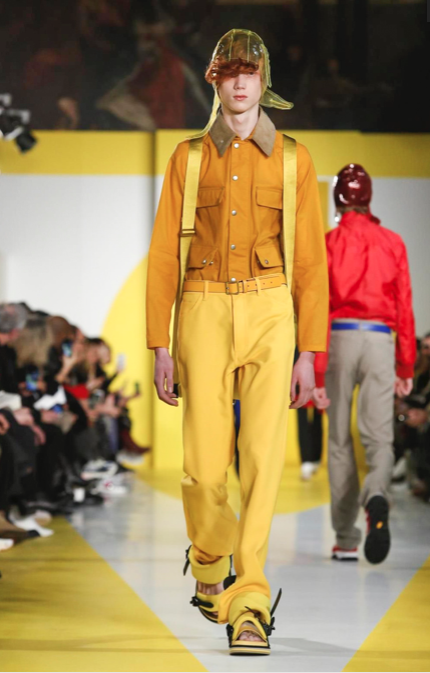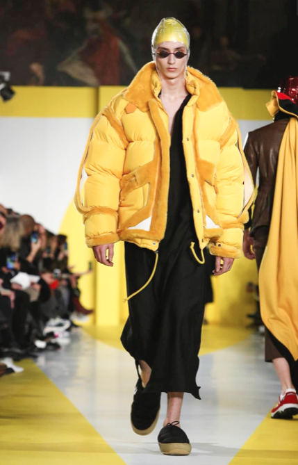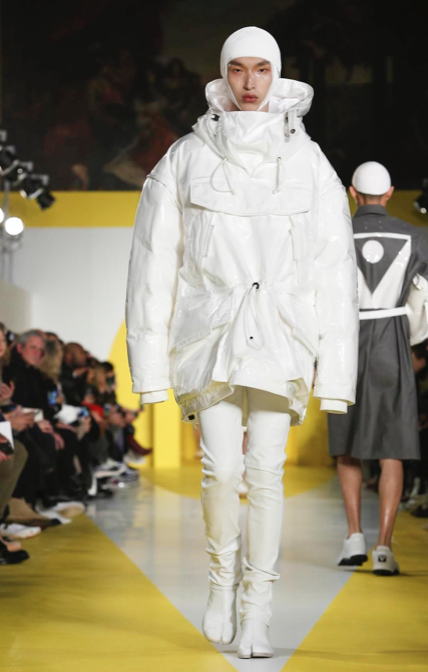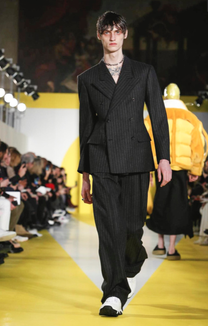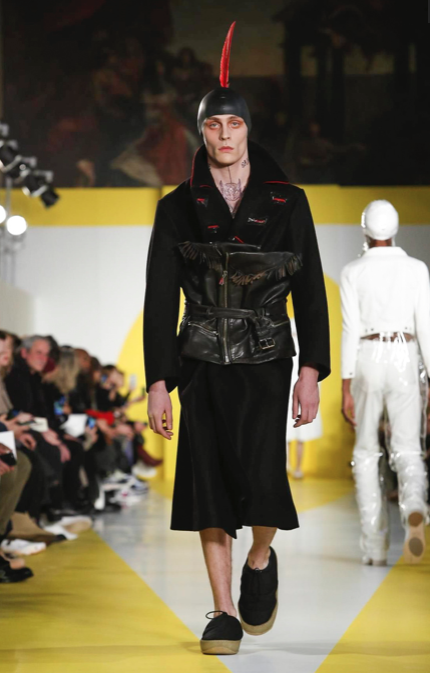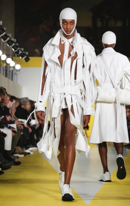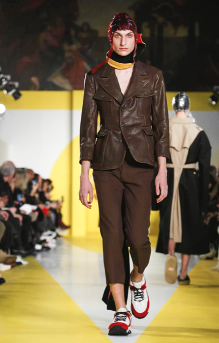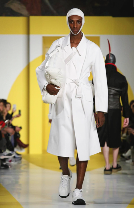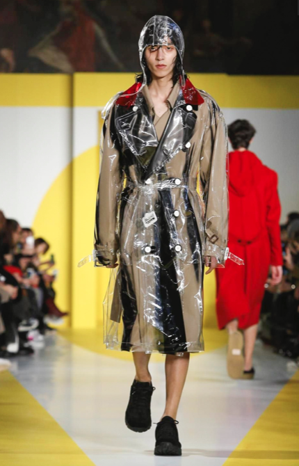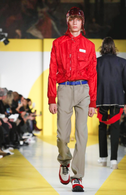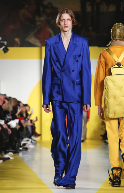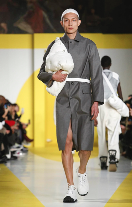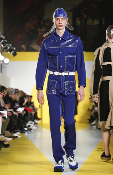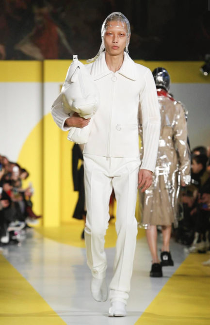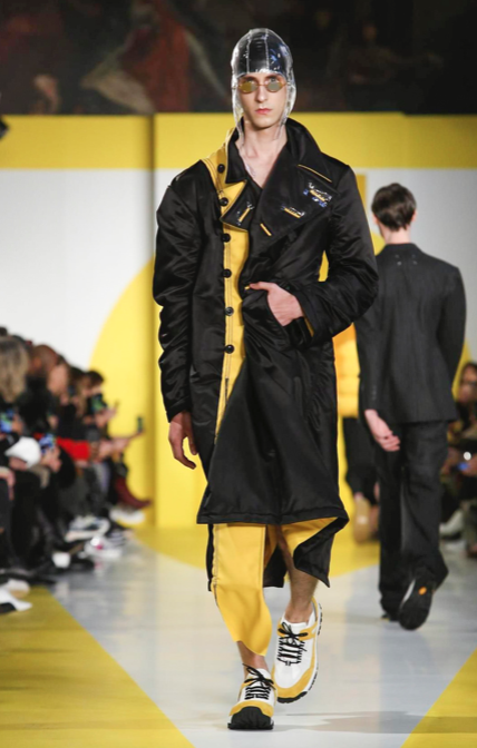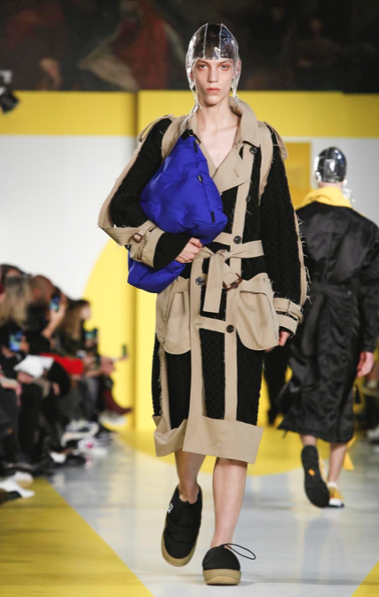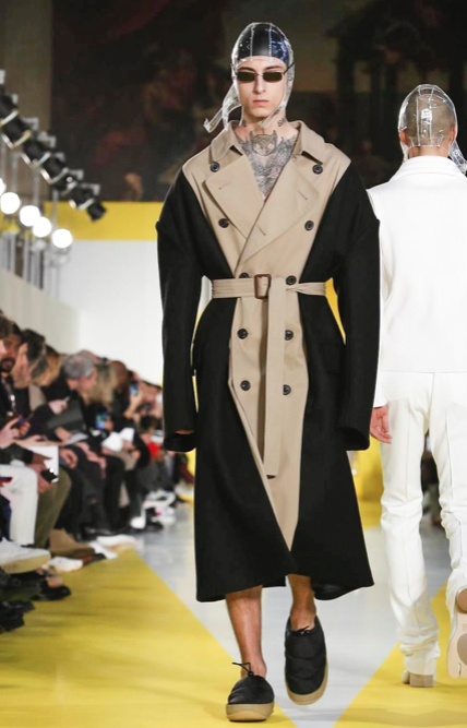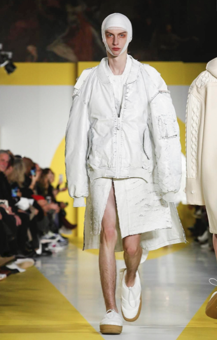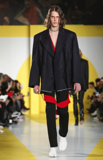 Cut & collage are highlighted in look 11 from our Autumn-Winter 2018 Men’s Collection designed by @jgallianio. A grey double-breasted overcoat is inserted with a Klein blue duchesse satin splice while the new ‘Security Margiela Sneakers’ or ‘SMS’ make their runway debut.