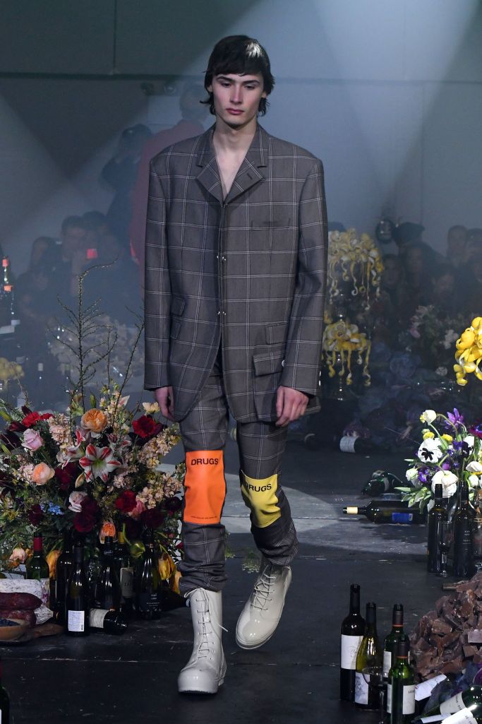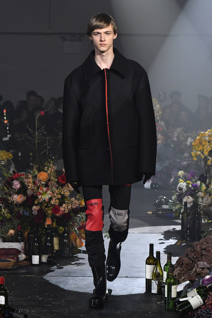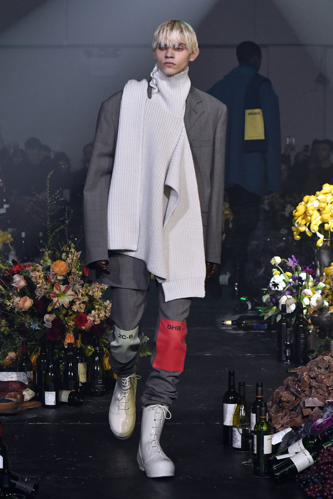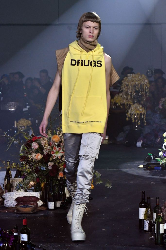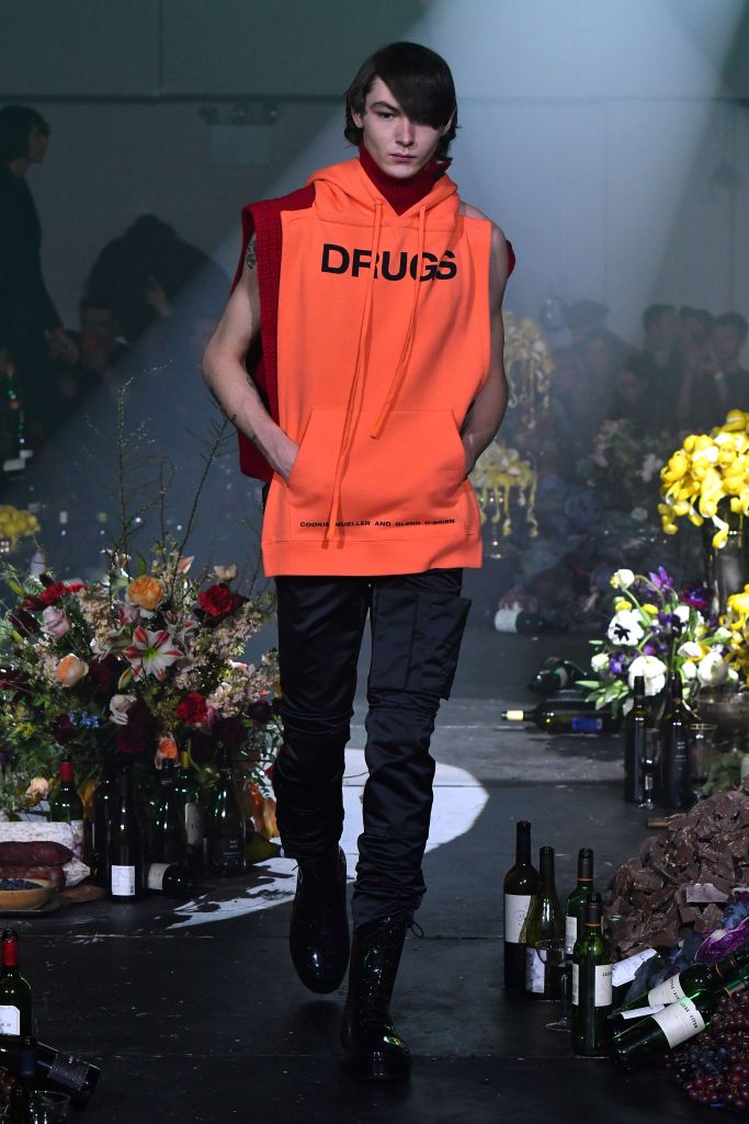 Drug references surfaced both subtly, as patches on scarves and knee pads printed with the letters LSD, XTC and GHB, or blatantly, as in the word “drugs” printed in large block letters on a sliced open hoodie/poncho.