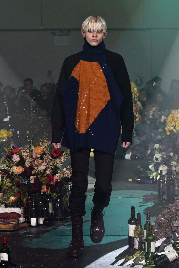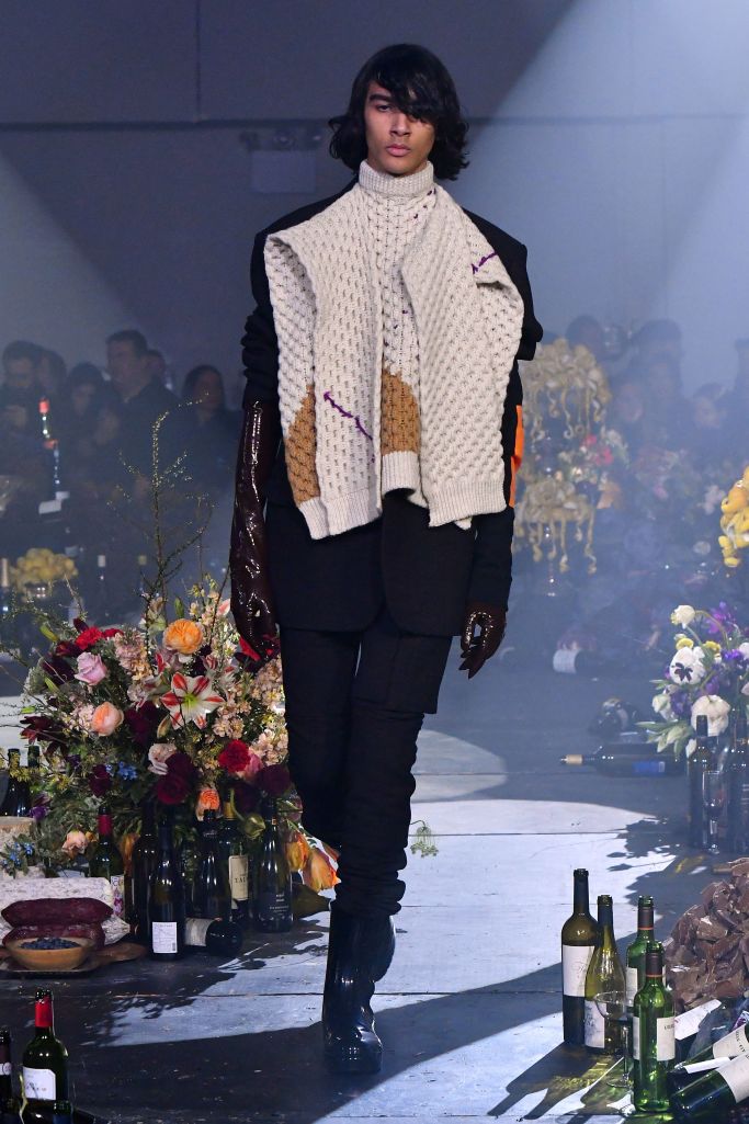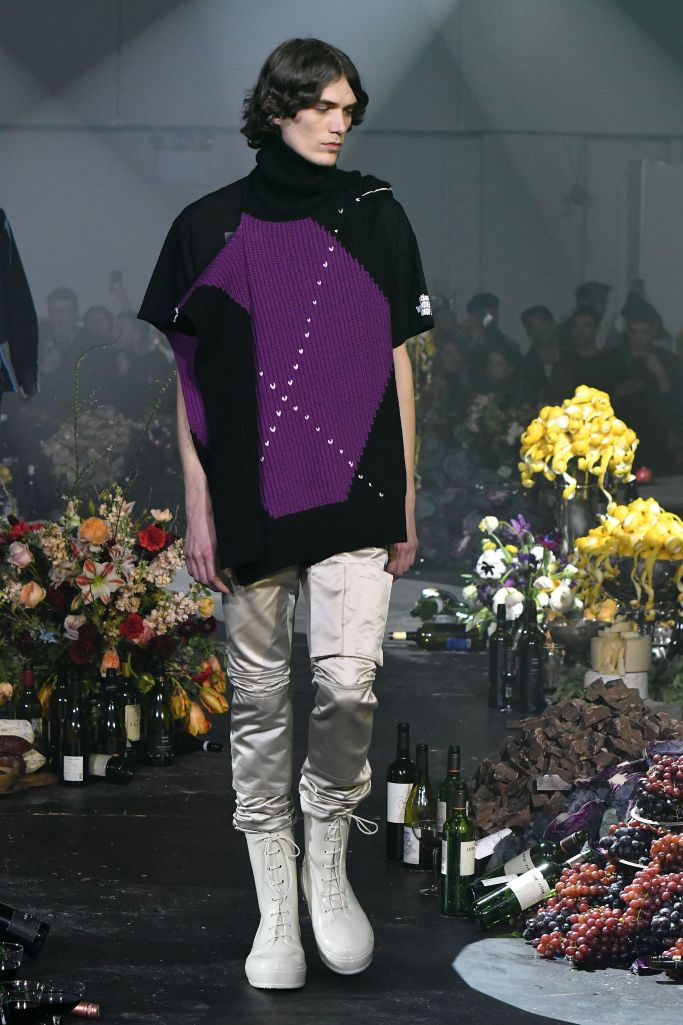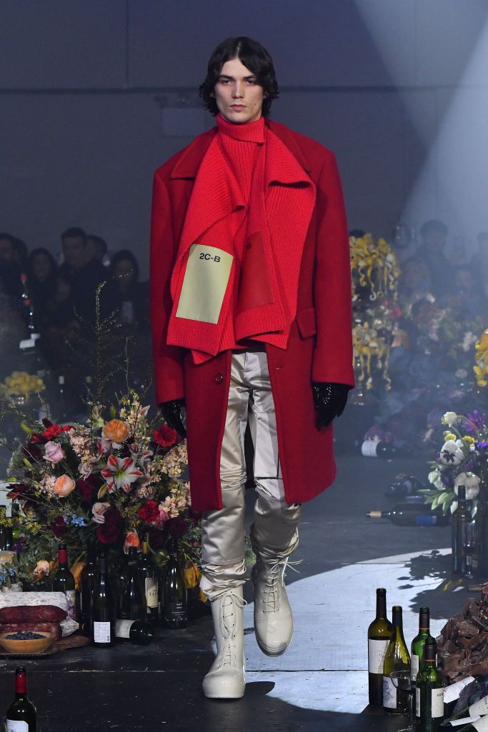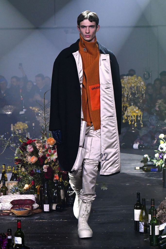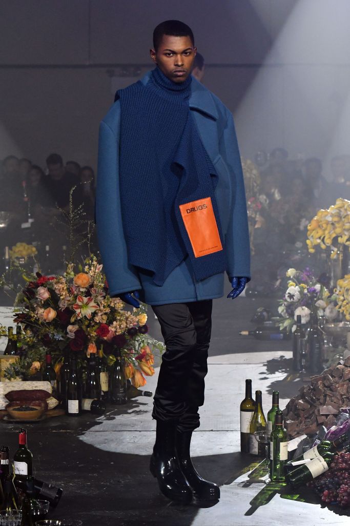 Drug references surfaced both subtly, as patches on scarves and knee pads printed with the letters LSD, XTC and GHB, or blatantly, as in the word “drugs” printed in large block letters on a sliced open hoodie/poncho.