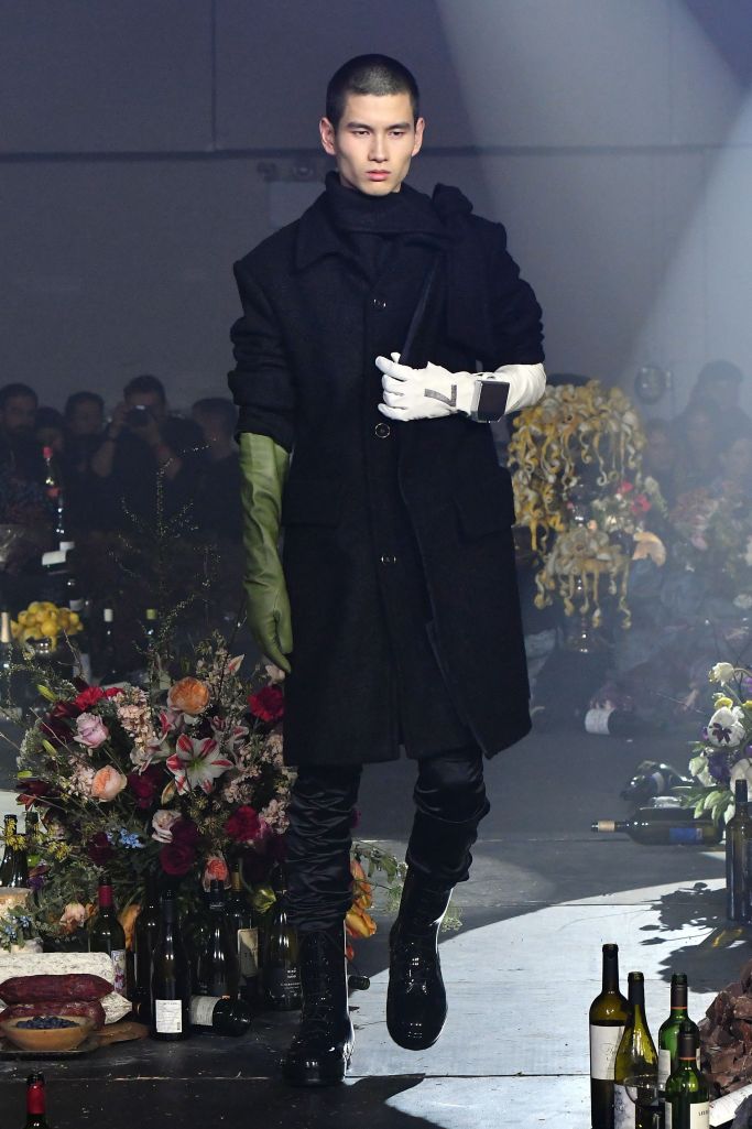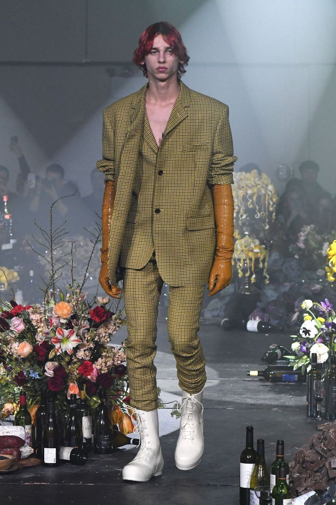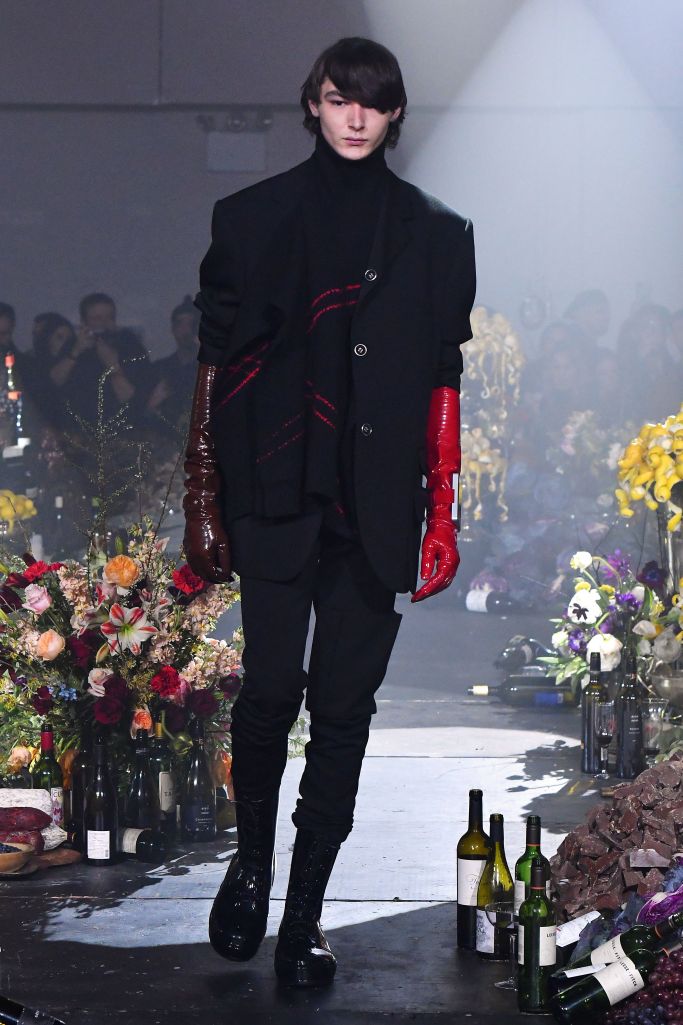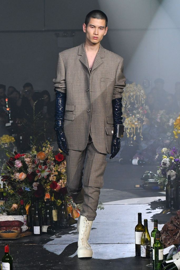 The abundant tailored offering mirrored that silhouette with oversize blazers and skinny pants accessorized with elbow-high latex gloves.