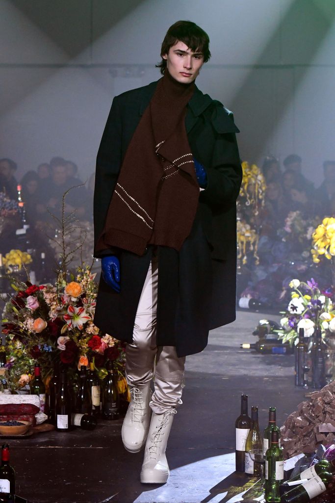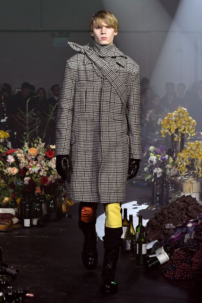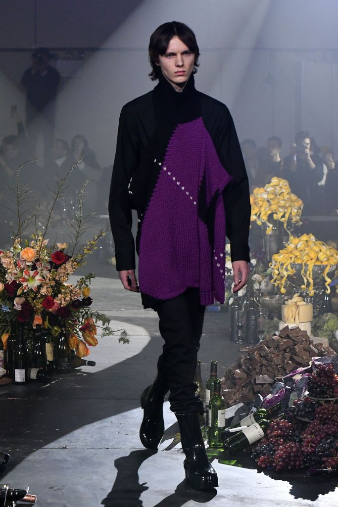 Raf Simons set up his own interpretation of a Flemish still-life painting — an opulent tableaux of fruits, red wine, loaves of bread and impressive flower arrangements — as the backdrop for his fall collection, titled “Youth in Motion.”