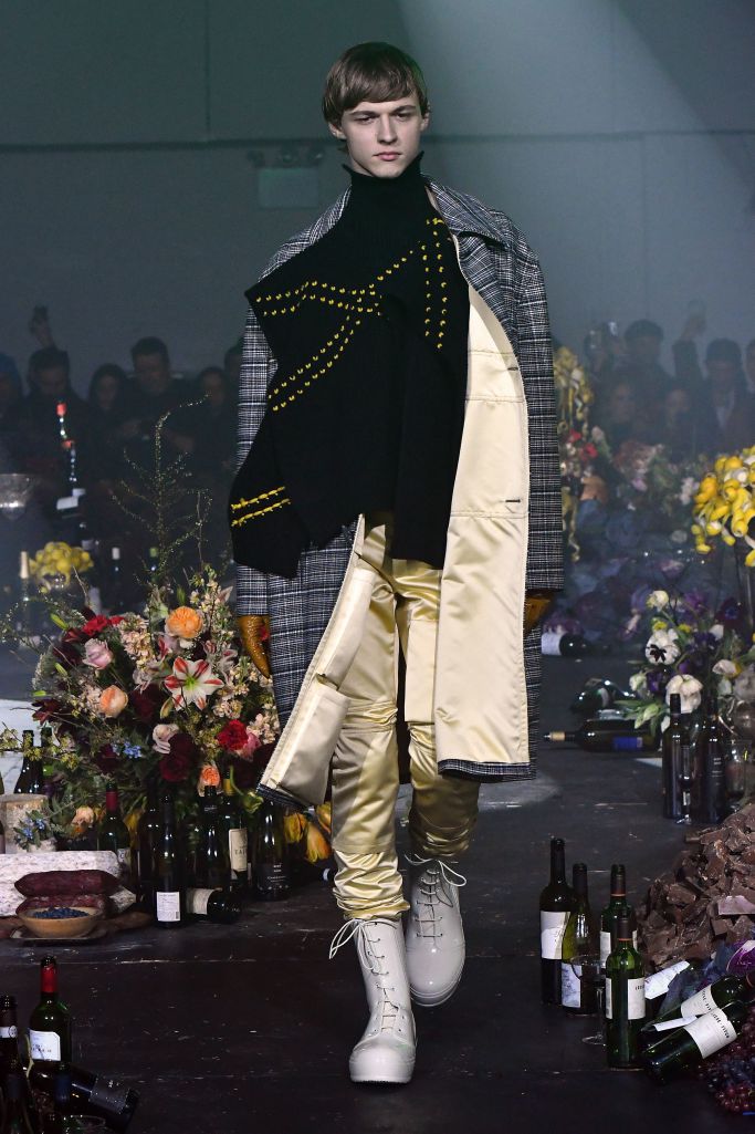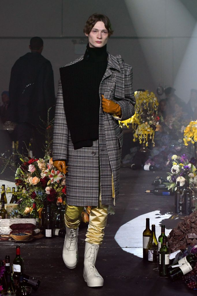 The opening look — a boxy plaid coat with contrasting yellow lining over a deconstructed turtleneck with draping side panels and ultrafitted satin cargo pants — served to introduce his new silhouette.