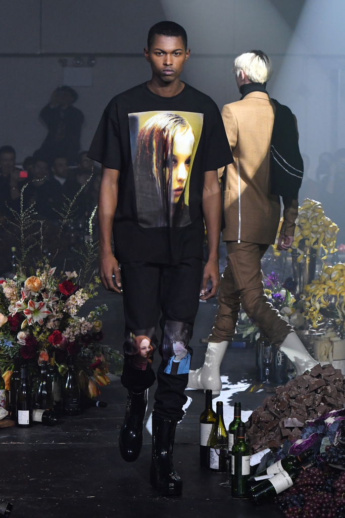 Other graphic references that spoke to the designer’s heritage were the actual photographs of the film’s lead characters that he printed on pants, T-shirts and on the backs of some coats.