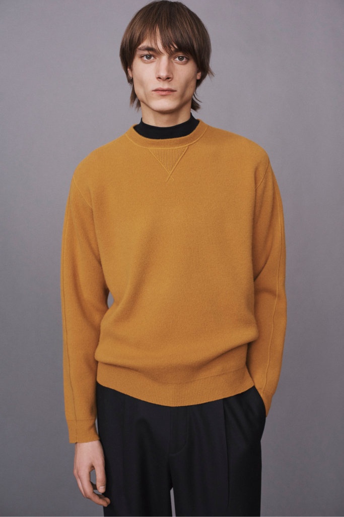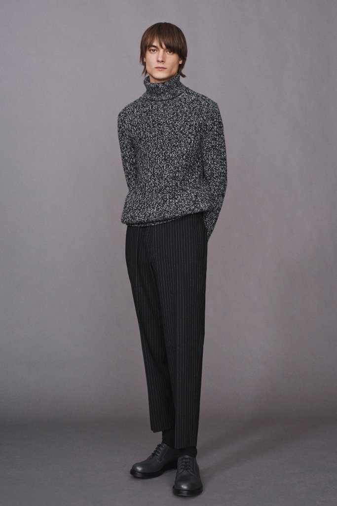 This resulted in a minimal collection of blazers made from nylon stretch that were laser cut and bonded with seam tape, ponte knit trousers, a lightweight puffer coat that looked like a shirt jacket, and nubby, color-blocked knits. Andersson brought sustainability into the line with a wool suit that’s a part of their Good Wool program, which features pieces constructed with yarn from a New Zealand farm and manufactured in a more environment-friendly way. He added a textural interest with leather and shearling outerwear in addition to high-pile bomber jackets and sweaters.