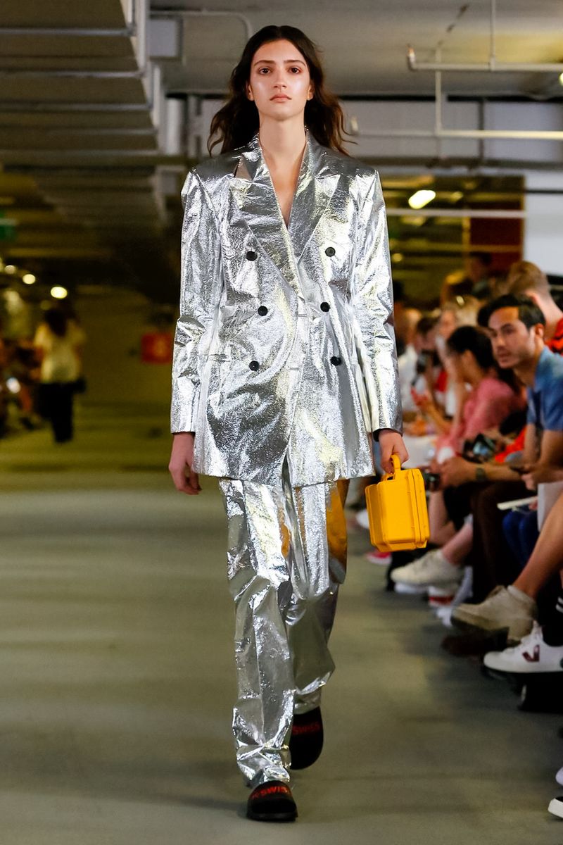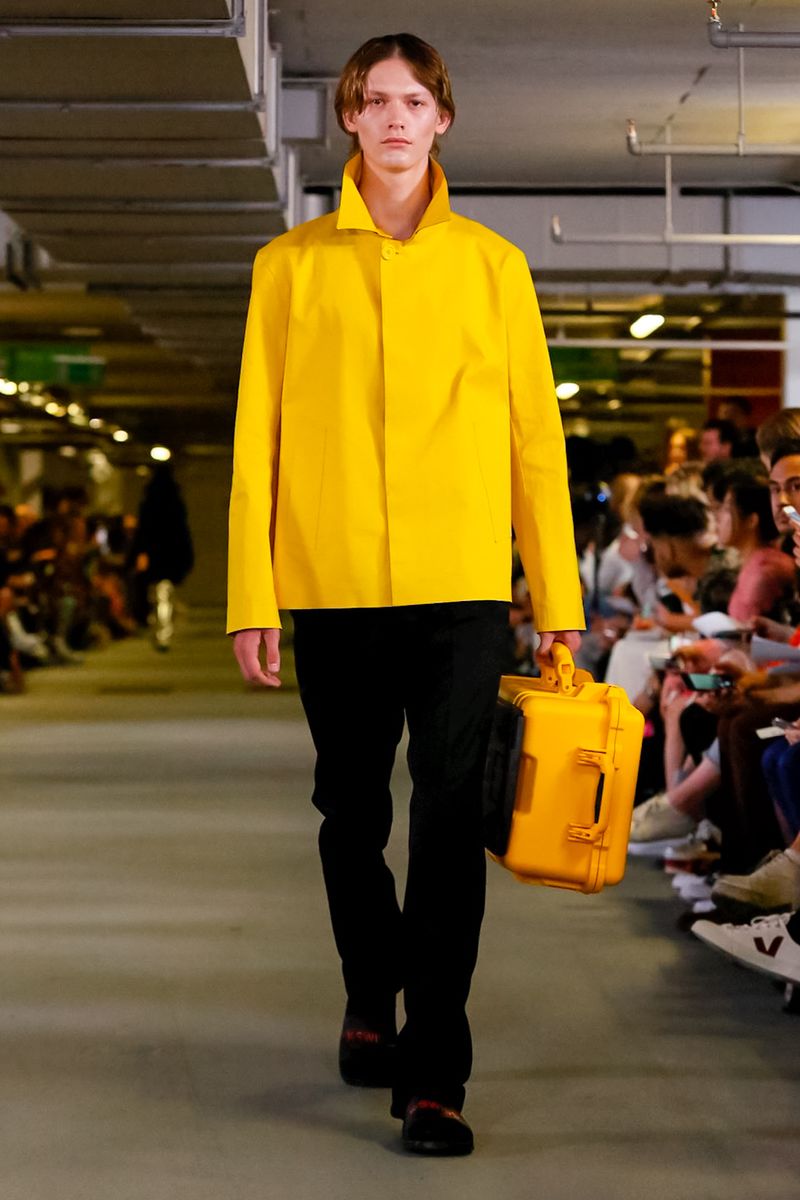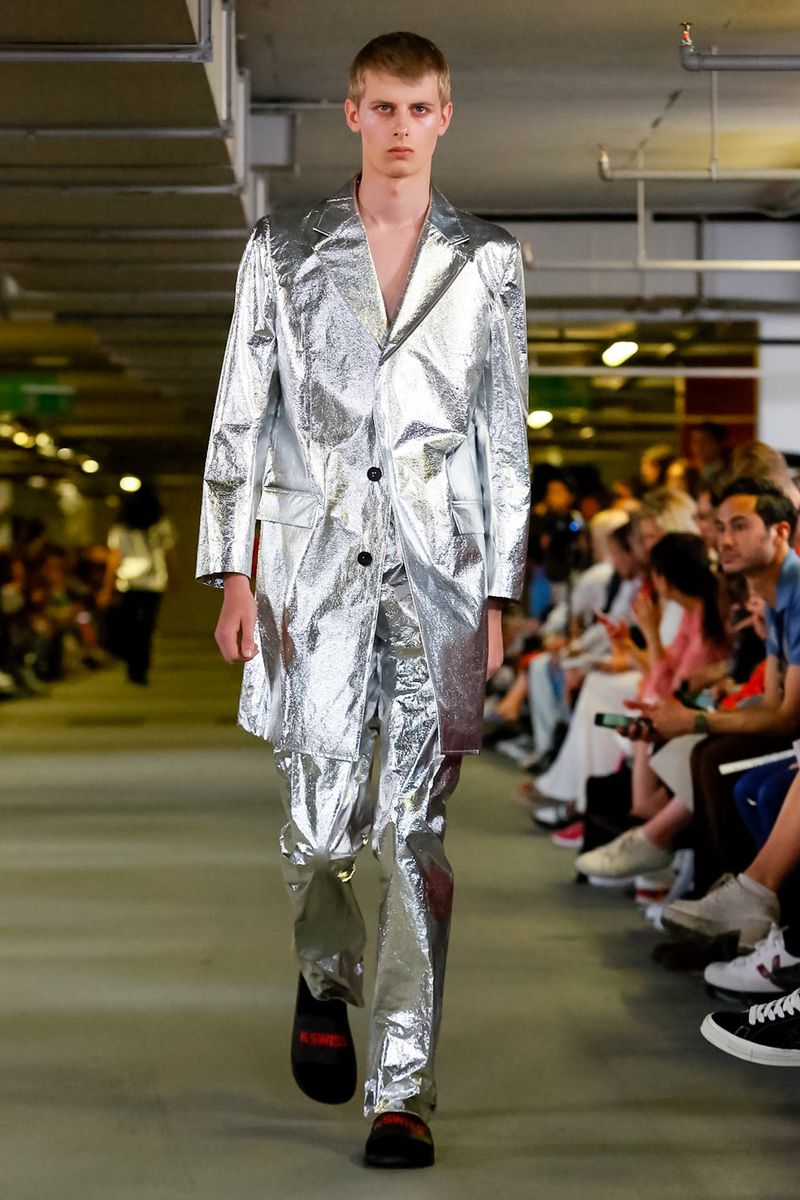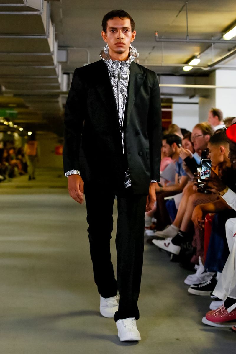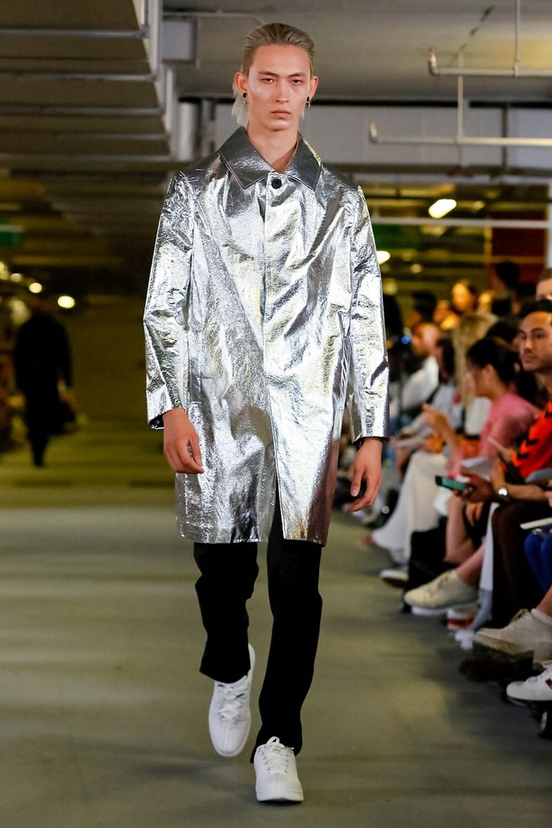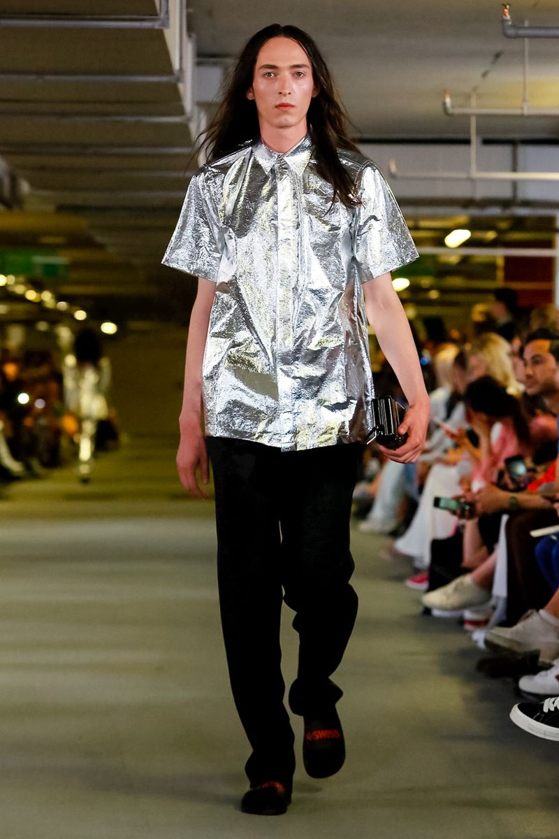 With all 100% recycled band merchandise at Q Car Park in Poland Street London, where the collection was taken, Matthew Miller, discovered its inner thoughts and re-design classics like long sleeves, straight trousers, silver shirts, yellow coats, all ready for a Summer in London.