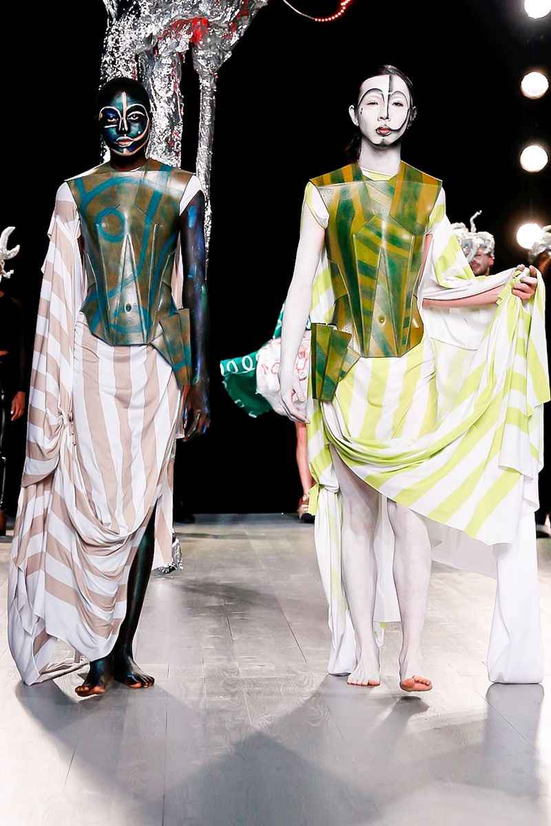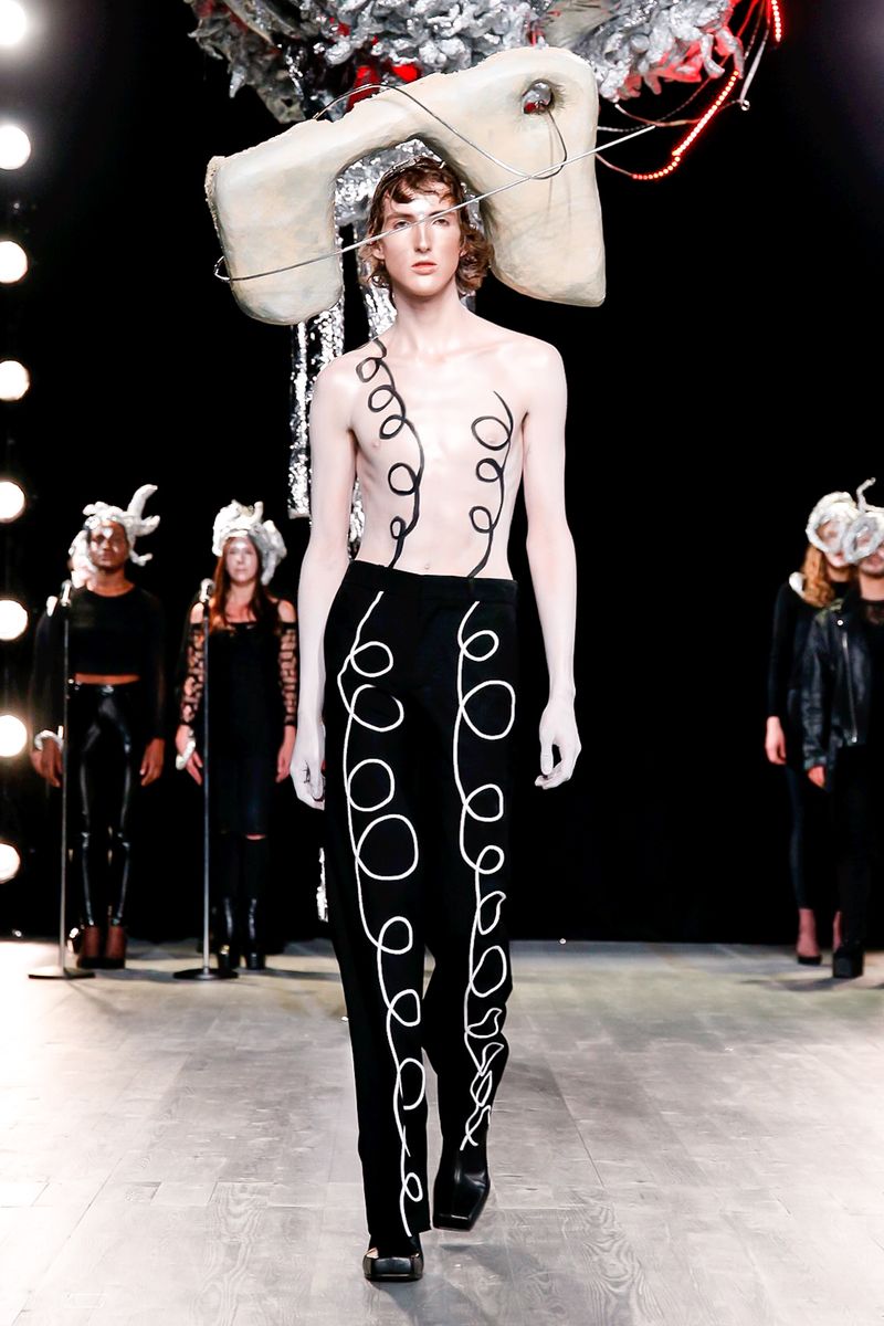 “LOVERBOY” quoted a yellow sweatshirt with a long skeleton printed in black, you can see paradoxical artsy shorts, like every model has its own story-teller, like artsy painting and headpieces from Leo Carlton.