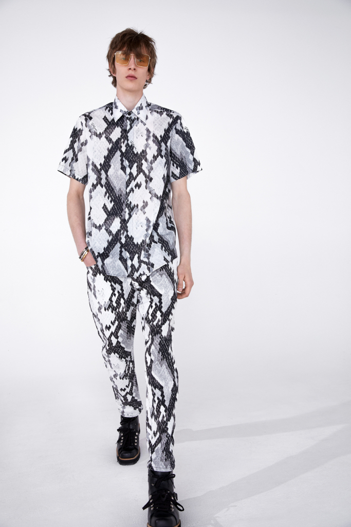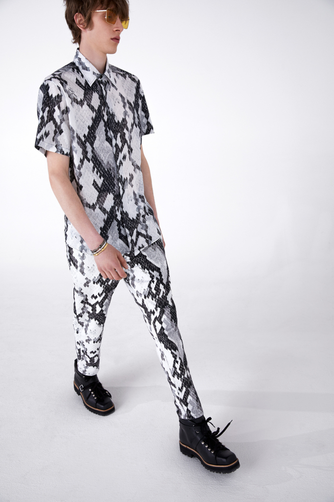 A python pattern was rendered in a sketched, graphic version on a cotton shirt matched with coordinating pants.