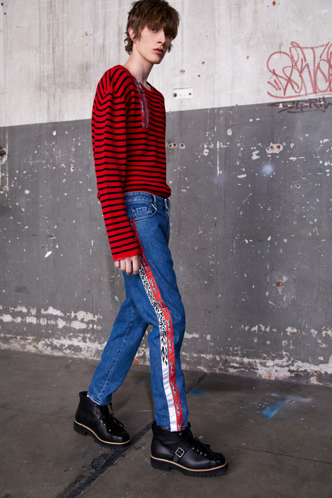 A sporty feel was introduced via cool tracksuits with colorful side bands, which also peppered a pair of jeans worn with a striped sweater embellished with a zippered detail.