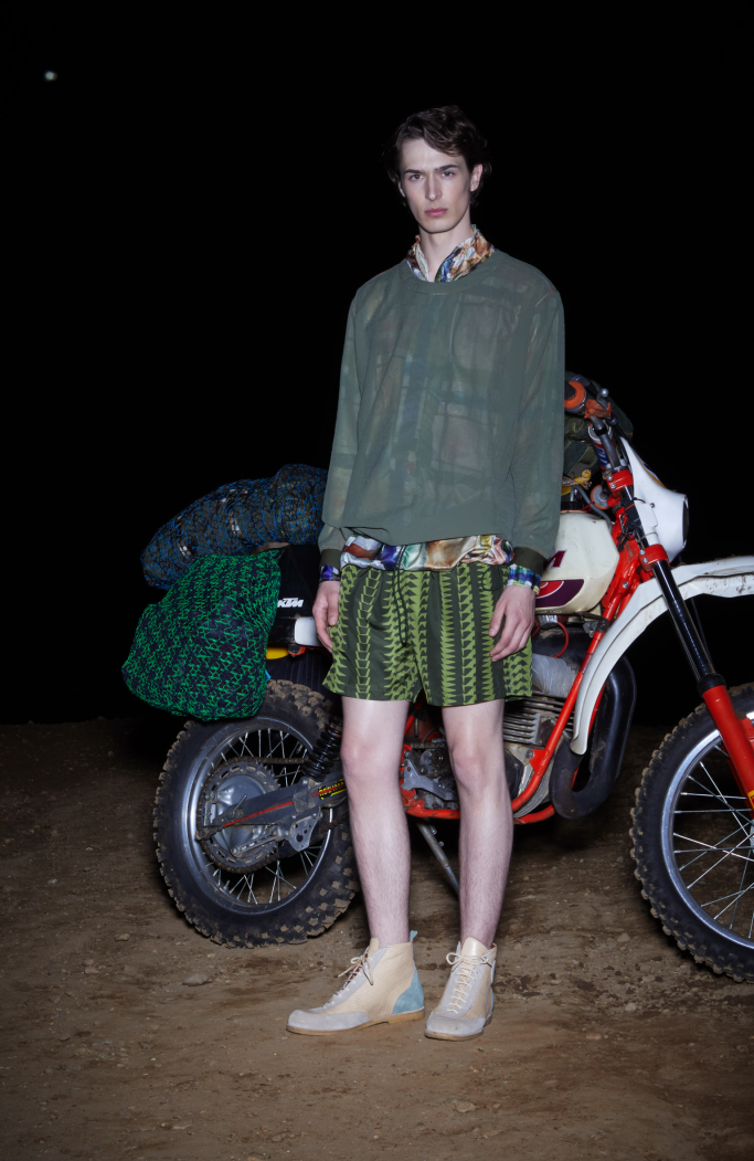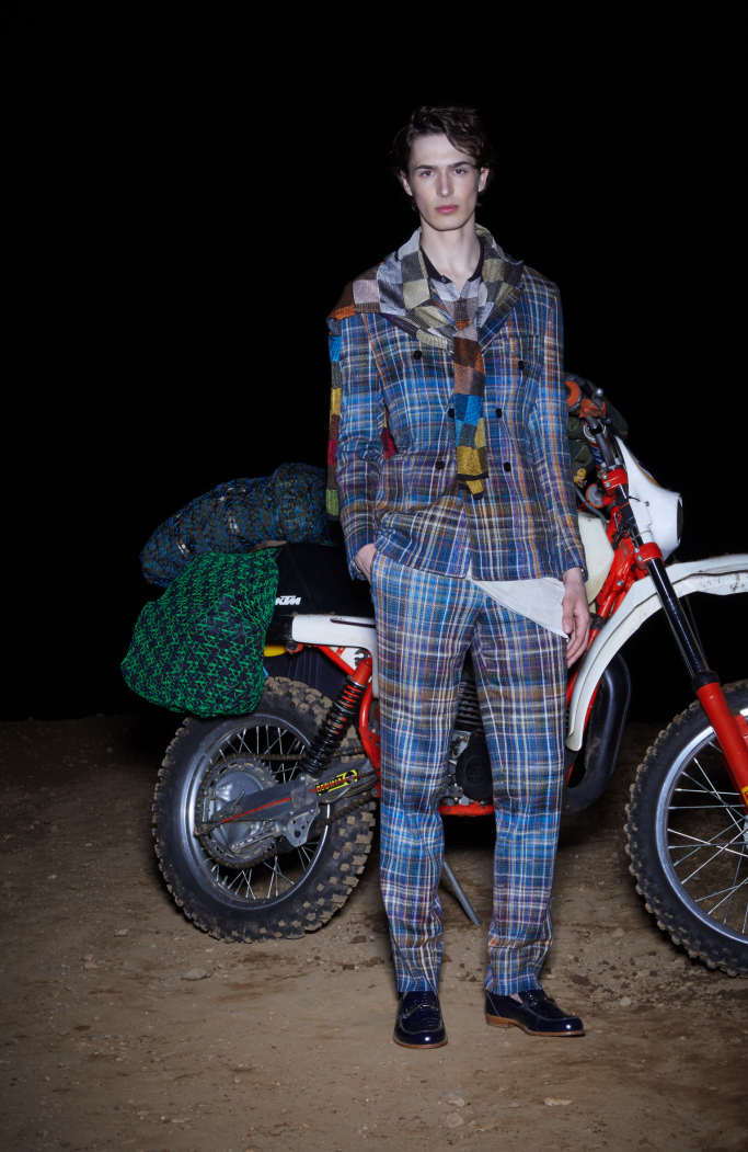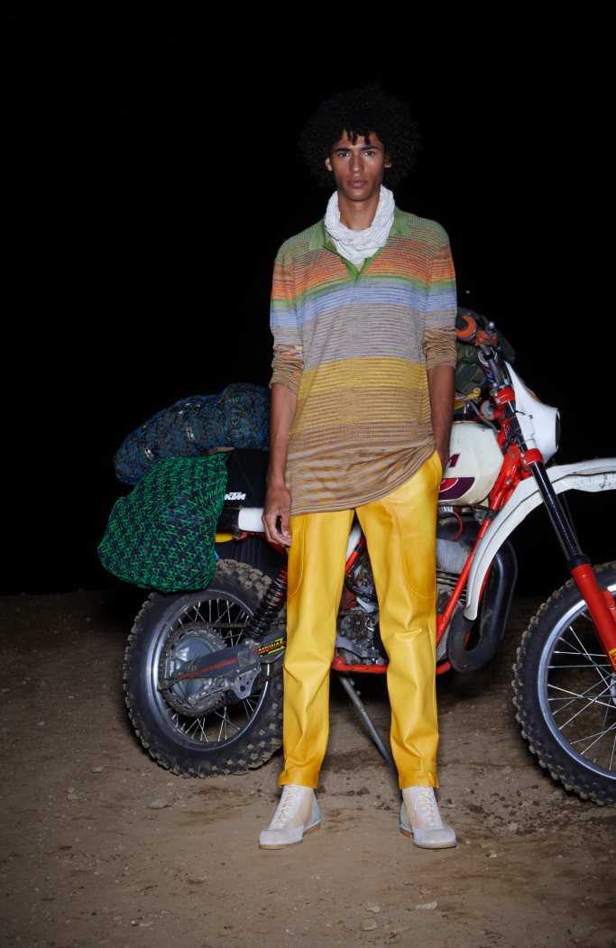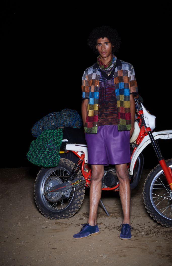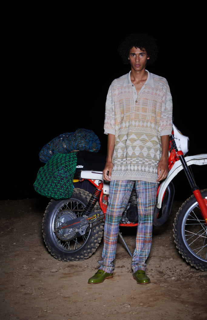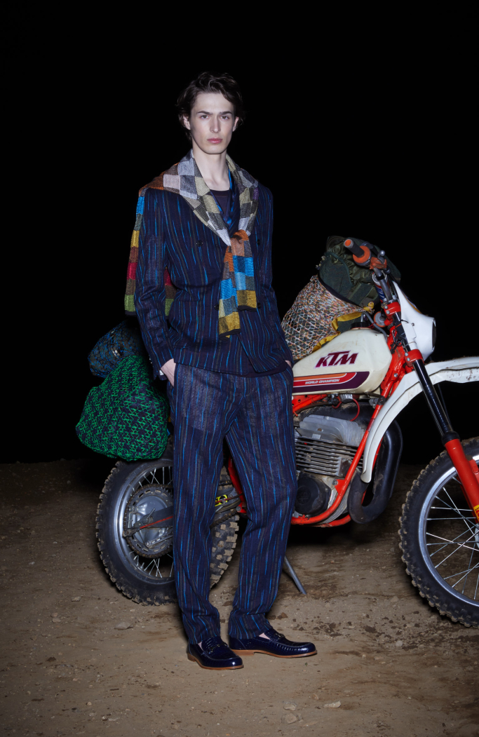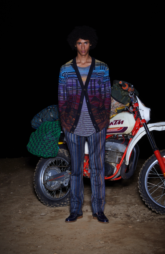 The presentation under the moon light in a sober dark set with a motorbike in the back focusing in the most important thing: Missoni new collection.
