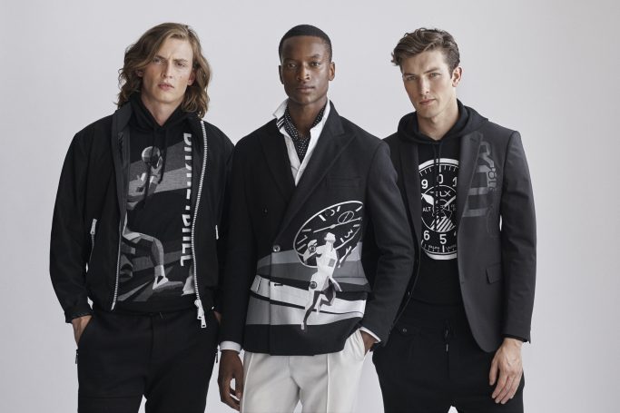A pair of tailored black wool tracksuit bottoms, complete with ticket pocket, pleats and a contrasting side stripe, was very on-brand. Who else could have designed them? He paired them with a matching, stretchy tailored jacket.
