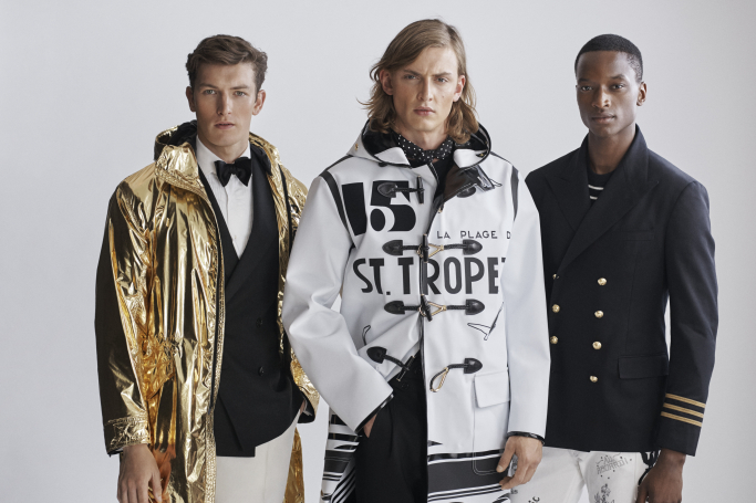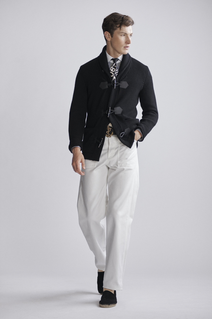 Other sportier looks included a bright white pea coat with blue stripes on the sleeves that was ultra-sharp, as were some chunky, shapely knits, some with toggle fastenings.