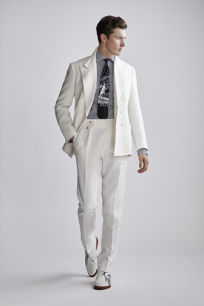 There were chic nods to hot-weather dressing, too, in the form of a lightweight, linen suit that was the color of desert sand. It was paired with a matching linen tie and soft-collared shirt.