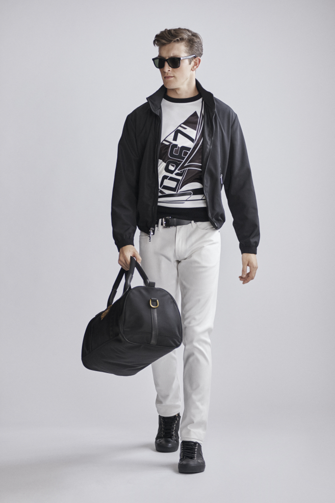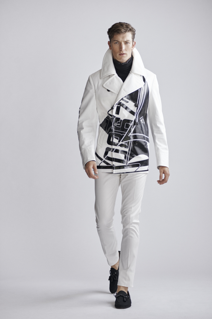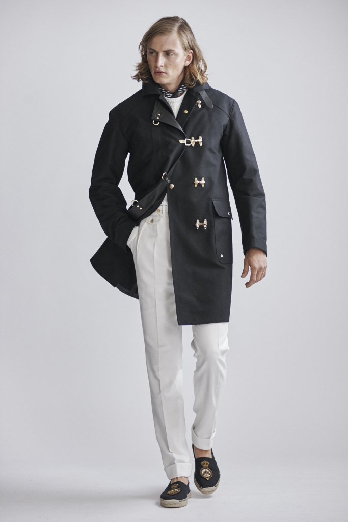 Other sportier looks included a bright white pea coat with blue stripes on the sleeves that was ultra-sharp, as were some chunky, shapely knits, some with toggle fastenings.
