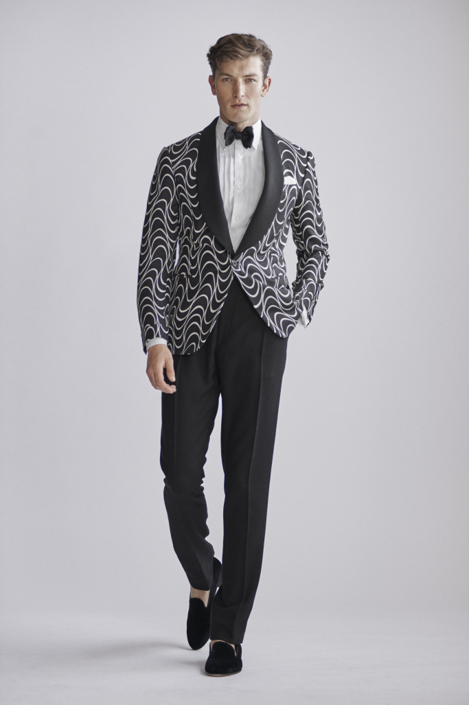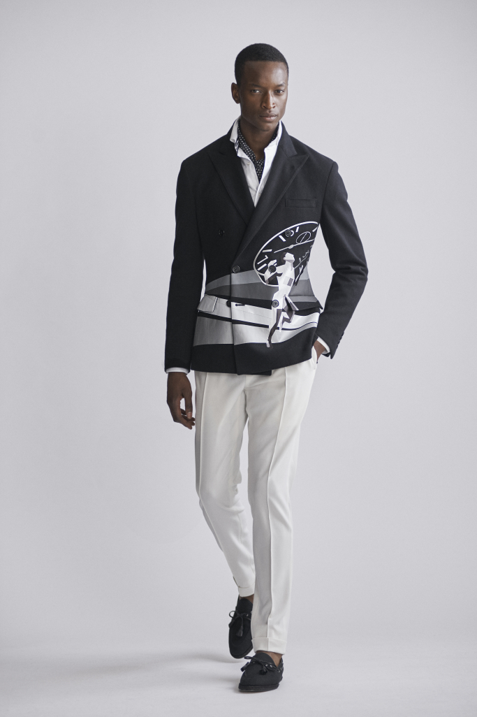 A pair of tailored black wool tracksuit bottoms, complete with ticket pocket, pleats and a contrasting side stripe, was very on-brand. Who else could have designed them? He paired them with a matching, stretchy tailored jacket.