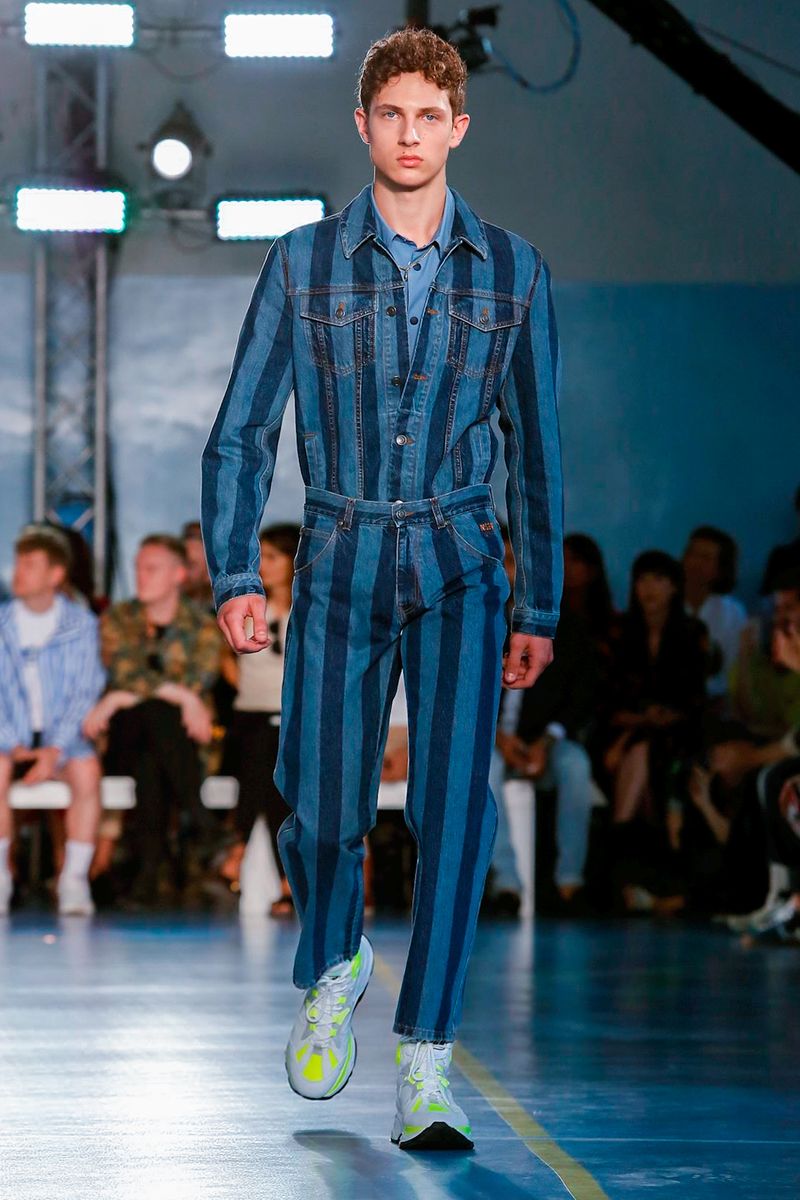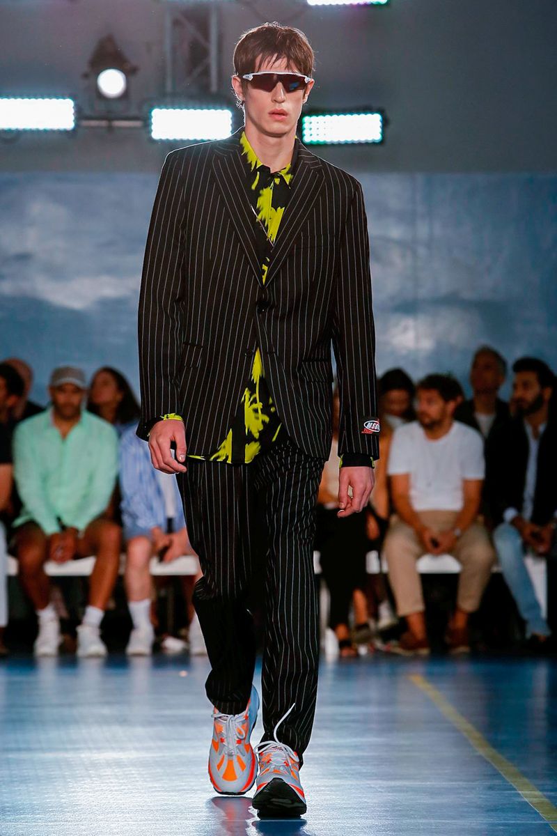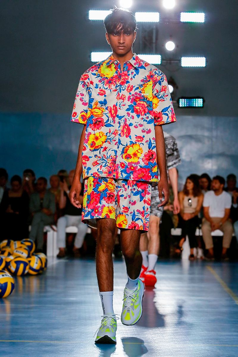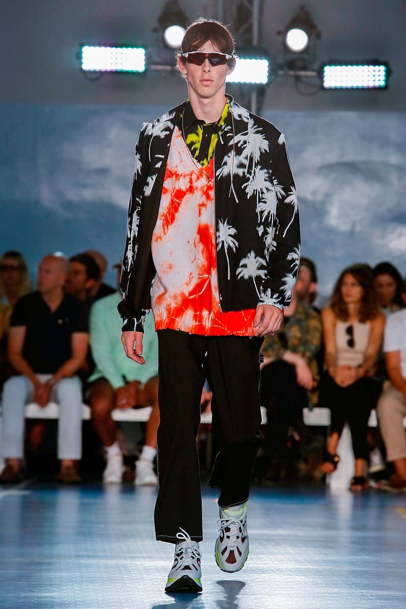 Reinforcing his codes, the neon nylon shirts, Hawaiian-style floral acid prints and tie dyed references were in their element. with Oakley-style sunglasses completing the look.
