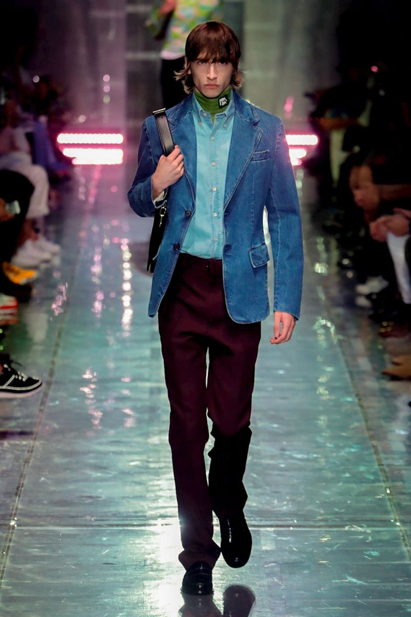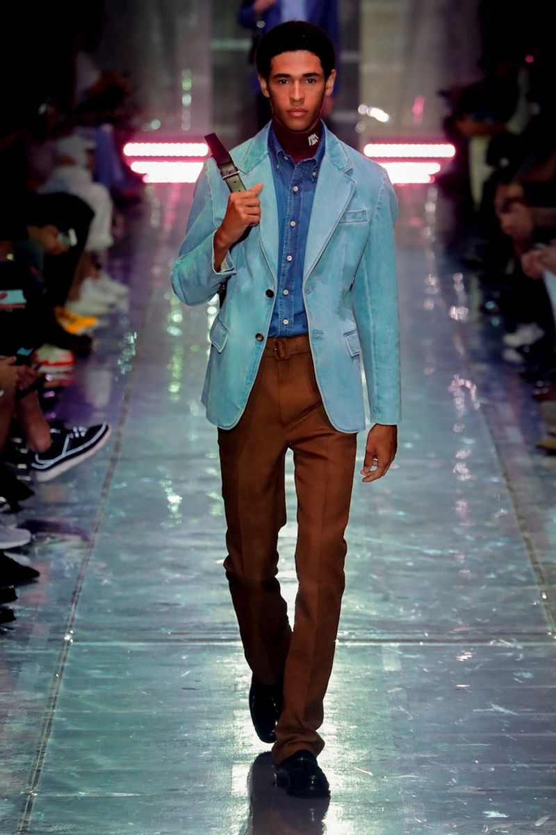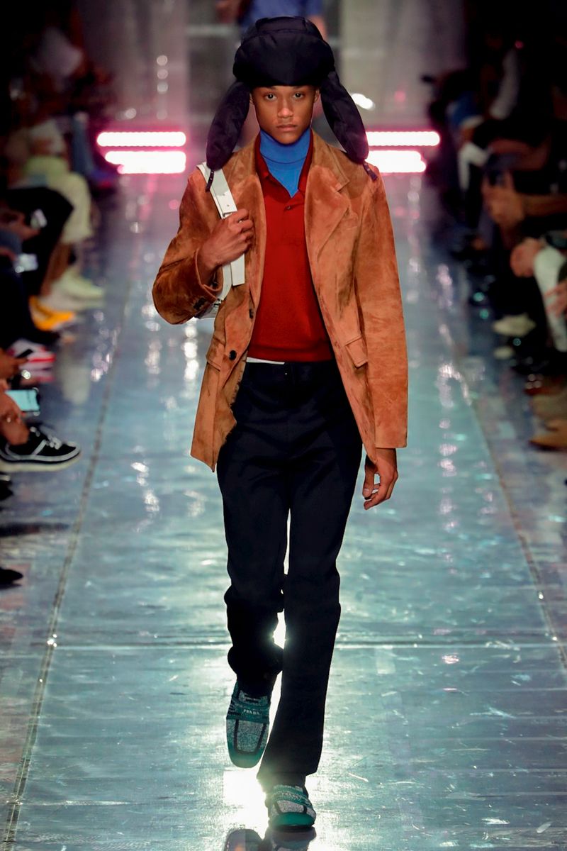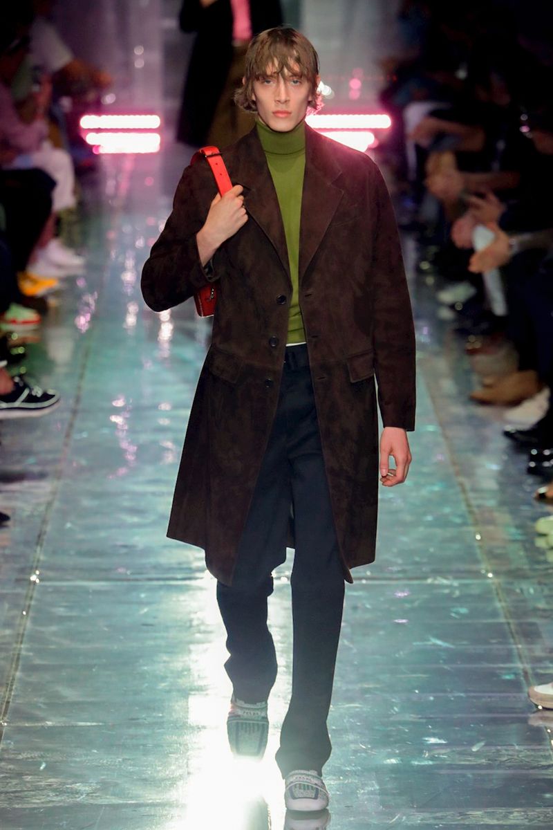 Prada was right about the clothes: They were a mixed bag of separates, ranging from lean, flat-front trousers with tone-on-tone belts in-house staples like eggplant, sludgy brown and forest green, to tailored jeans and jackets, to a lineup of straightforward suede overcoats and jackets.