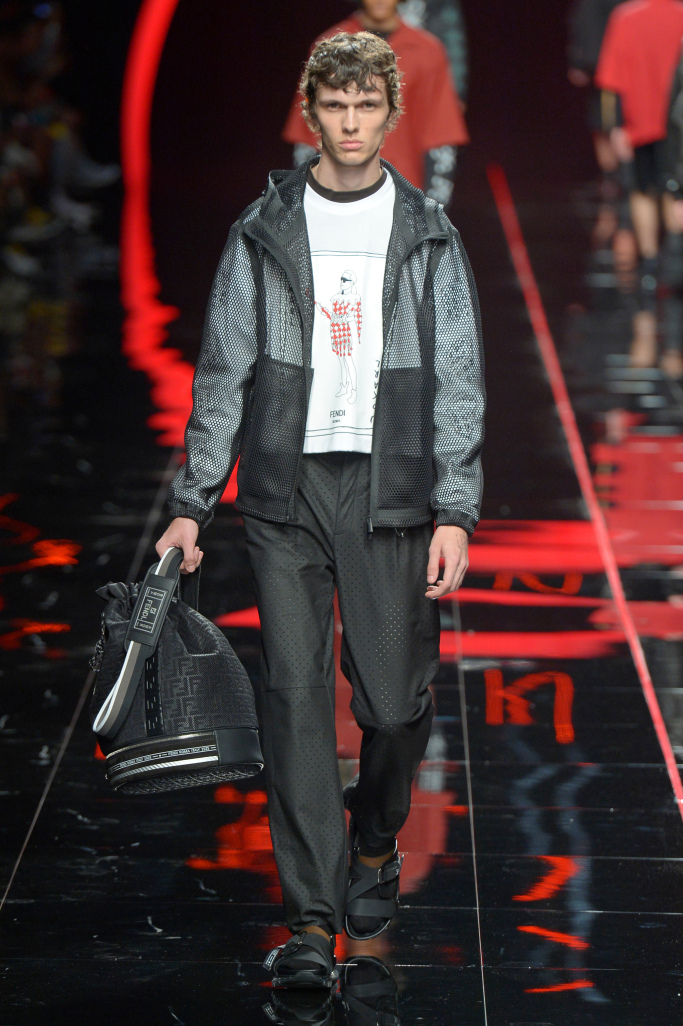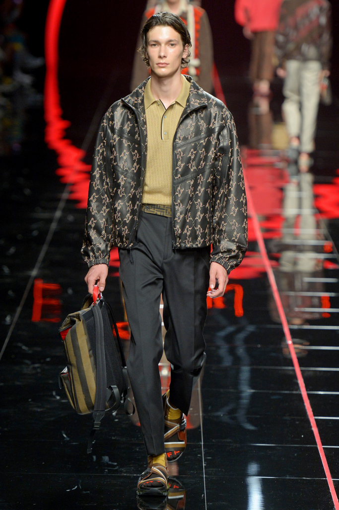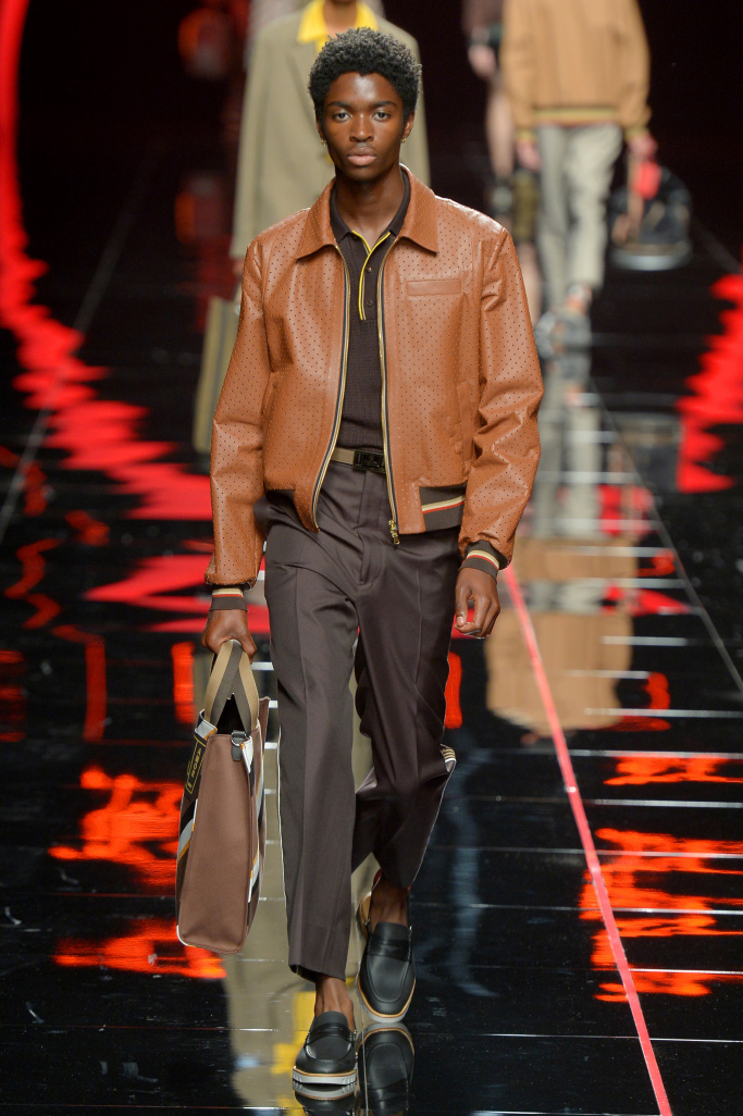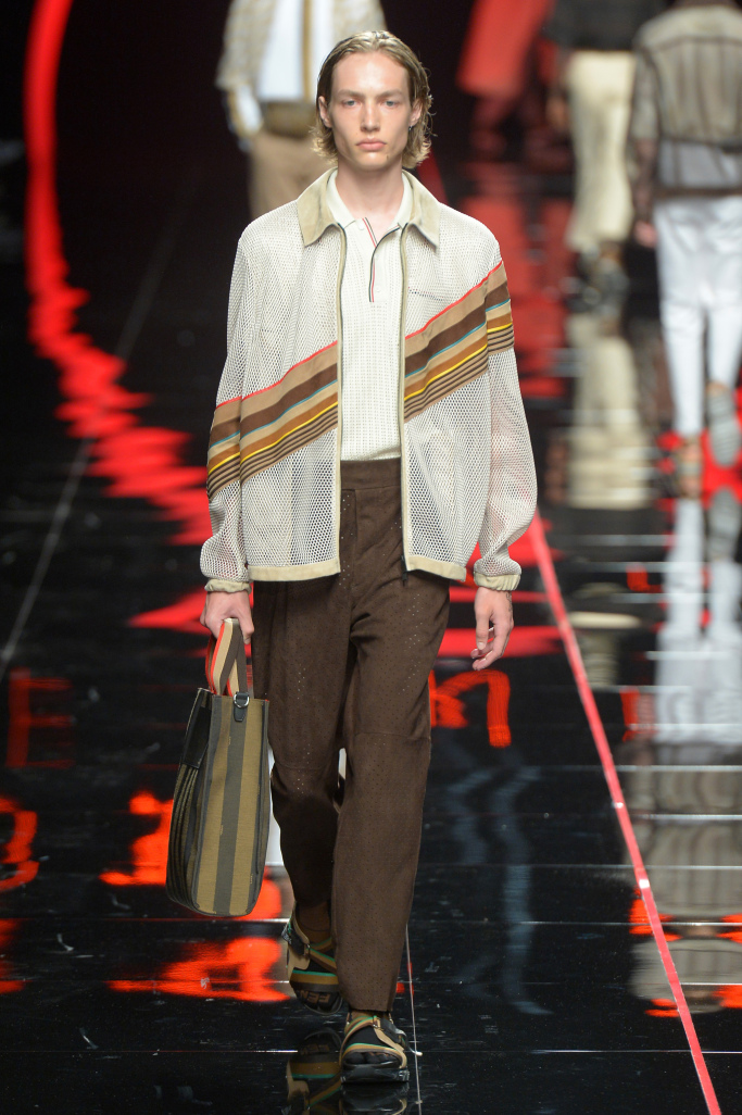 Leather and suede jackets — and even polo shirts — were perforated to lighten up their weight, something the designer has made a signature, while others were printed with sporty, lightning bolt stripes across the front and an anorak had “Fiend” emblazoned across the back.