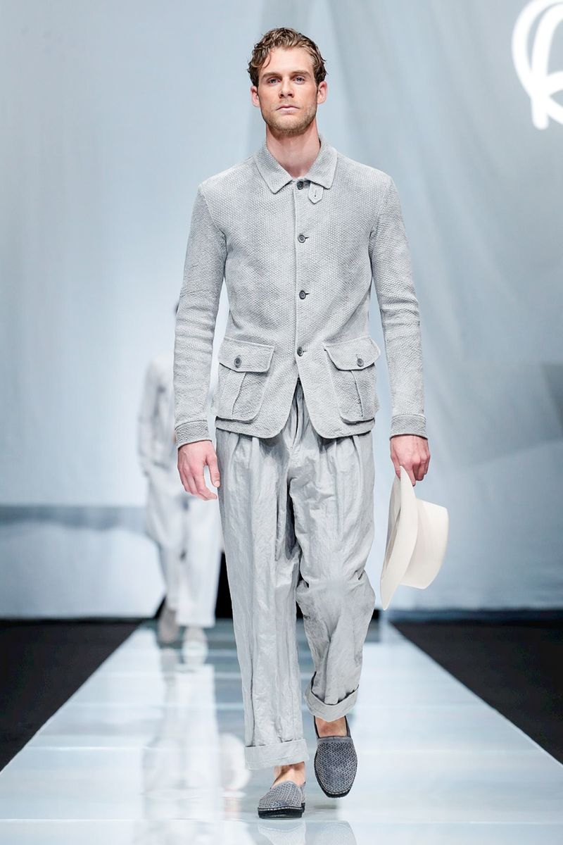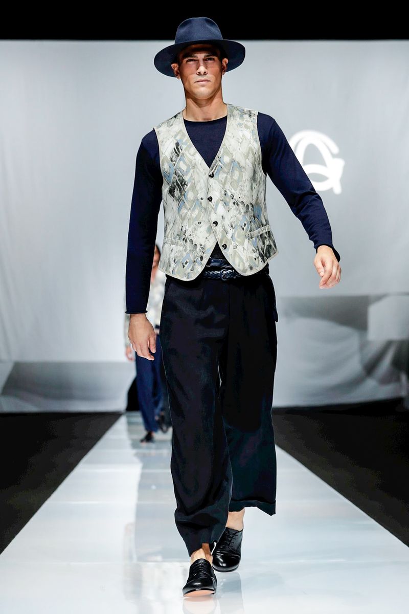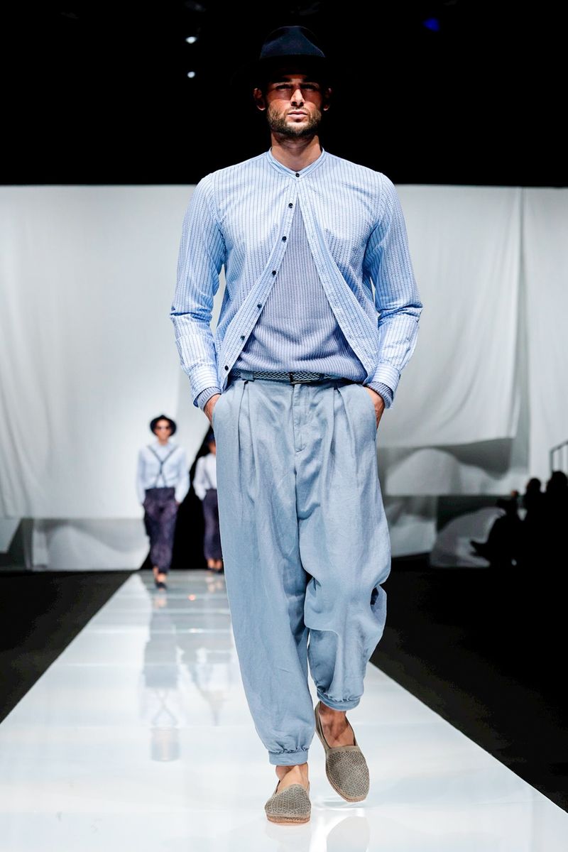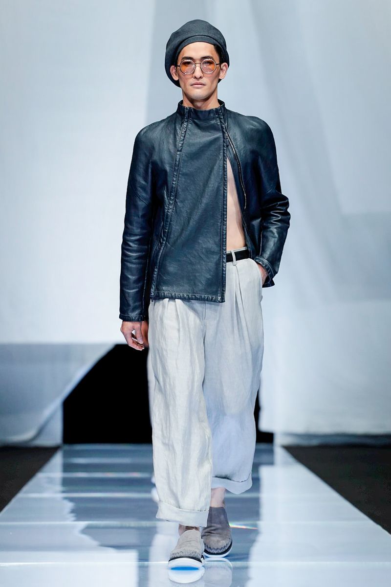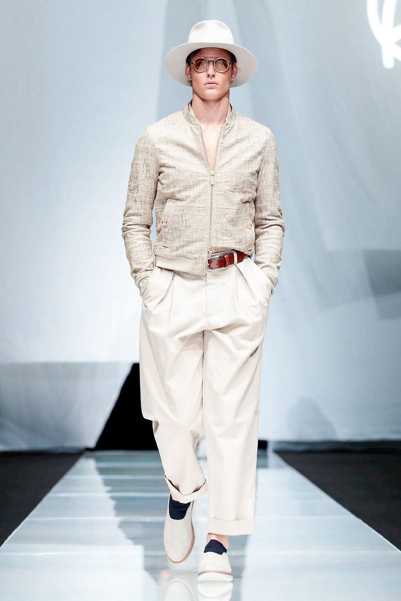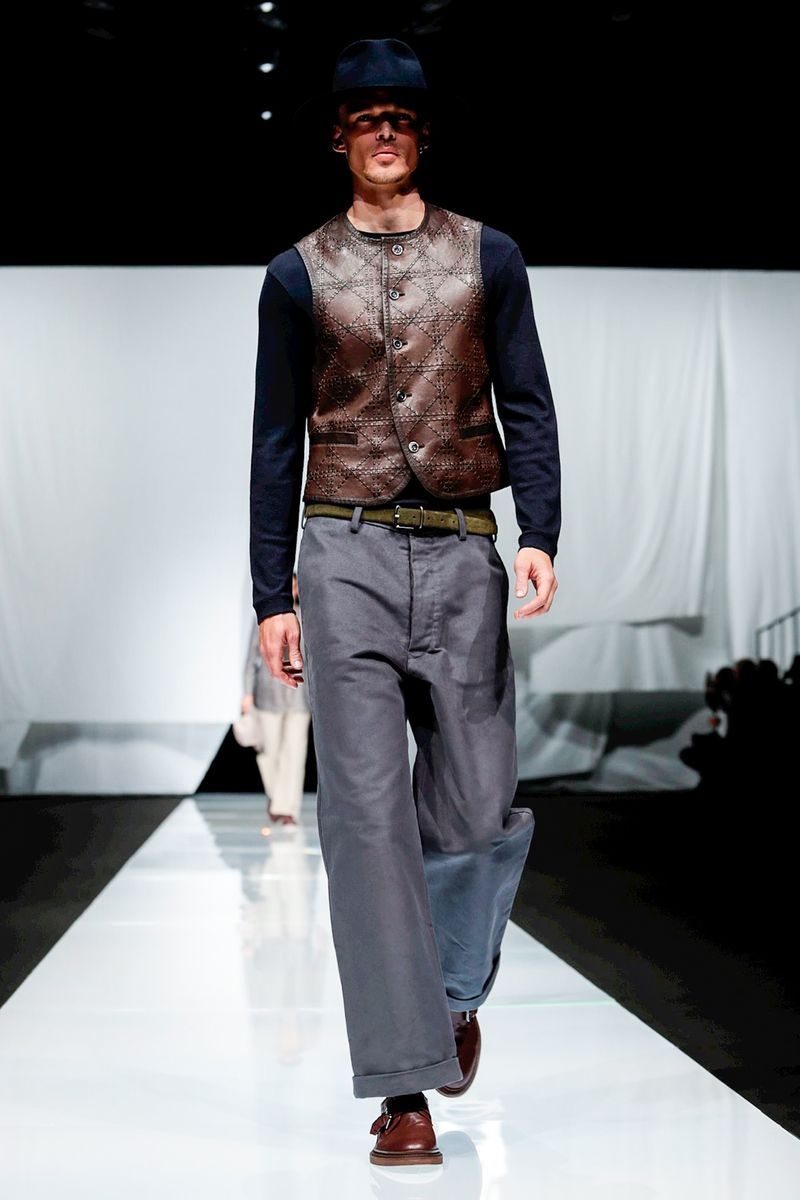 With straw hats, fedoras and leather espadrilles among the accessories, Armani focused on his signature super-soft constructions, from gaucho-style oversized pants worn with stitched leather waistcoats over long-sleeved T-shirts to suede safari jackets.