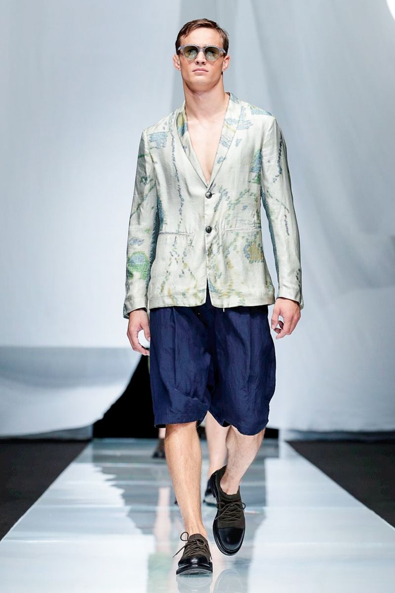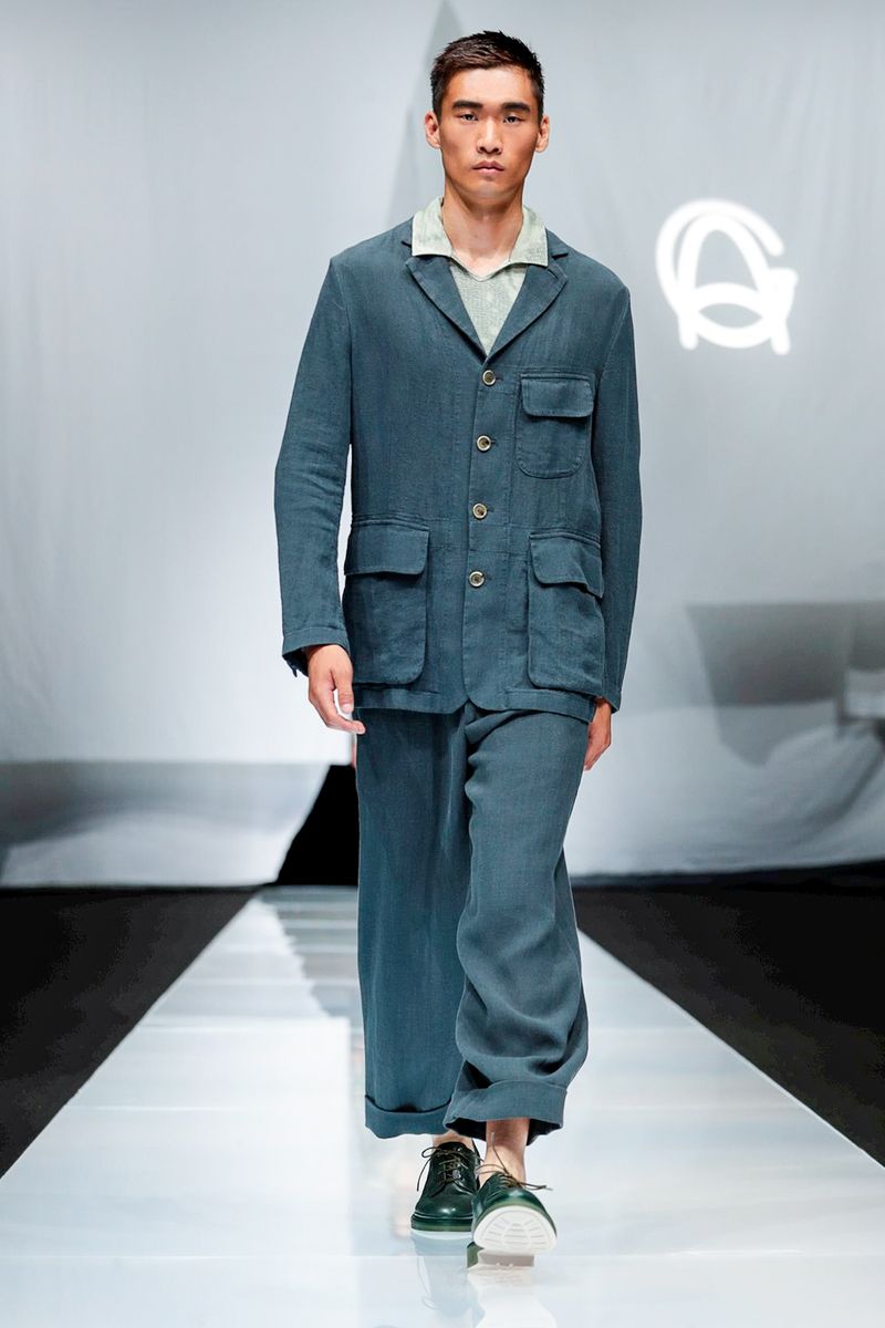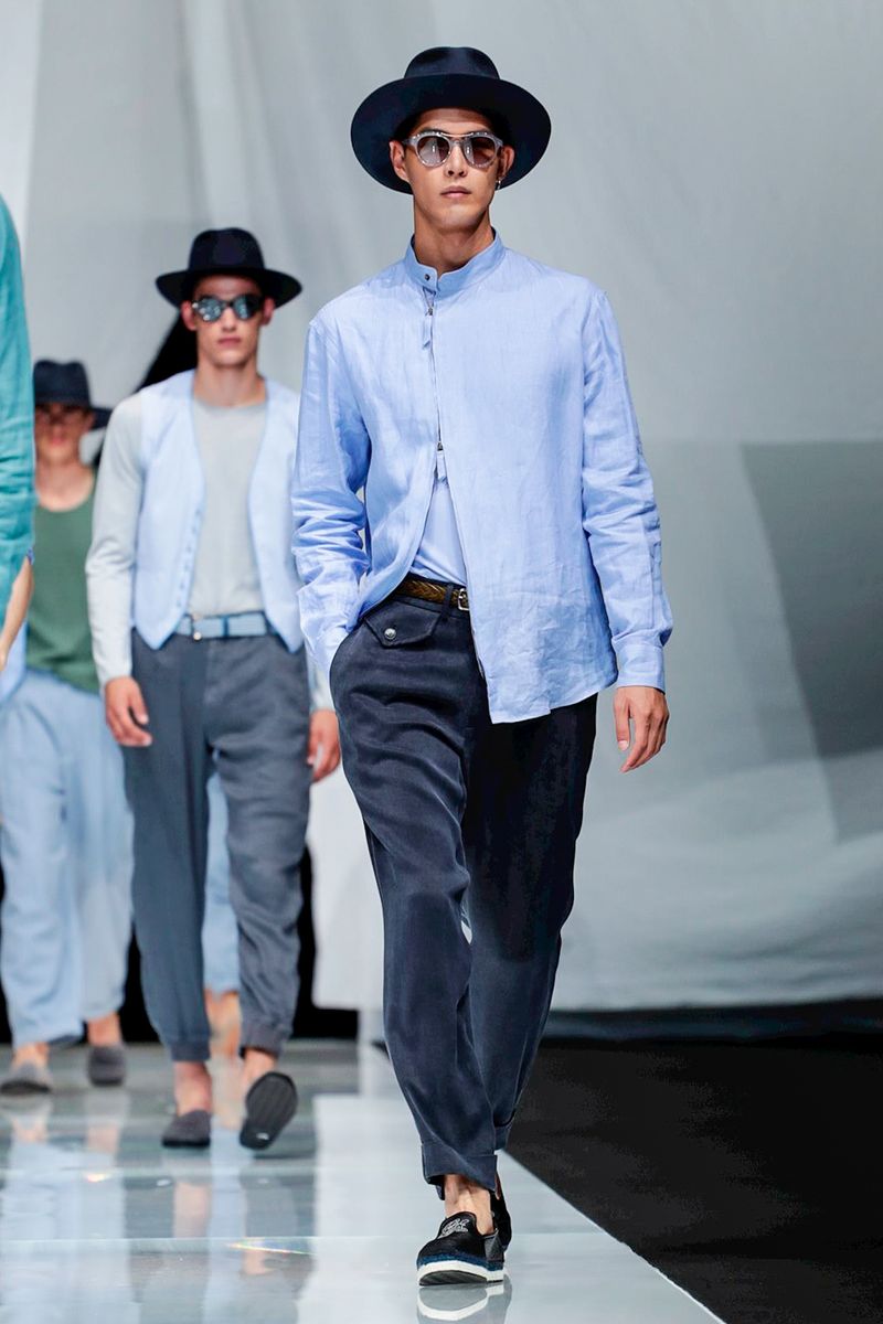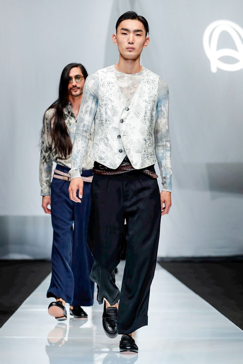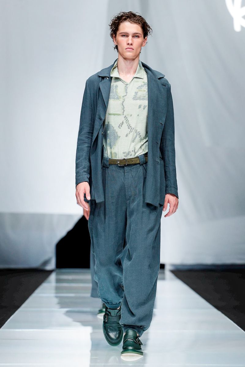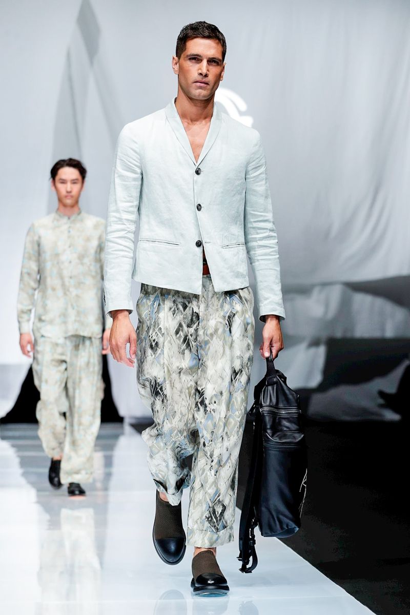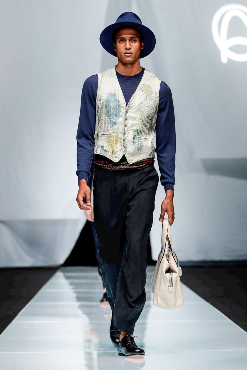 With straw hats, fedoras and leather espadrilles among the accessories, Armani focused on his signature super-soft constructions, from gaucho-style oversized pants worn with stitched leather waistcoats over long-sleeved T-shirts to suede safari jackets.