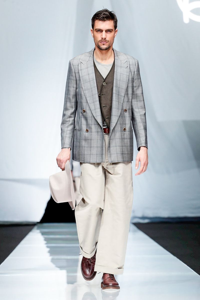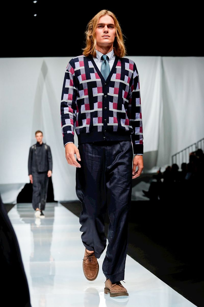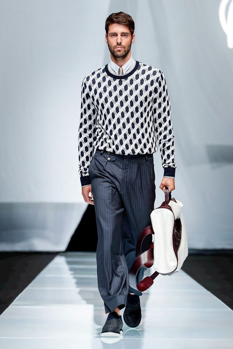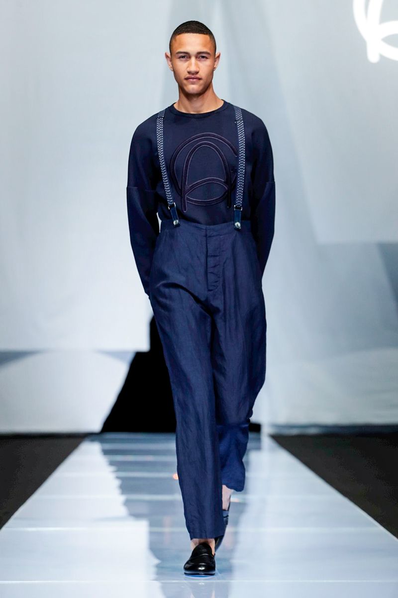A look combining crisp cotton pants worn with suspenders and patterned knitwear was another pure Eighties Armani moment, but felt timeless.