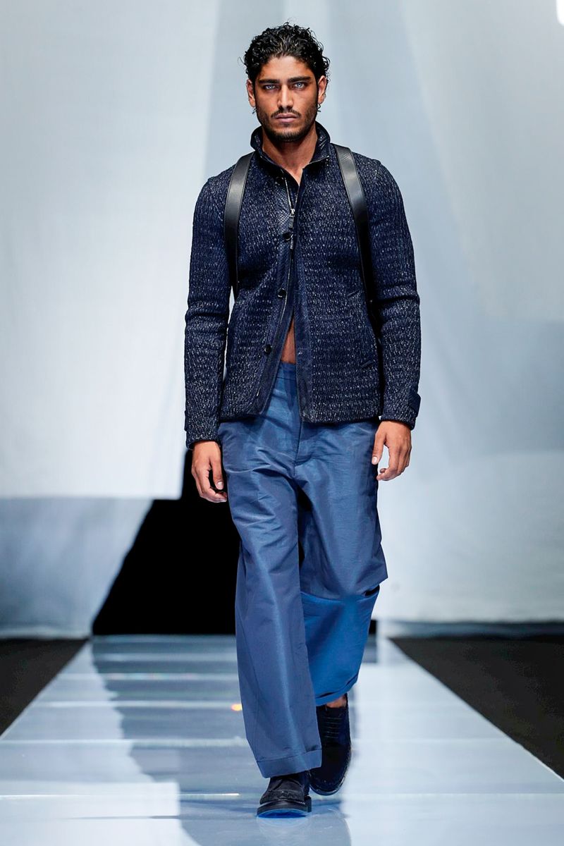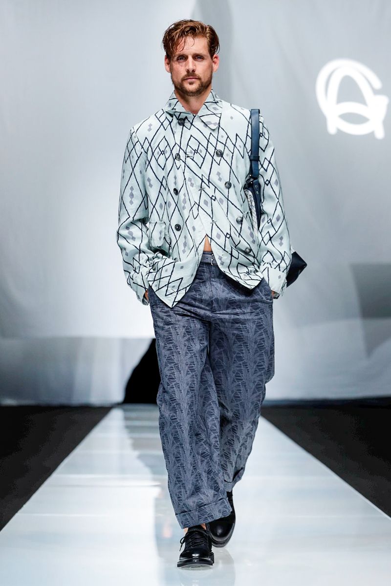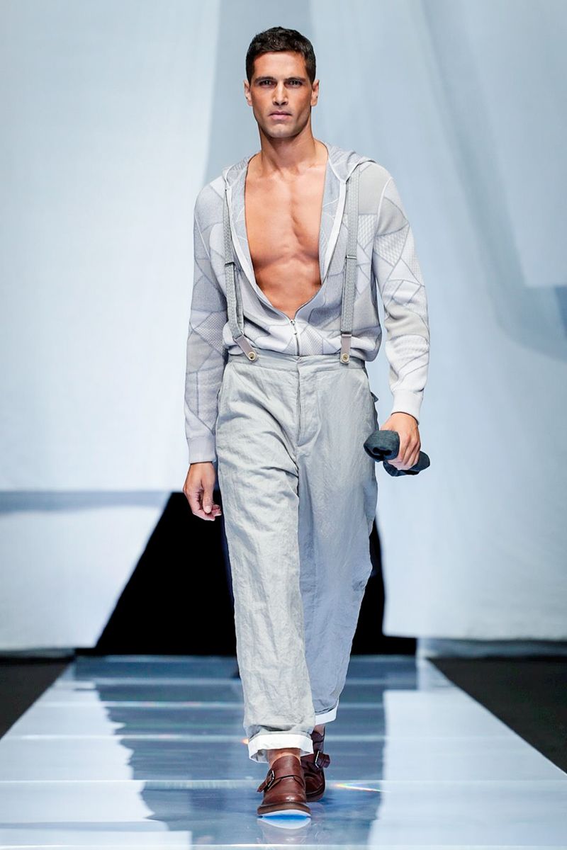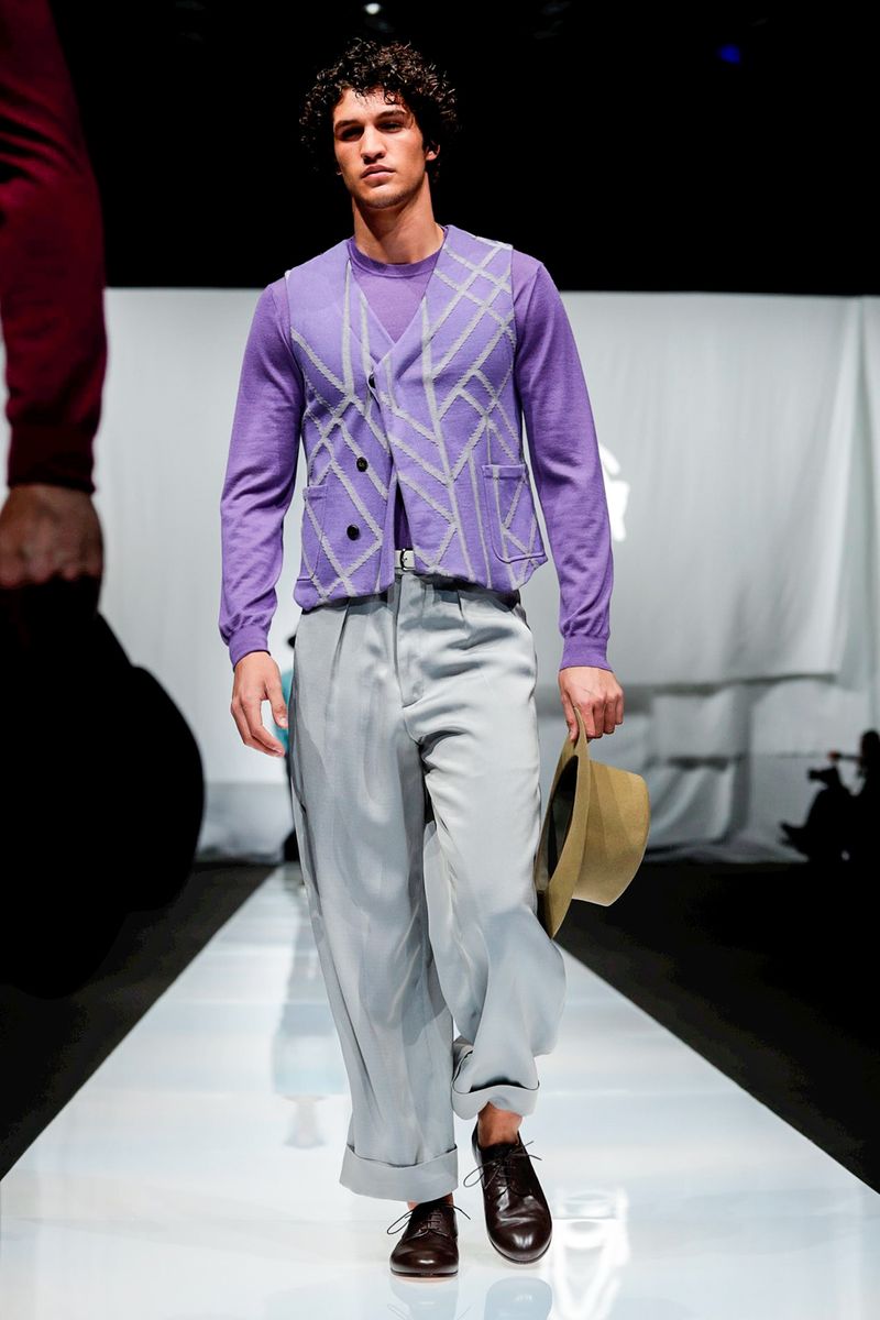 A look combining crisp cotton pants worn with suspenders and patterned knitwear was another pure Eighties Armani moment, but felt timeless.