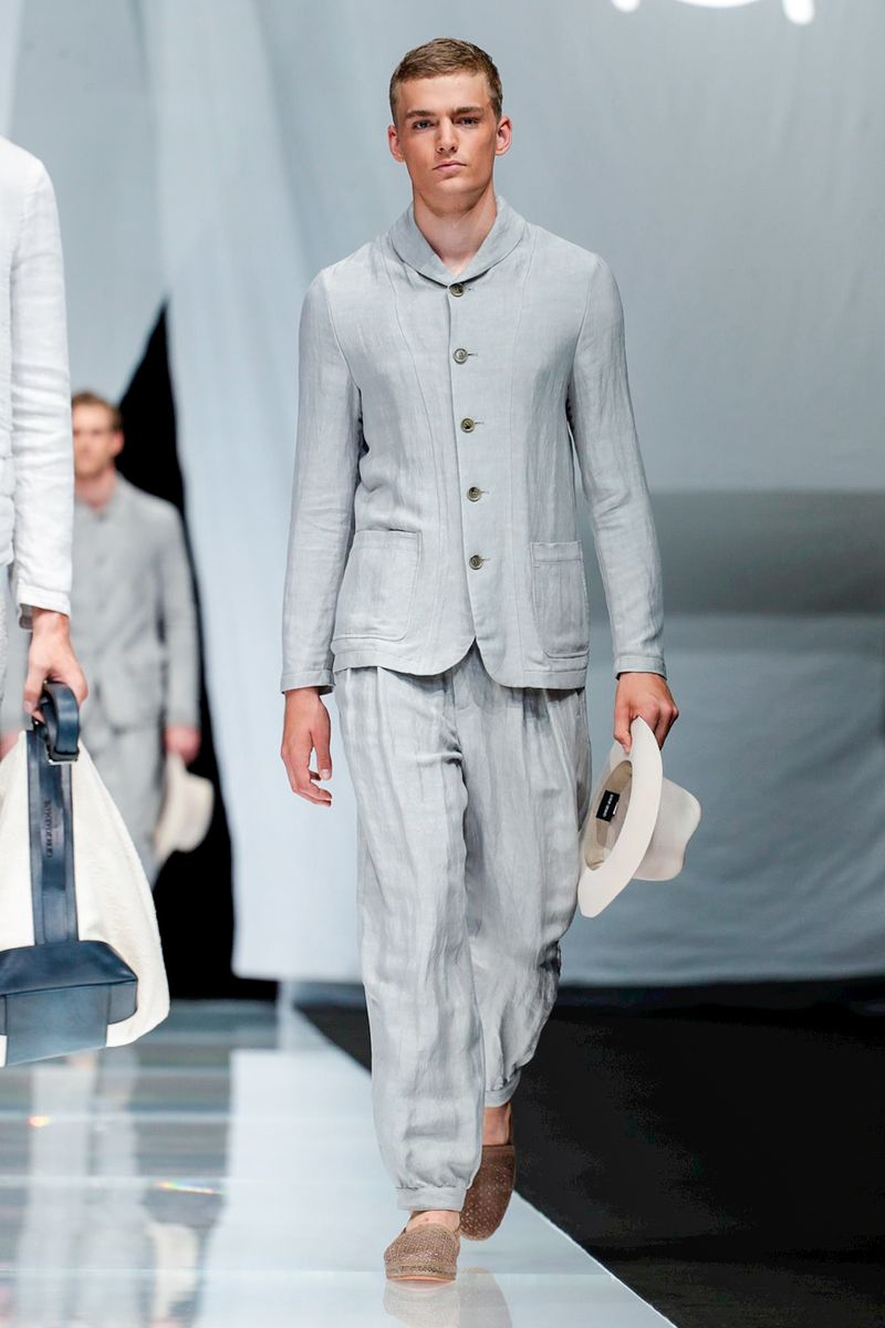 With straw hats, fedoras and leather espadrilles among the accessories, Armani focused on his signature super-soft constructions, from gaucho-style oversized pants worn with stitched leather waistcoats over long-sleeved T-shirts to suede safari jackets.