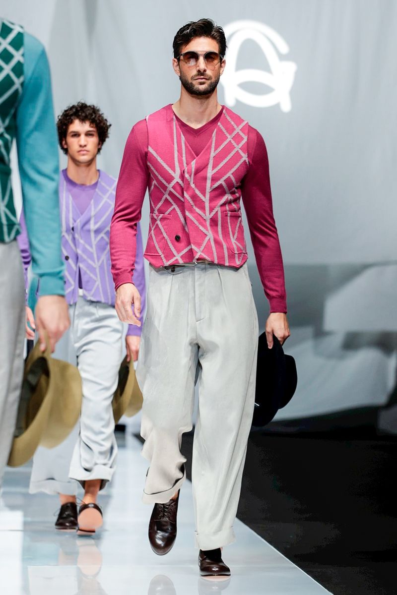 A look combining crisp cotton pants worn with suspenders and patterned knitwear was another pure Eighties Armani moment, but felt timeless.