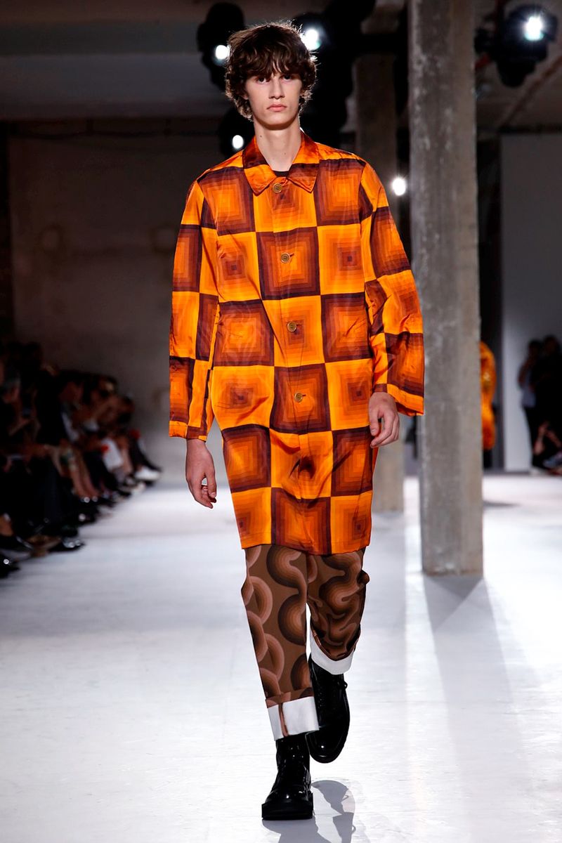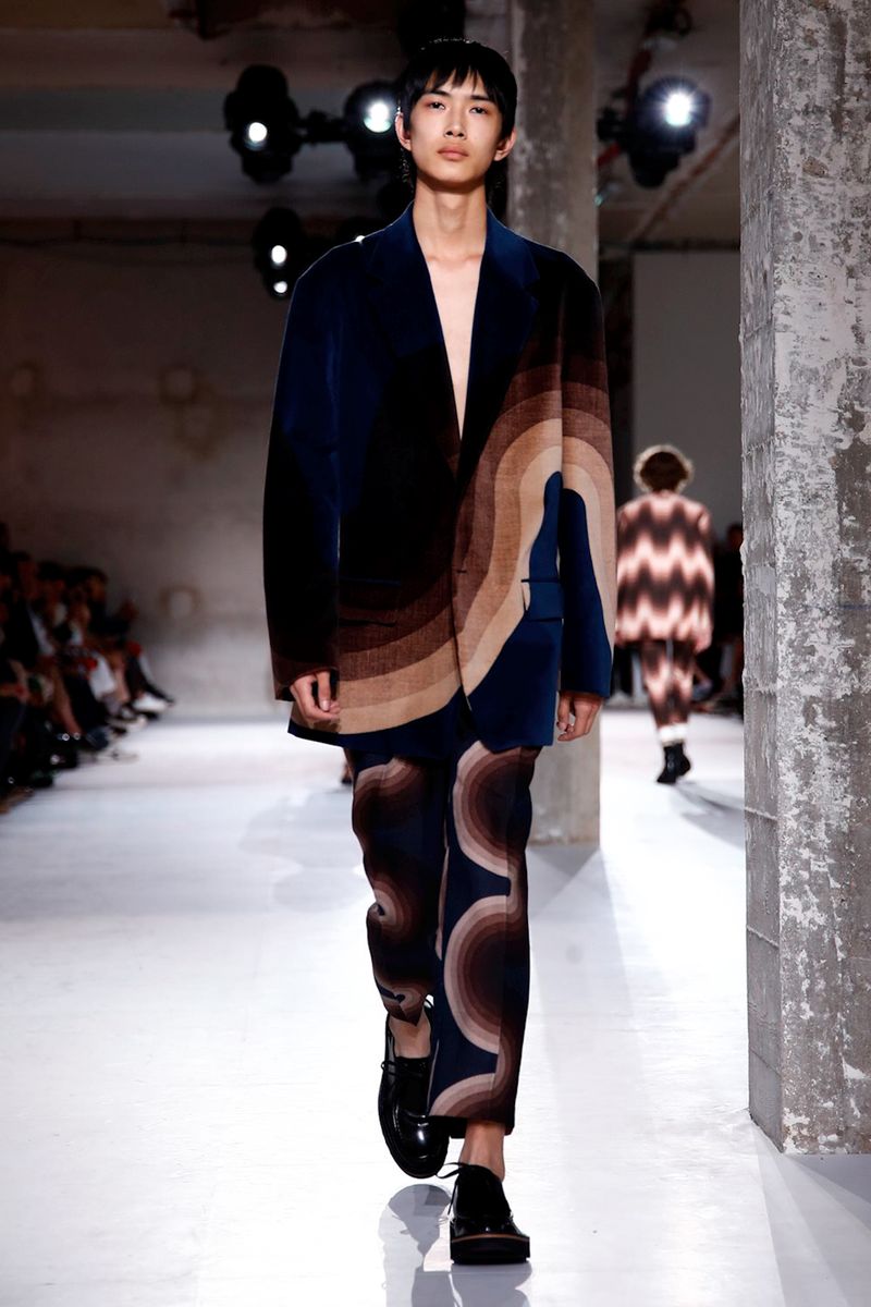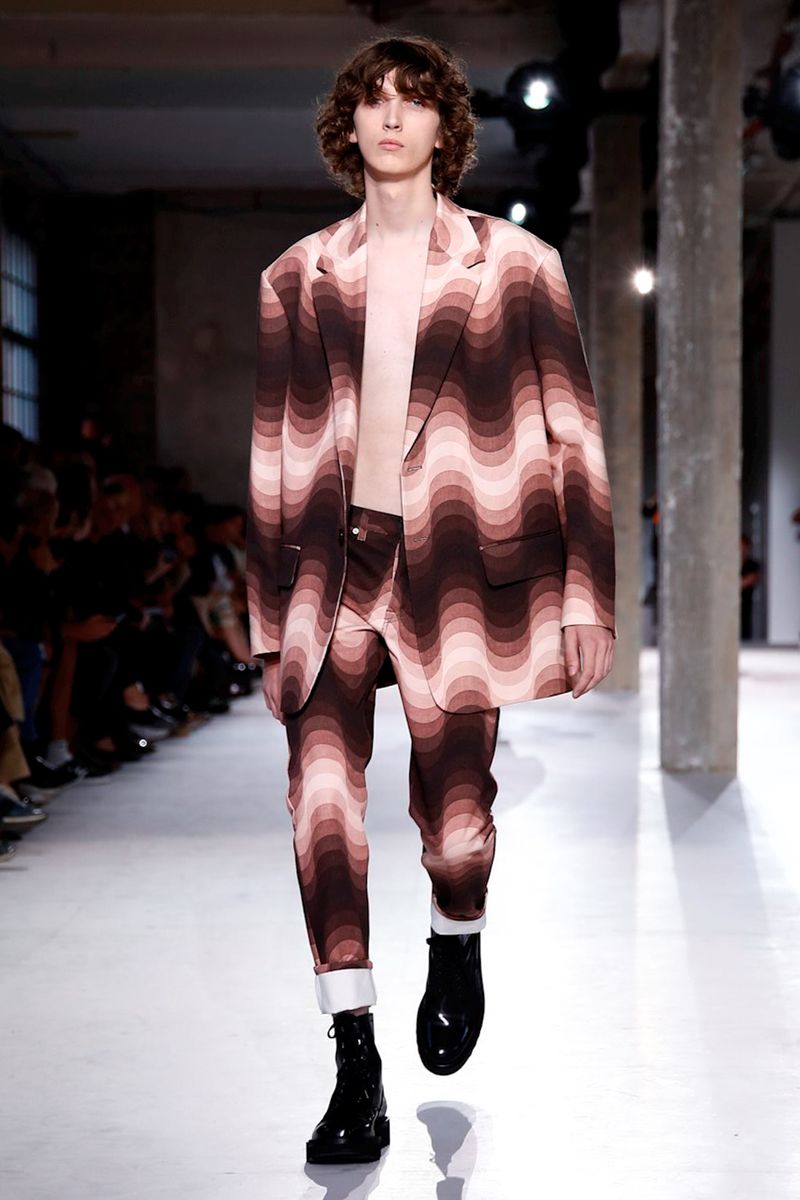 Dries Van Noten Spring/Summer 2019 Paris slipped back to the Seventies with a load of lava lamp colors, thick swirls and sine waves, fruits of a collaboration with the estate of Verner Panton.