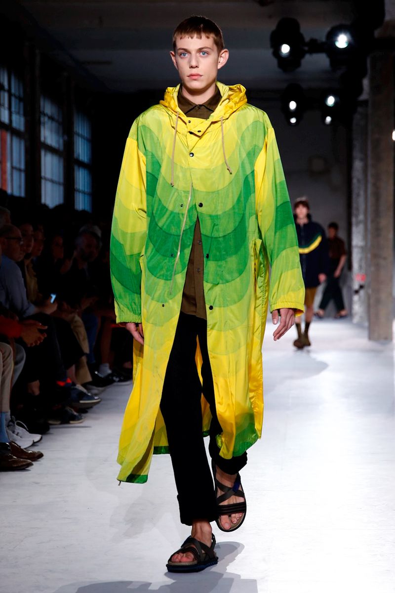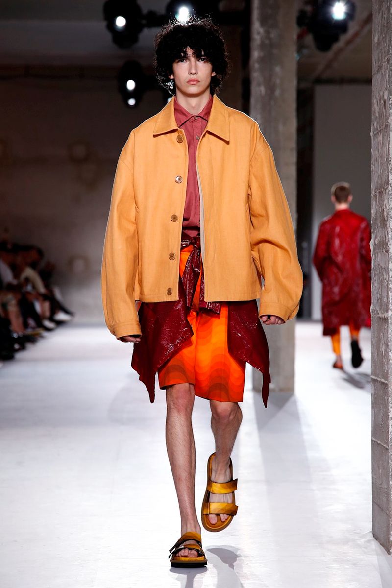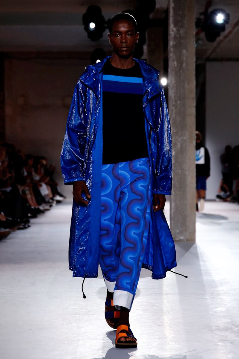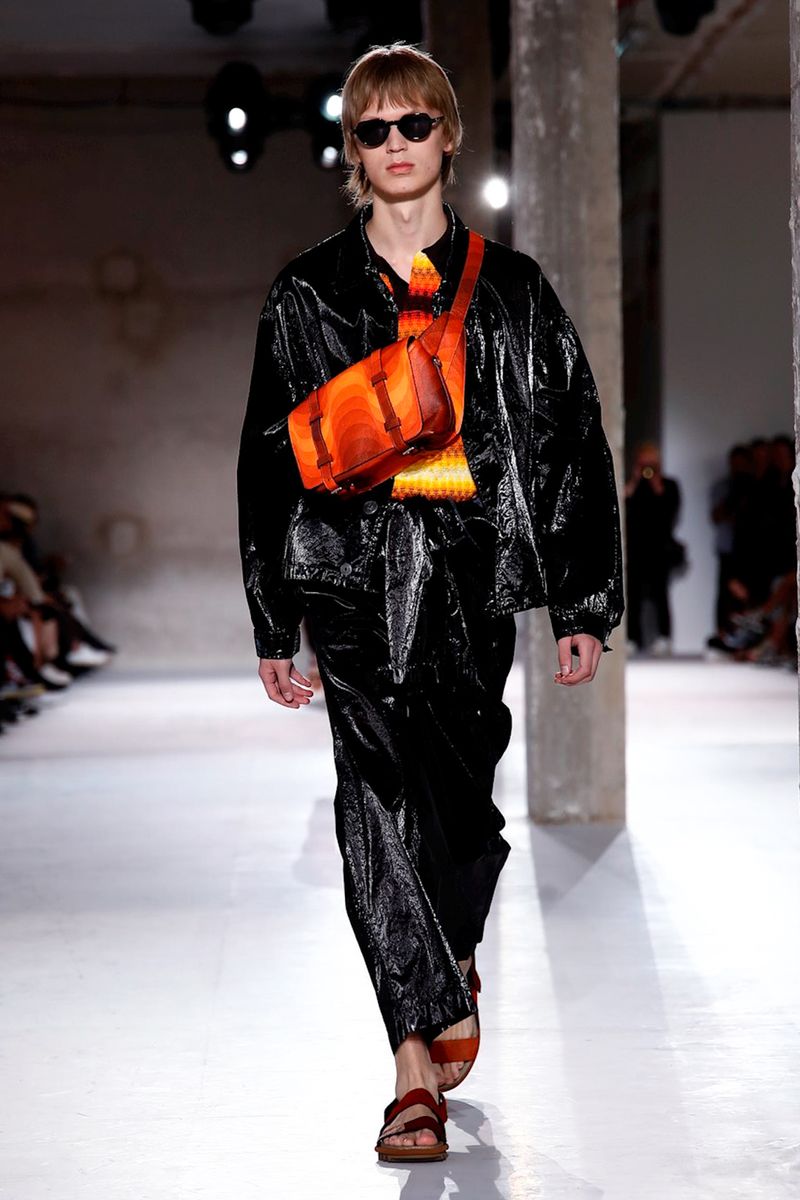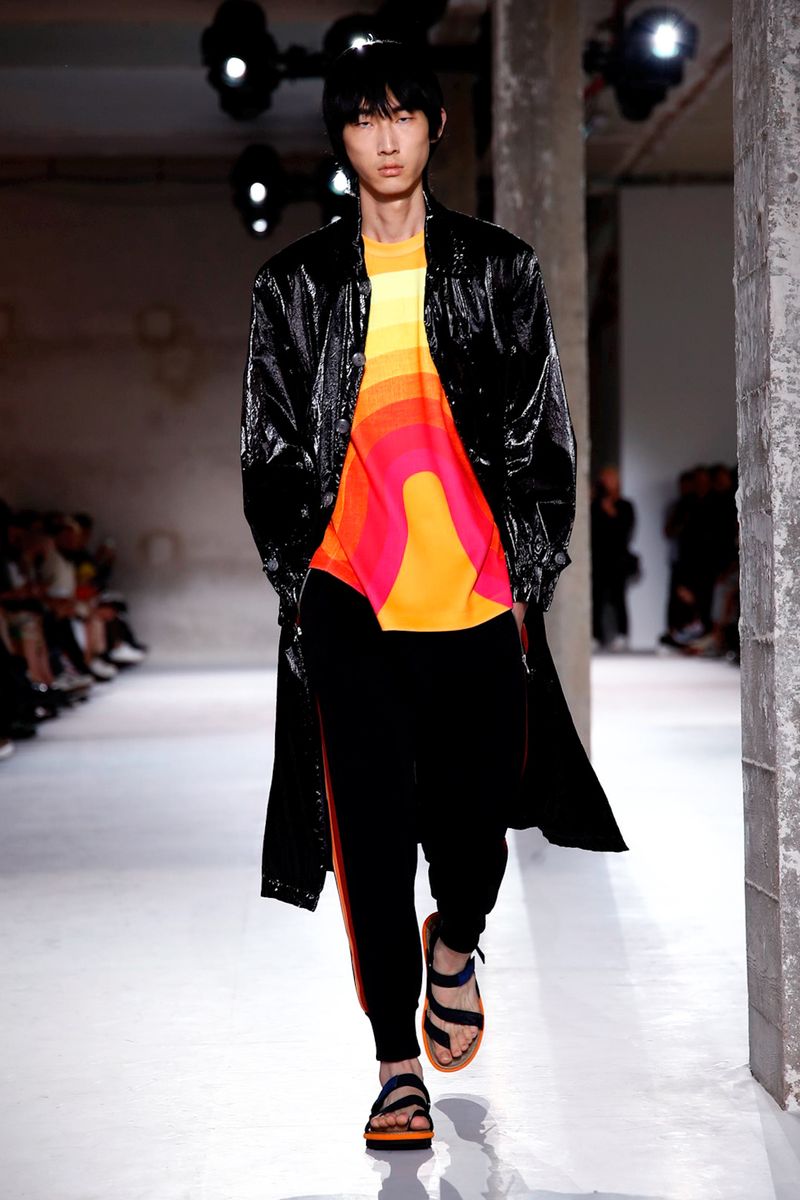 He also splashed those primary hues across crinkly, cellophane-like anoraks, while those same groovy patterns popped on a leather backpack that looked as if it was covered in flames and slip-on sneakers.