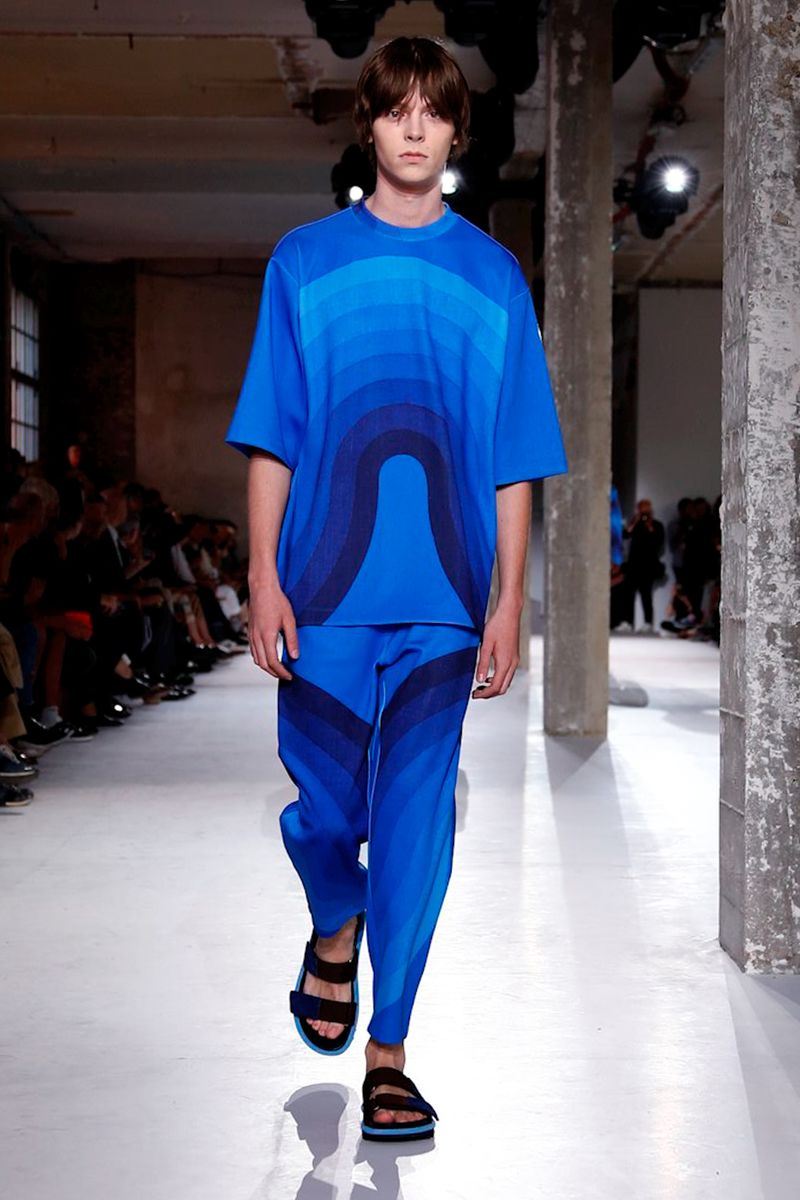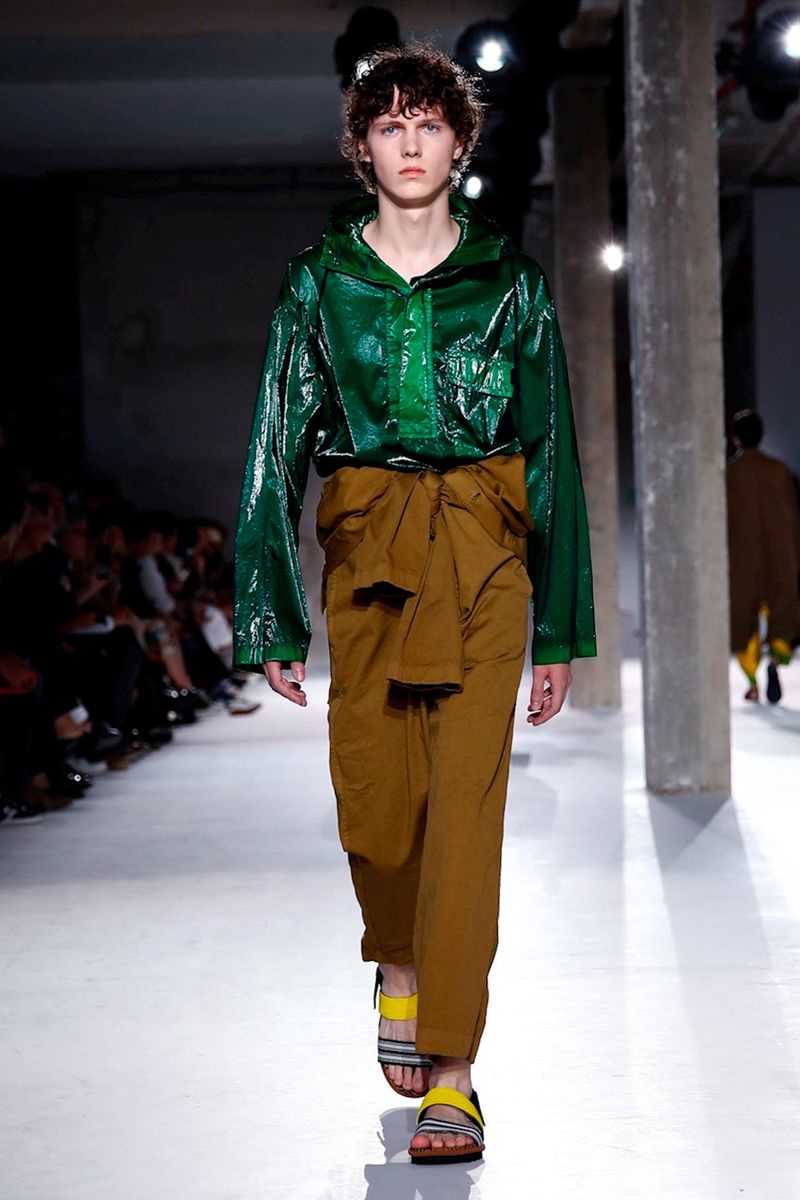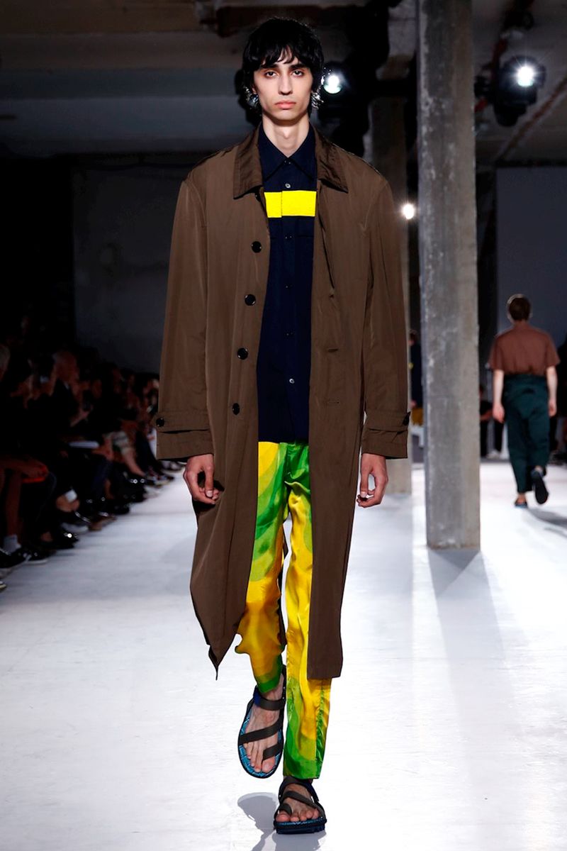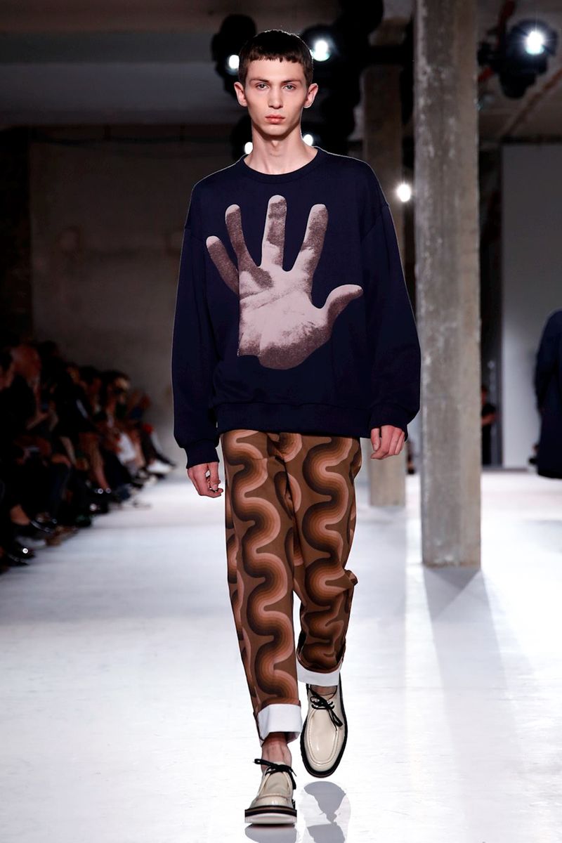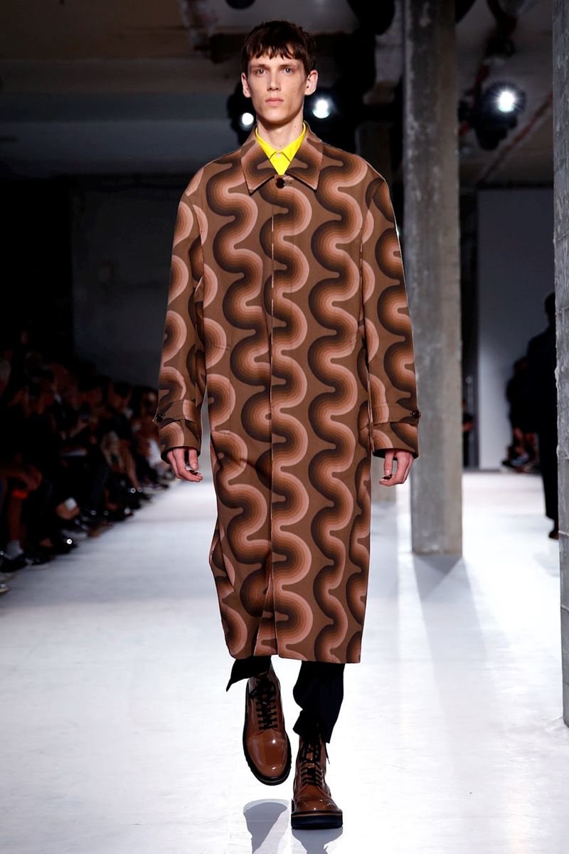 He also splashed those primary hues across crinkly, cellophane-like anoraks, while those same groovy patterns popped on a leather backpack that looked as if it was covered in flames and slip-on sneakers.