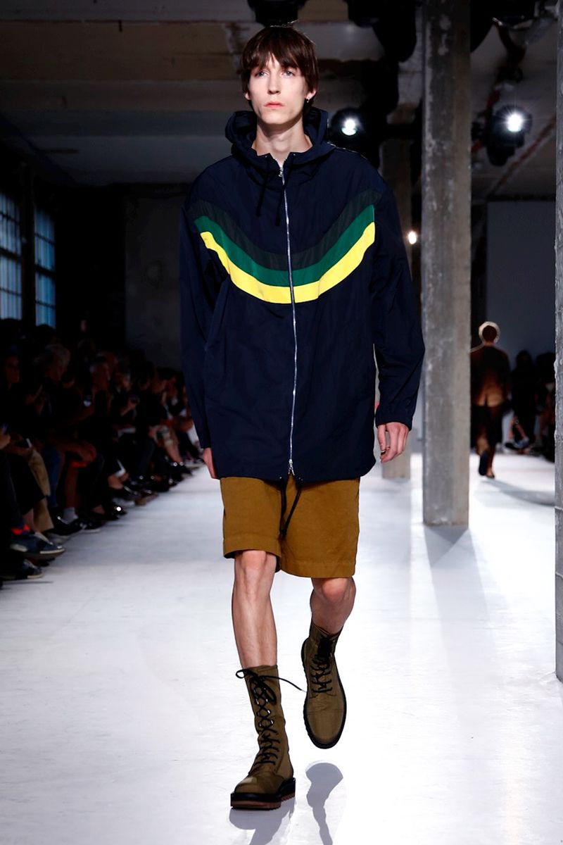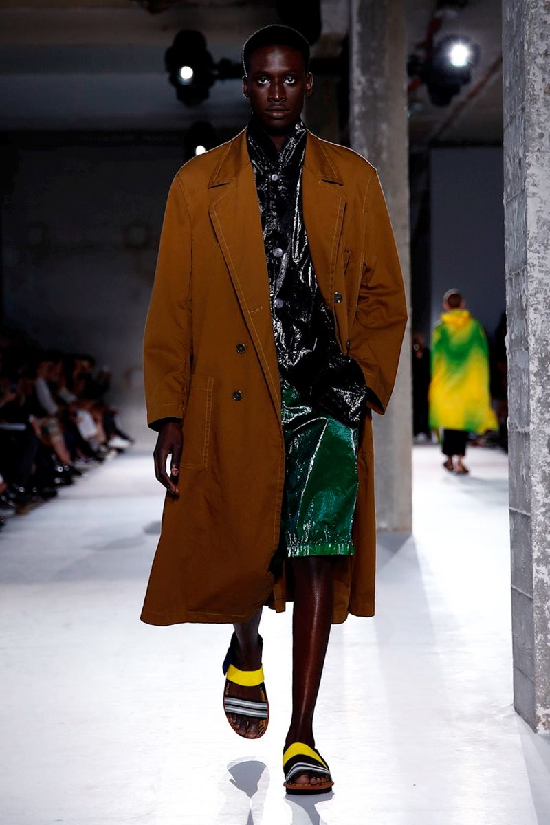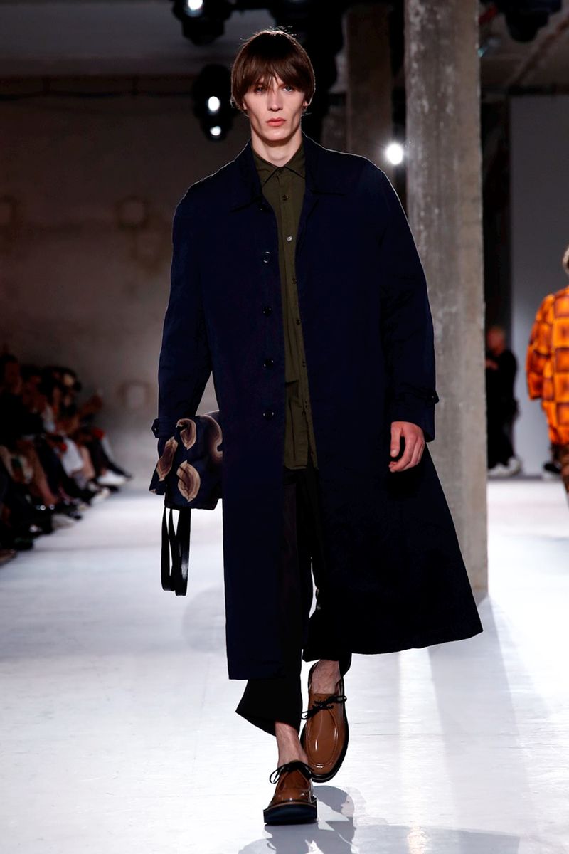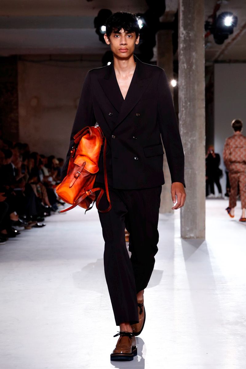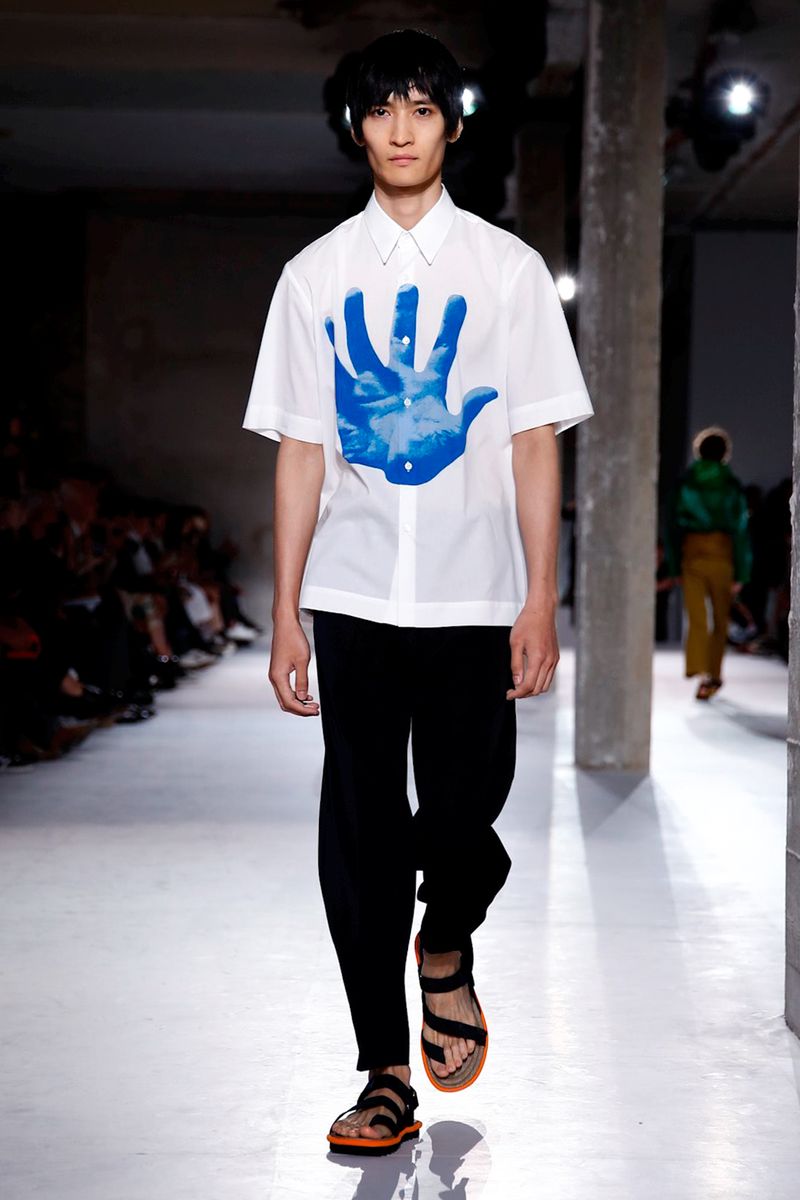 He also splashed those primary hues across crinkly, cellophane-like anoraks, while those same groovy patterns popped on a leather backpack that looked as if it was covered in flames and slip-on sneakers.