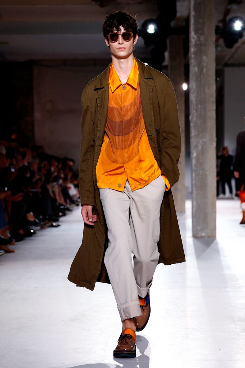 There were some monochrome looks, too — to cleanse the palate — as in a textured check suit in a faded shade of corn and a lineup of delicately rumpled cotton overcoats in tangerine or dark blue.