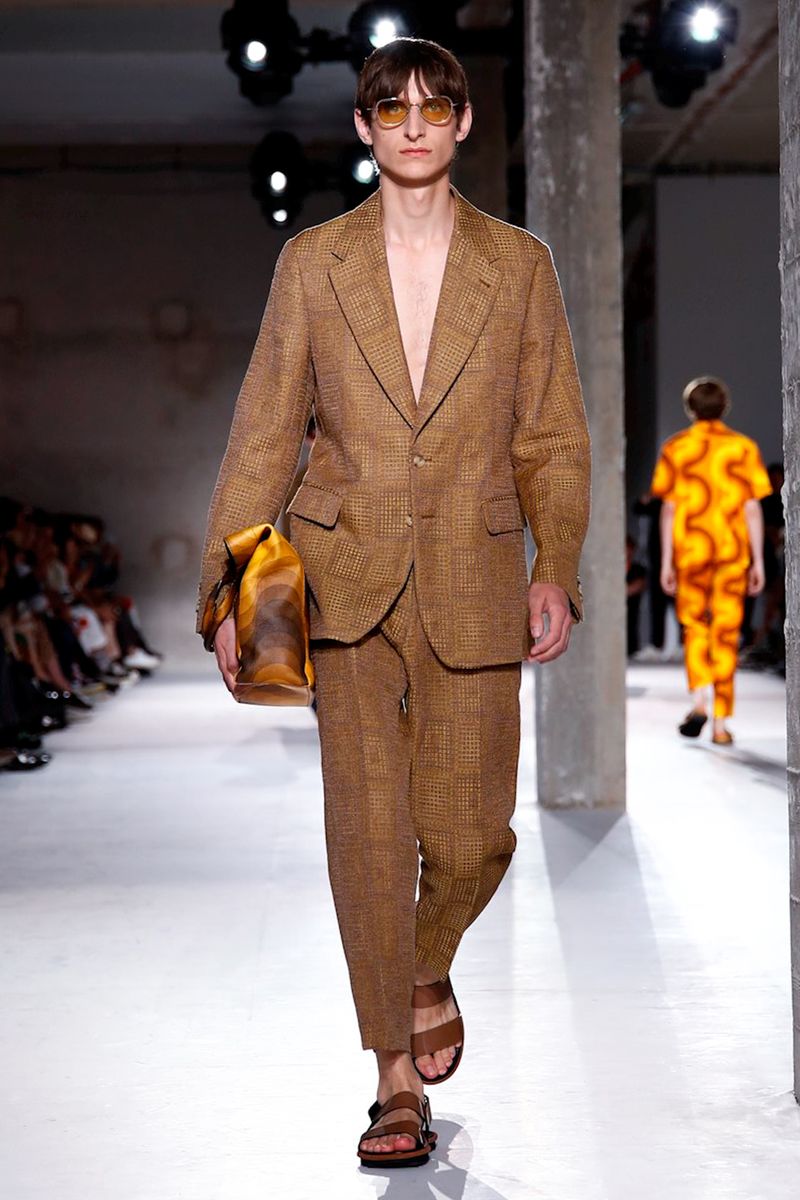 There were some monochrome looks, too — to cleanse the palate — as in a textured check suit in a faded shade of corn and a lineup of delicately rumpled cotton overcoats in tangerine or dark blue.