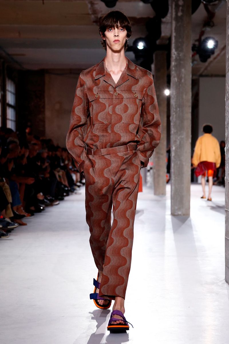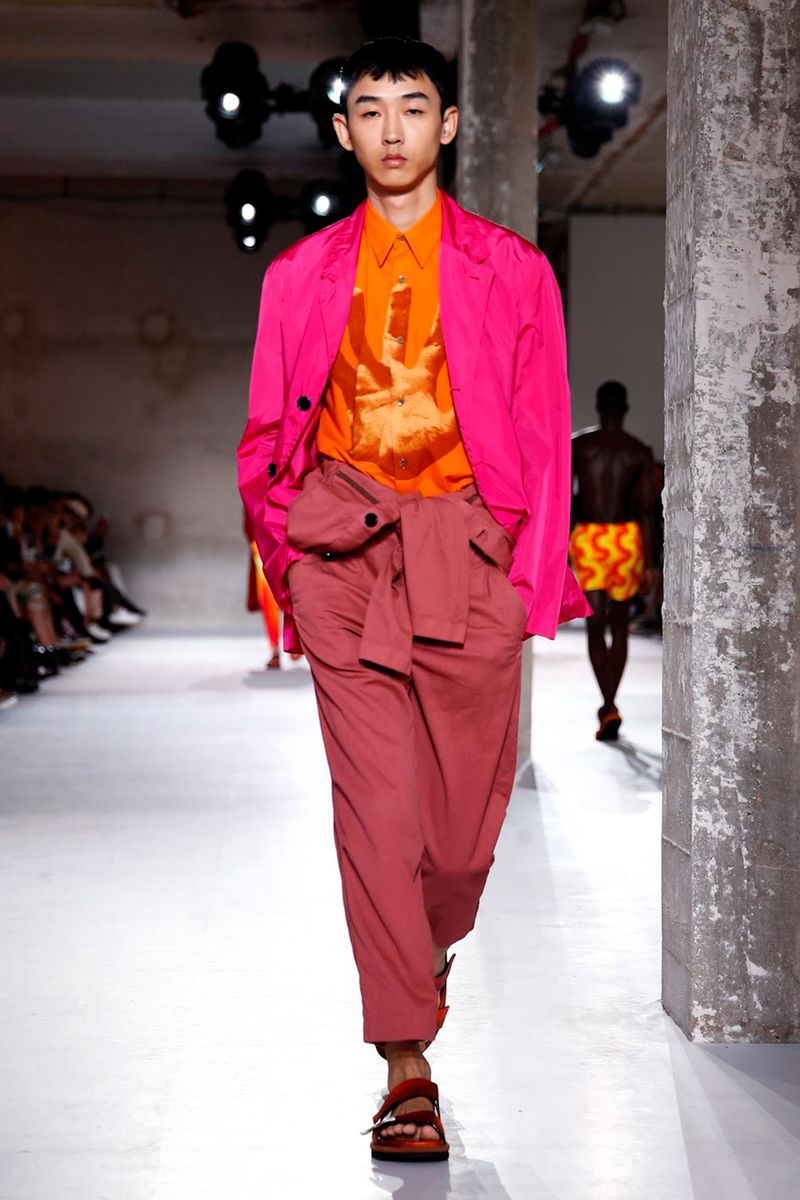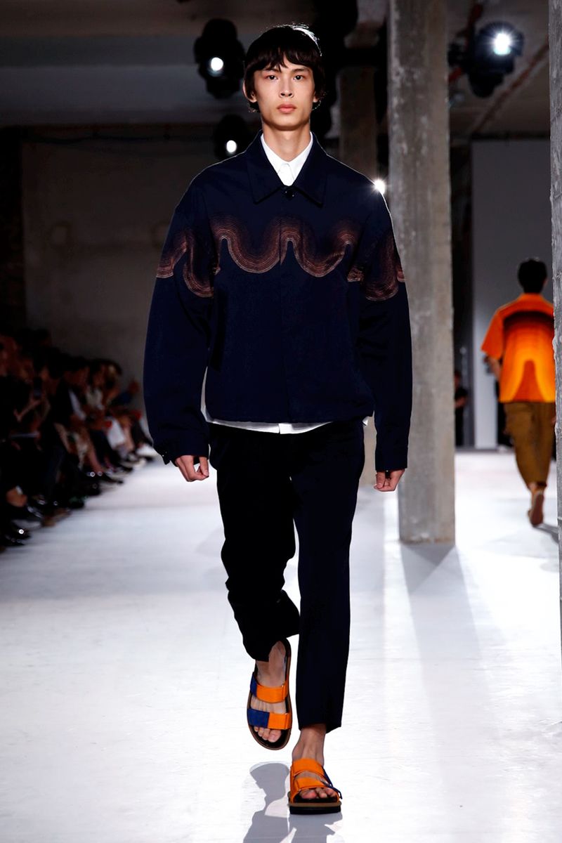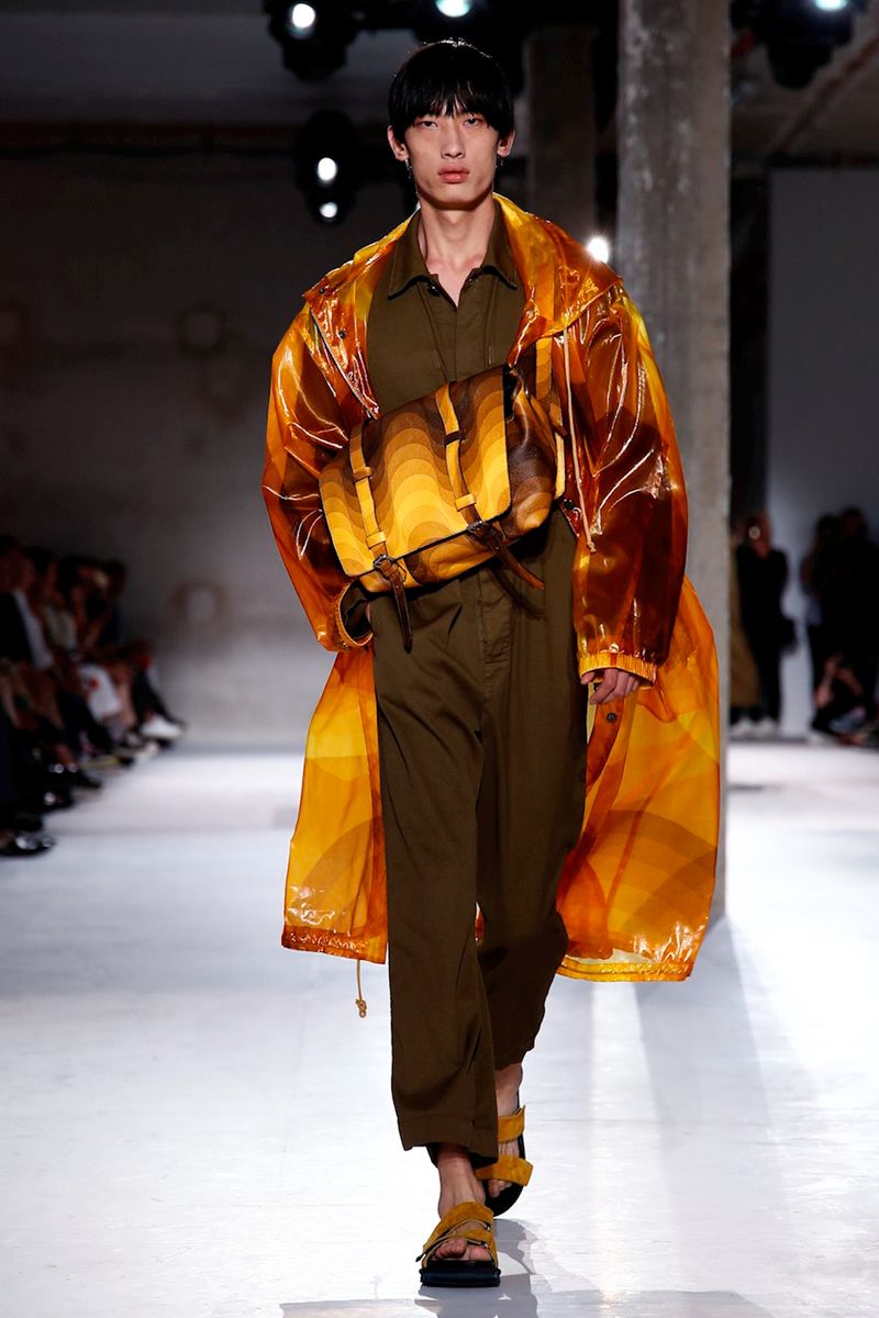 He also splashed those primary hues across crinkly, cellophane-like anoraks, while those same groovy patterns popped on a leather backpack that looked as if it was covered in flames and slip-on sneakers.
