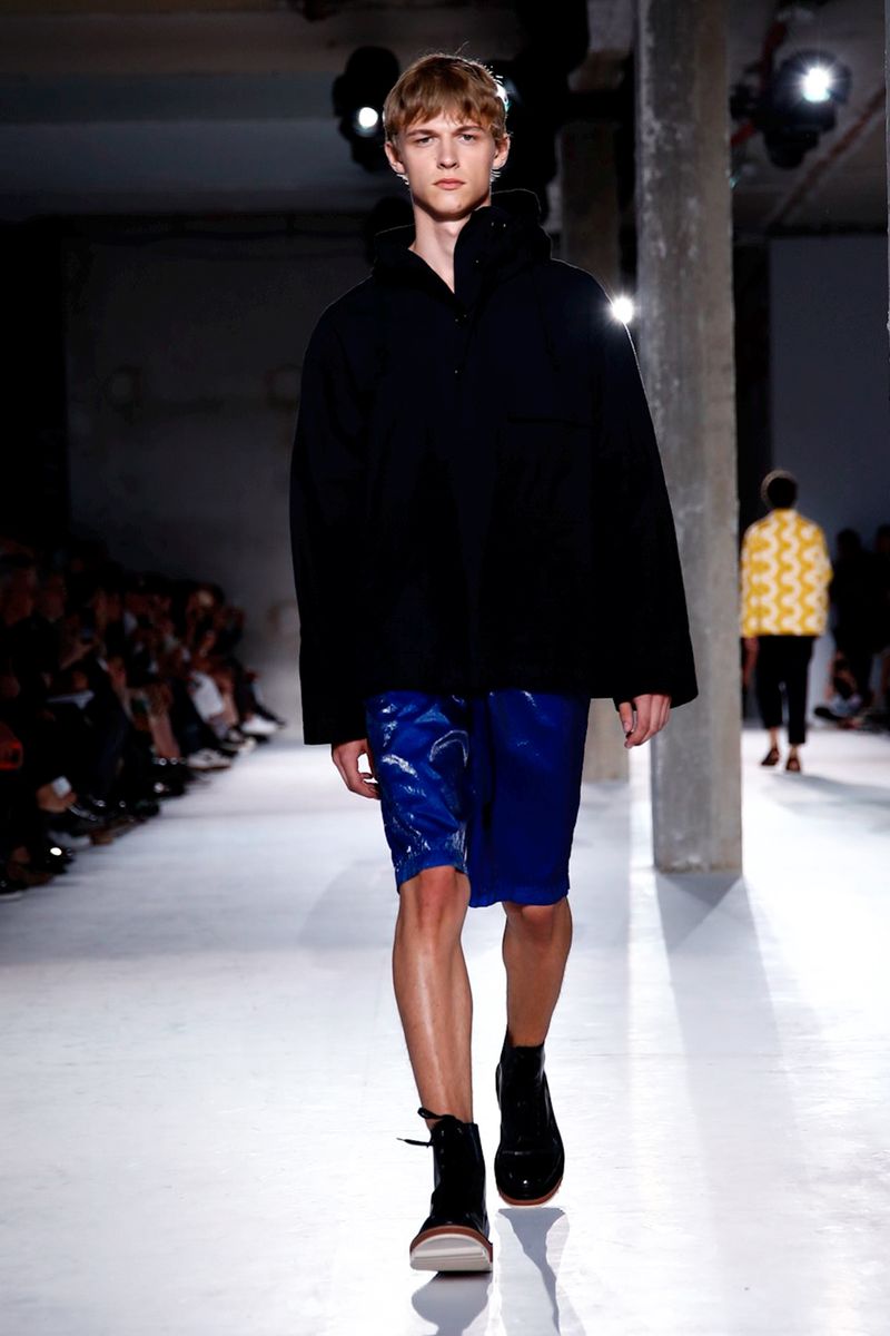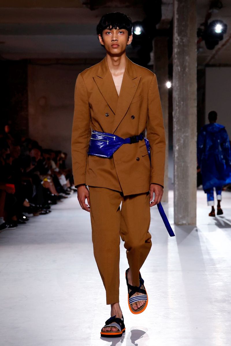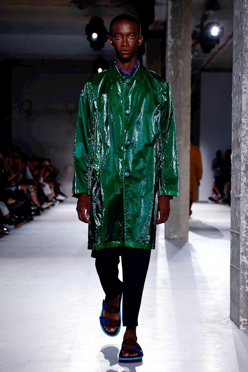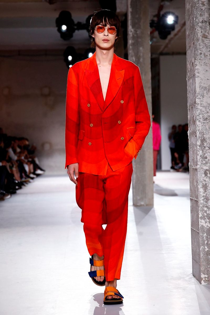 He also splashed those primary hues across crinkly, cellophane-like anoraks, while those same groovy patterns popped on a leather backpack that looked as if it was covered in flames and slip-on sneakers.