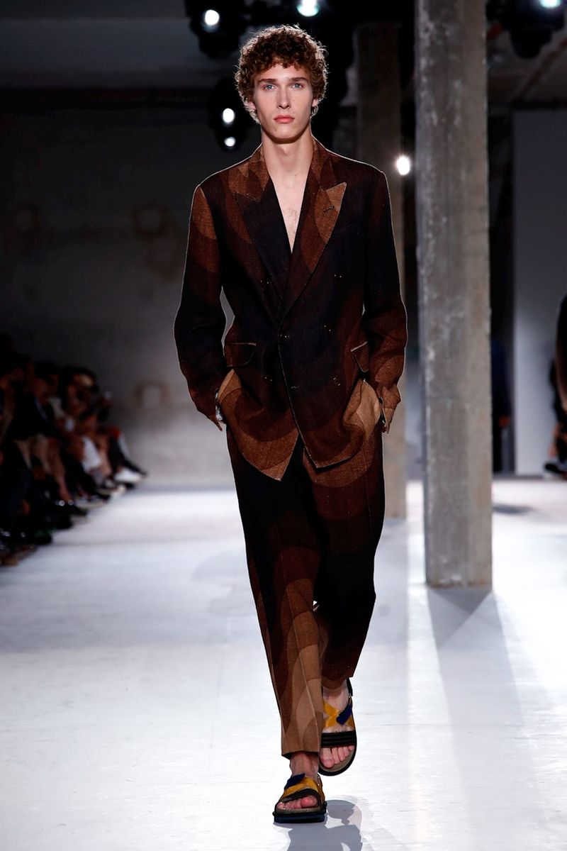 Van Noten worked those shades into Panton’s undulating patterns on everything from swimming trunks to tailored suits with cropped trousers.