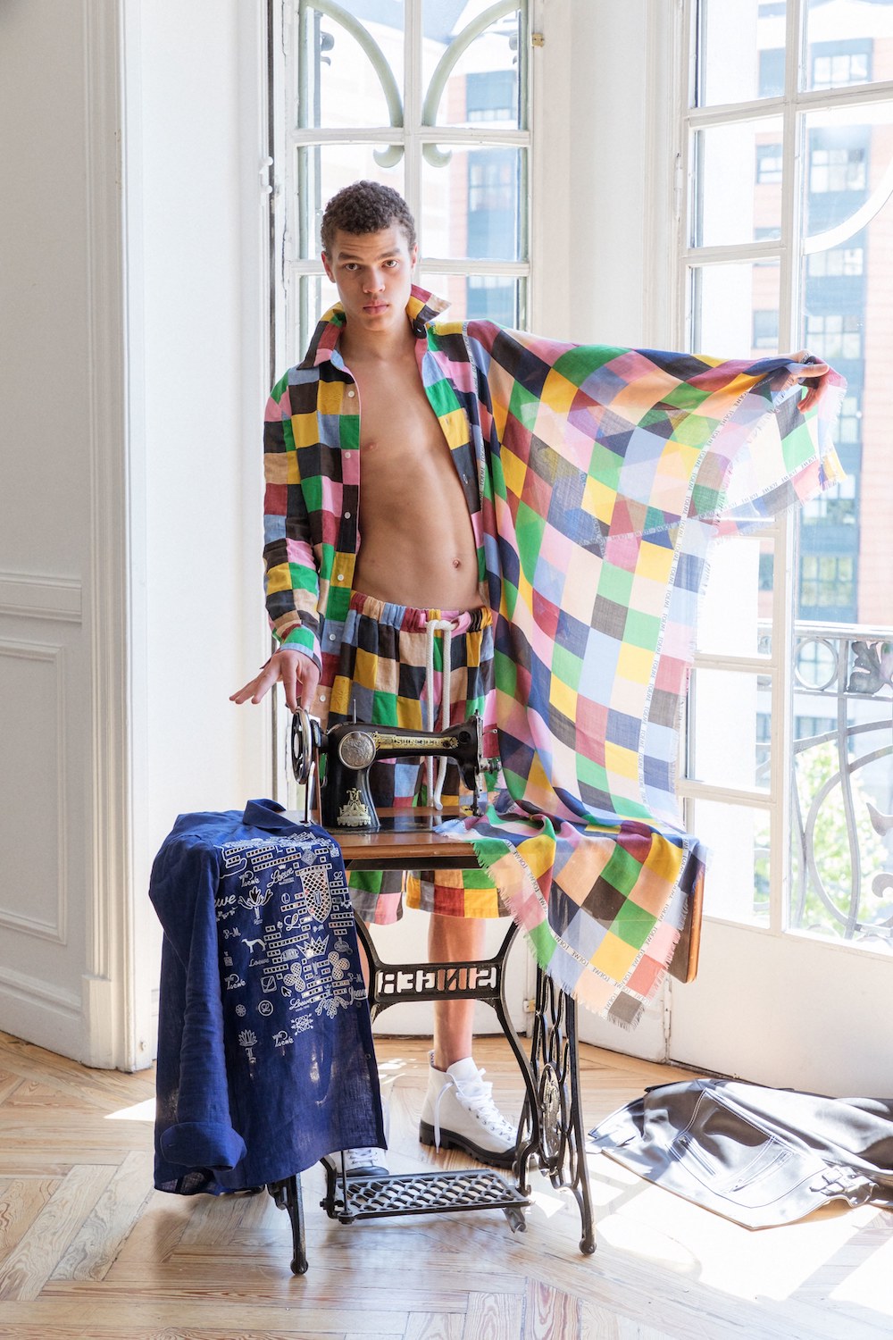 The collection was presented in the LOEWE headquarters on Place Saint-Sulpice in Paris, where the space was transformed into a naïve playground featuring images from the house’s latest printed publication shot by American art photographer Duane Michals.