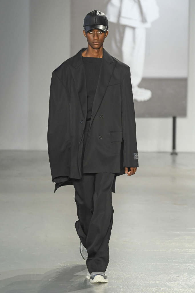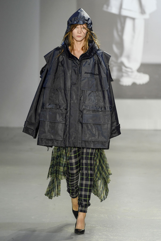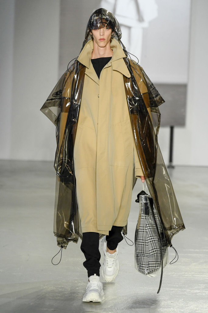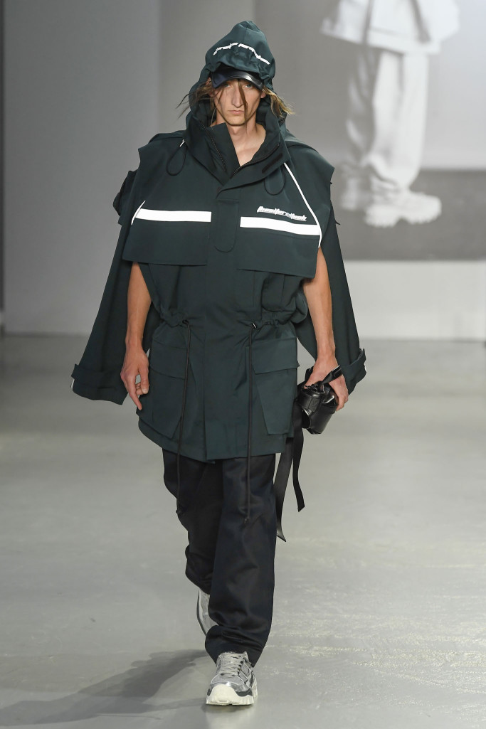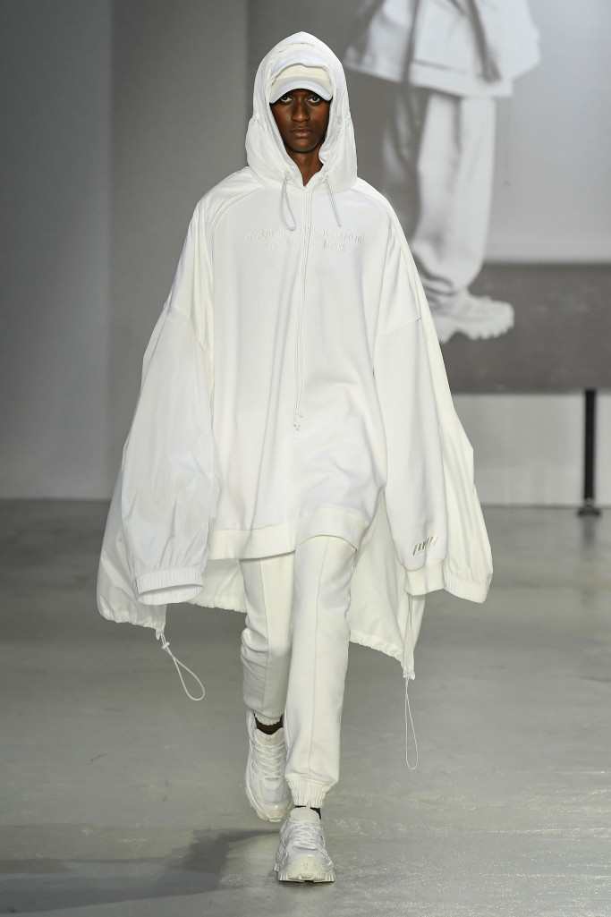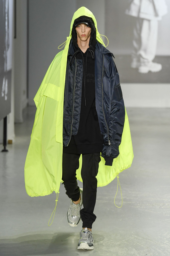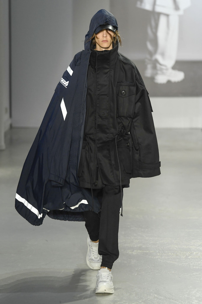 The ways Juun J transforms the sportswear into a full mix of fashionable oversized and large pieces like long rain coats, oversize capes and big really big jackets.