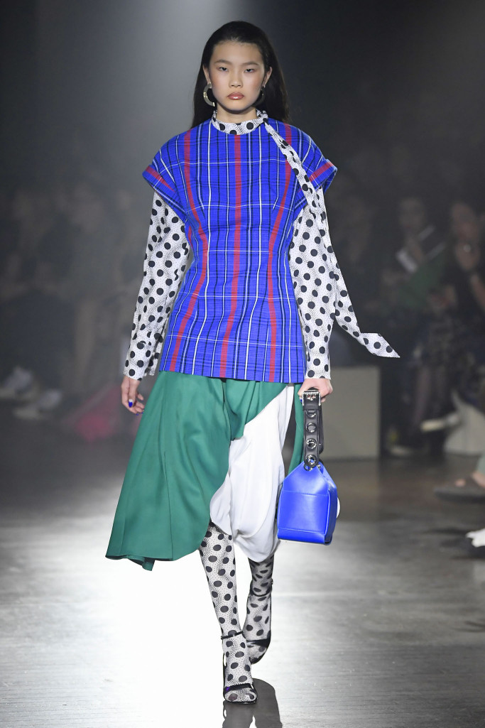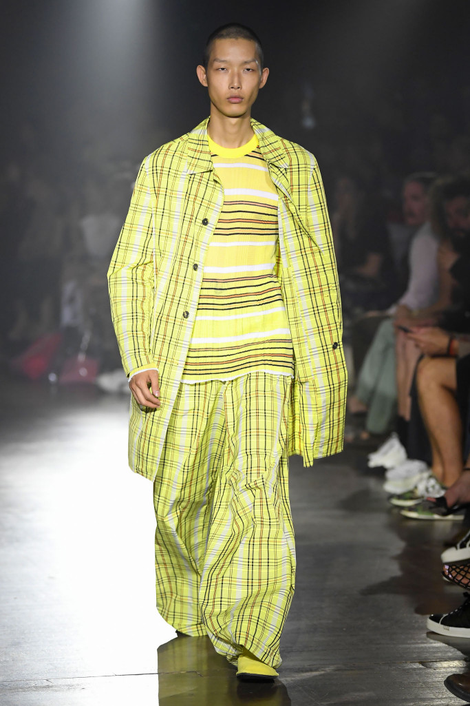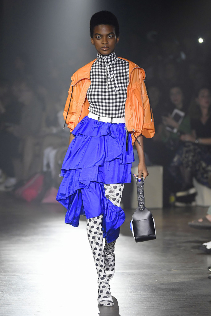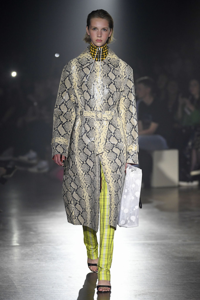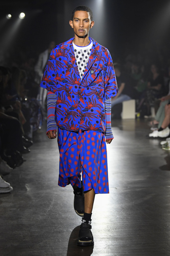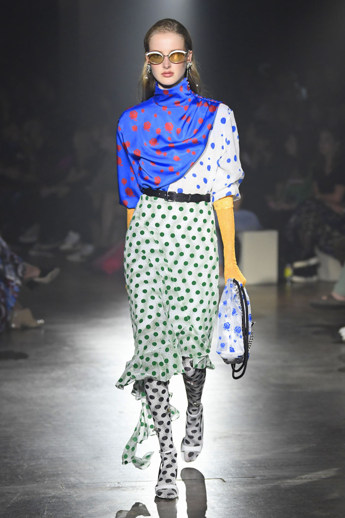 The women’s collection was a similarly rambling affair, cycling through python prints, gingham patterns and dot motifs, often all at once.