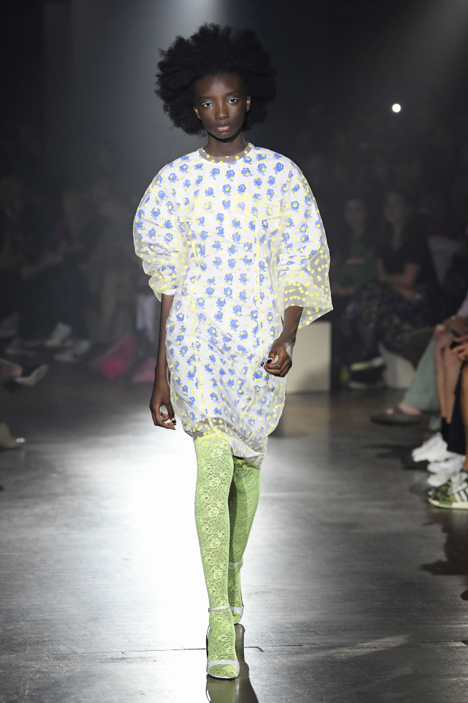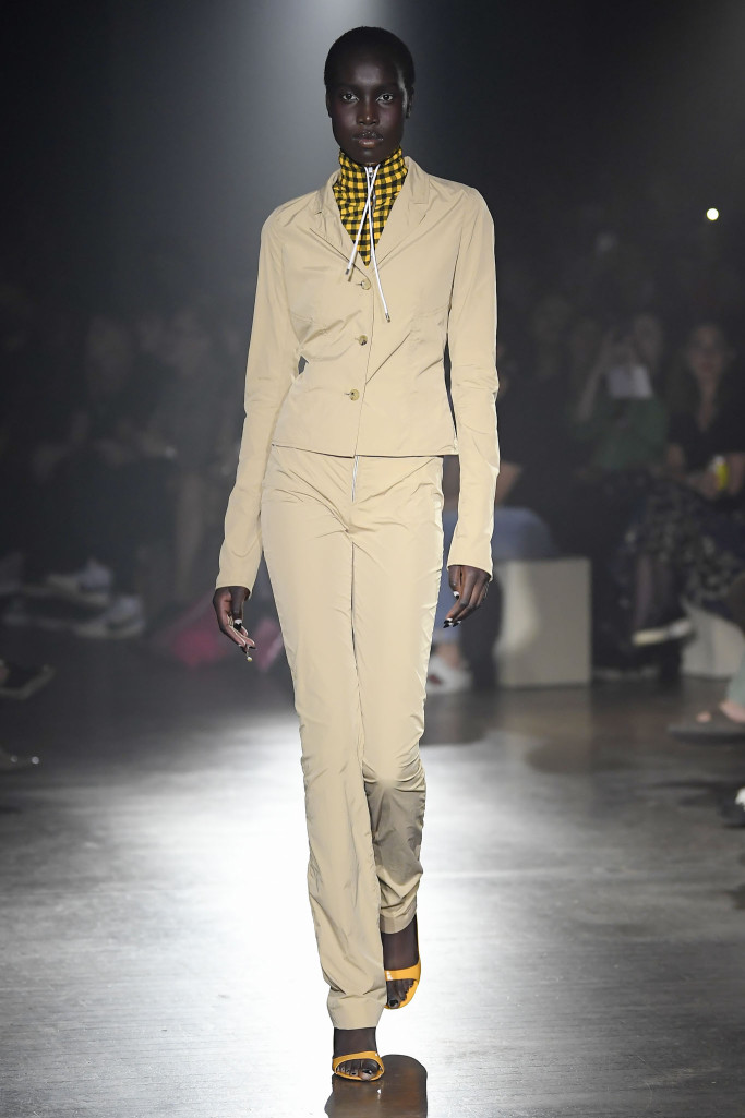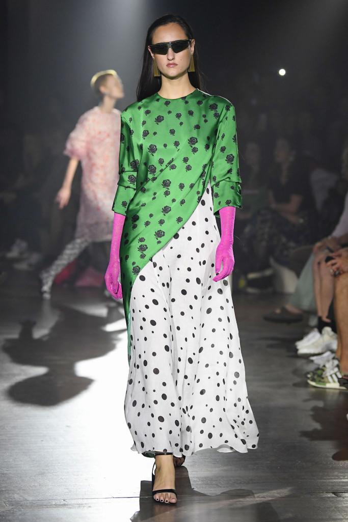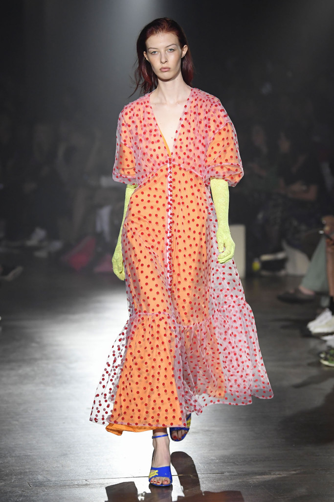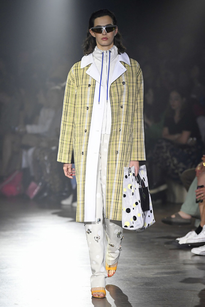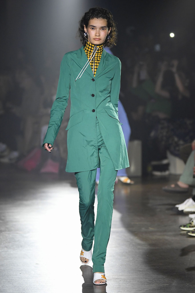 The women’s collection was a similarly rambling affair, cycling through python prints, gingham patterns and dot motifs, often all at once.
