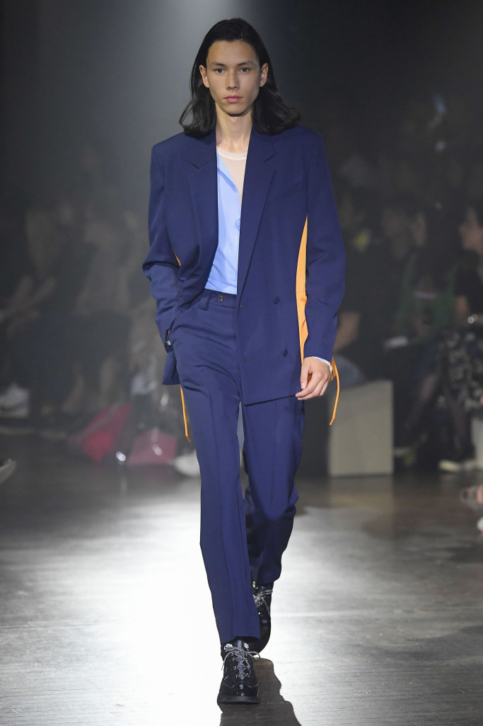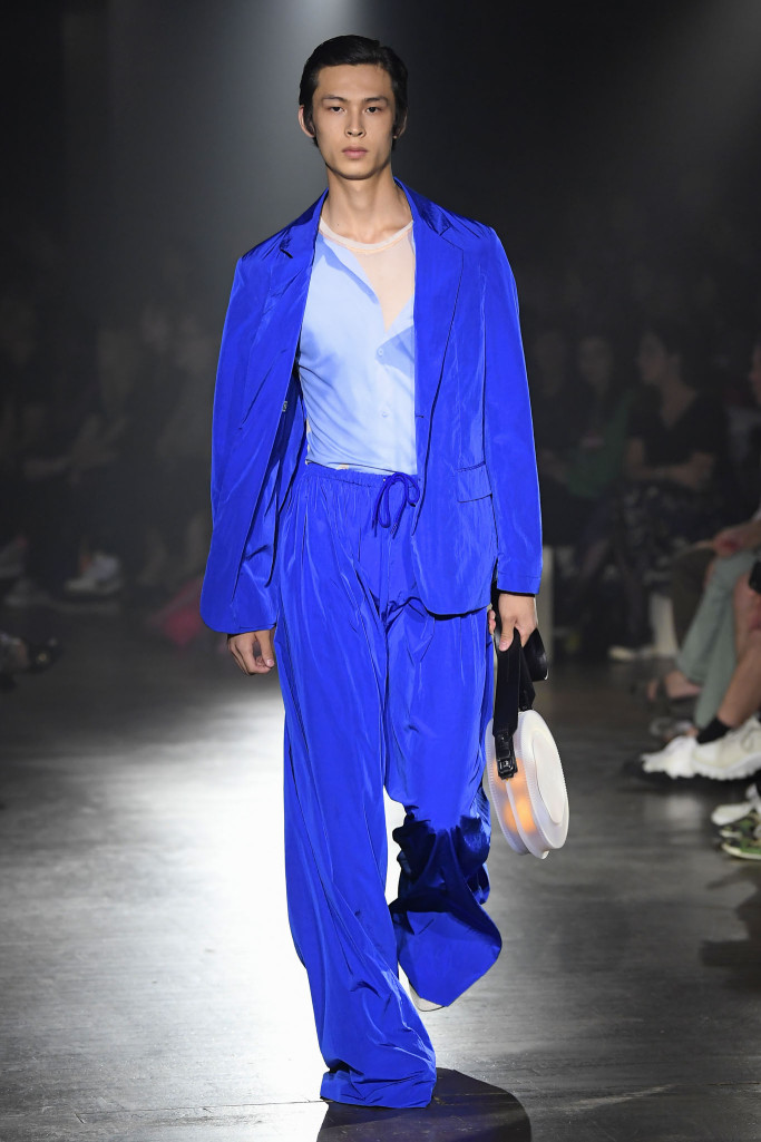A vibrant blue suit with extra-large drawstring pants was paired with a trompe-l’oeil T-shirt depicting an open shirt (another featured a flyaway tie.)