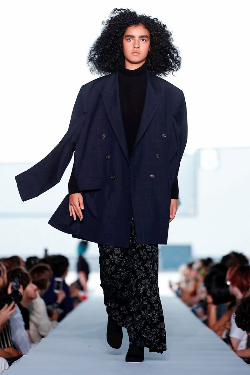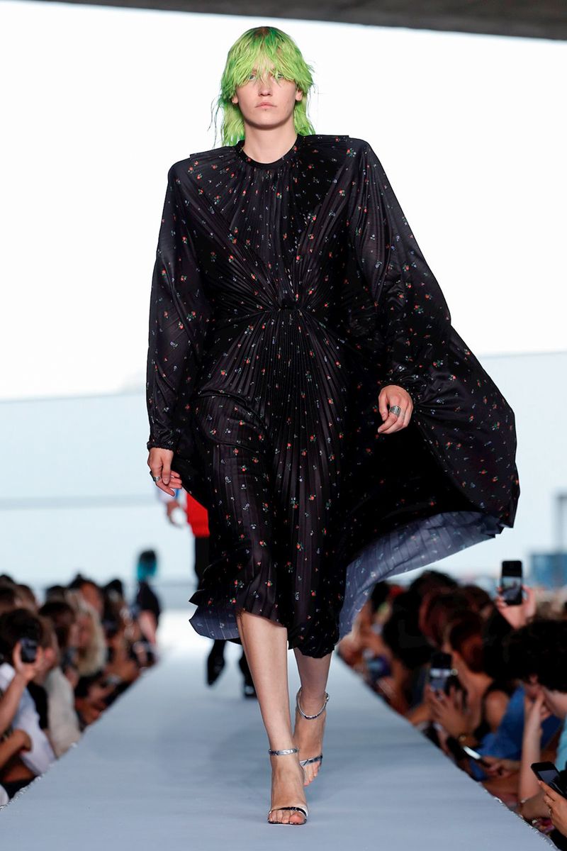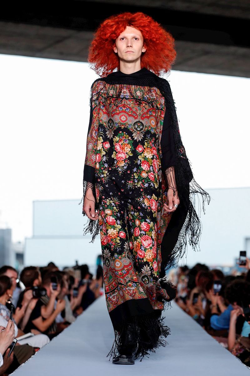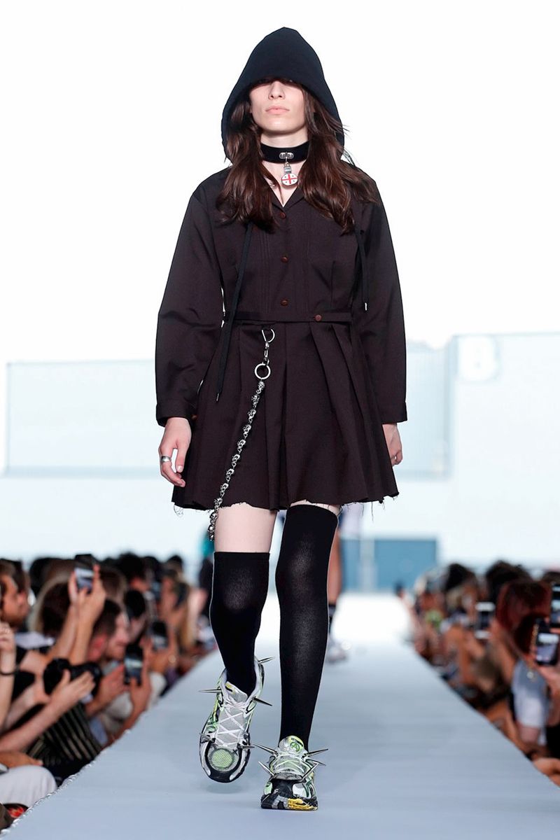 As the designer’s 10th show — Chardonnay was served at the preshow bar; Lebkuchenherzen iced gingerbread hearts served as the show invitation — the collection, with its mix of street, normcore, techno-goth and punk — including spiky Reeboks — also read like his greatest hits, with the familiar oversized jackets, pleated starburst floral dresses, fringed East European-peasant scarf looks, hoodies and reworked denim.